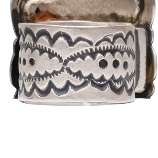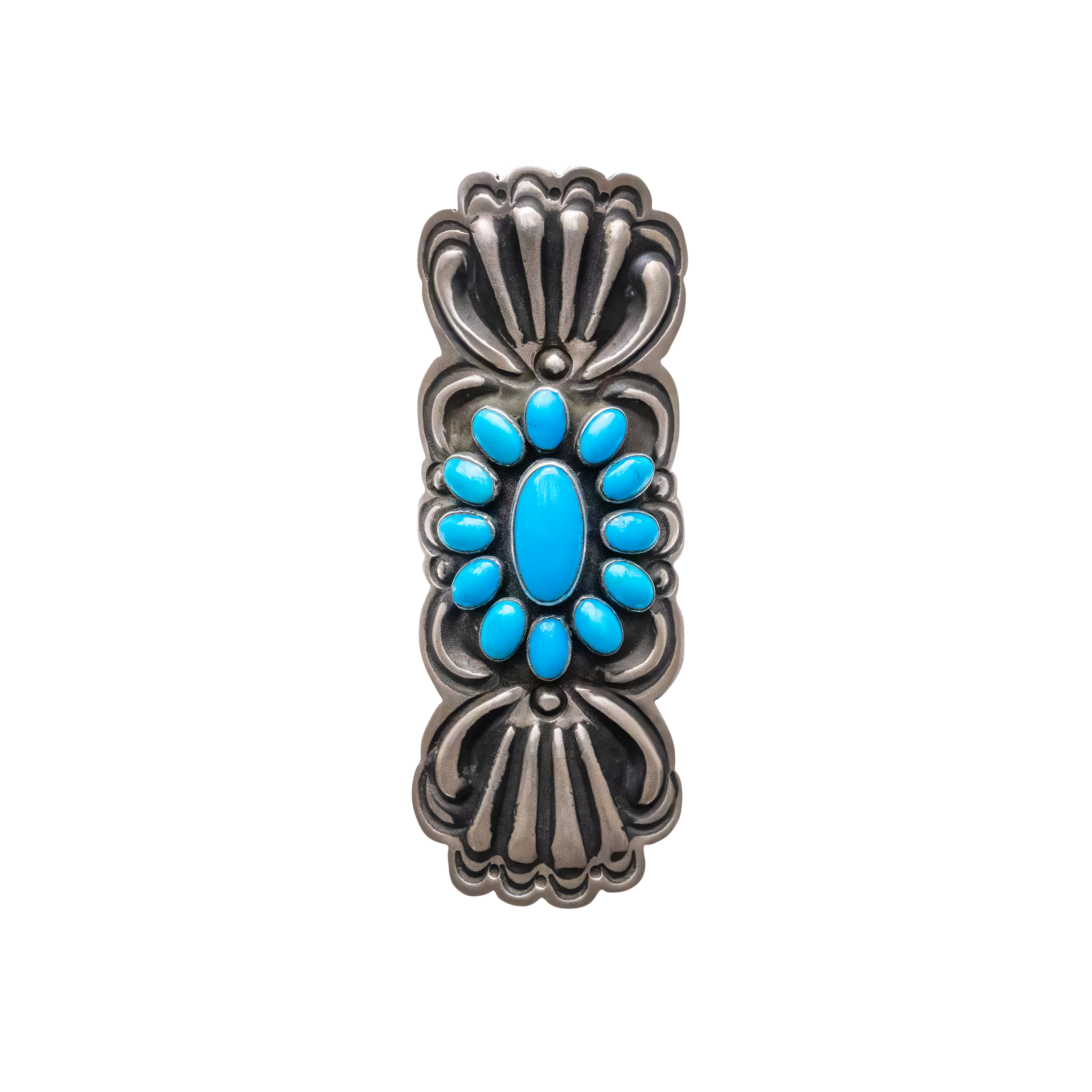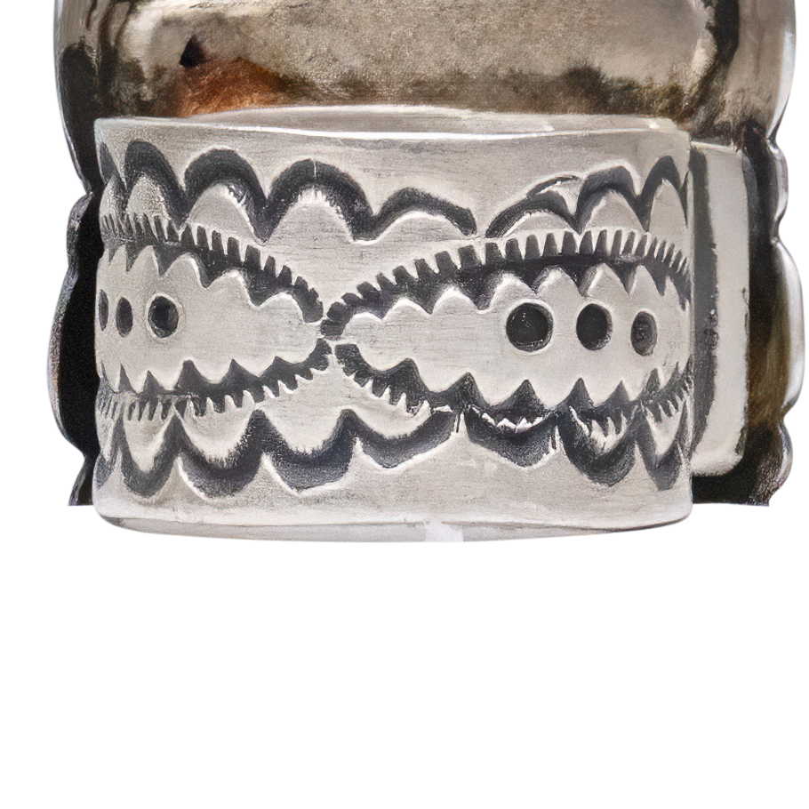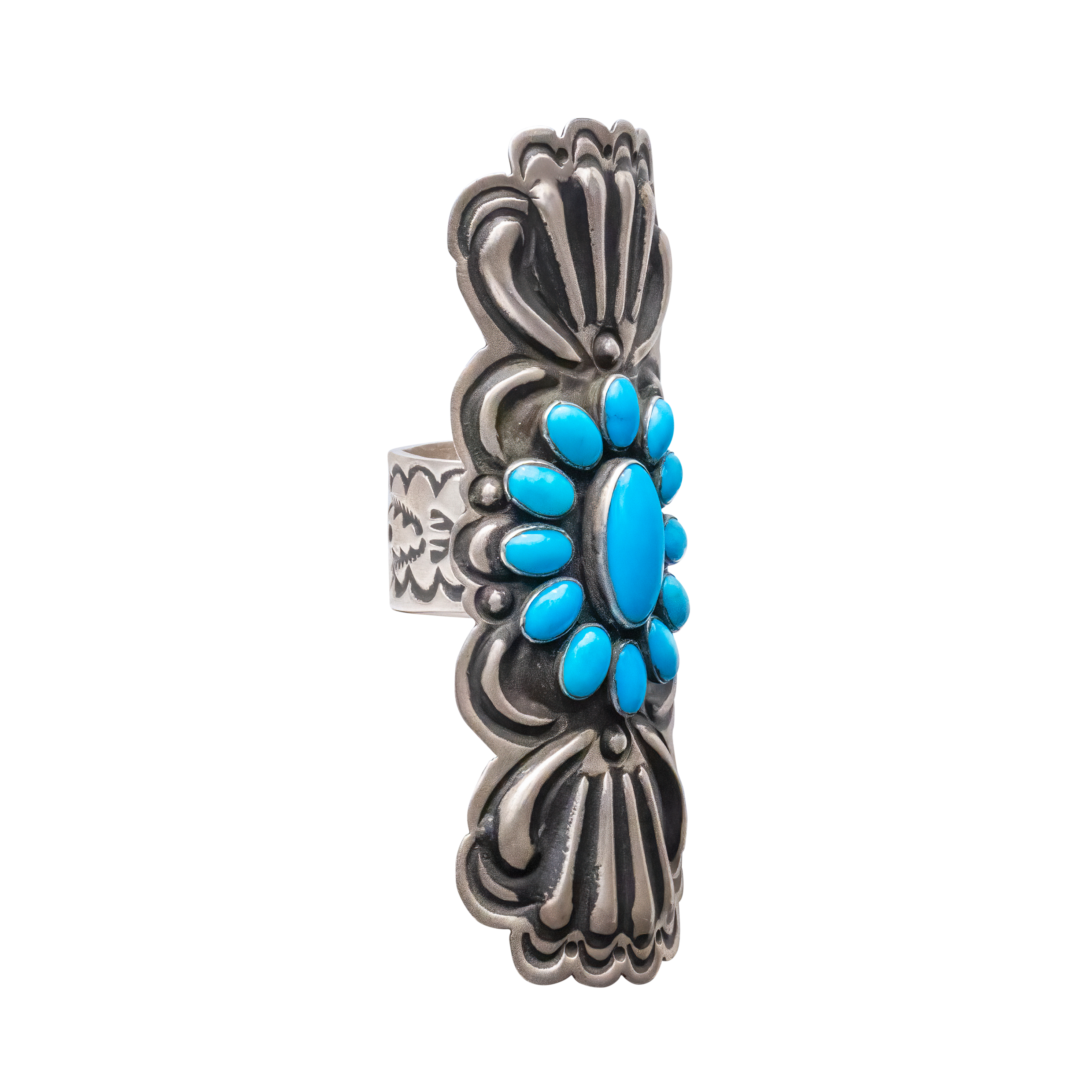 This stunning ring, handcrafted by Navajo artist Leander Tahe, features an elongated design that gives this ring a unique shape elevated by hand-stamped, repousse details. The carefully stamped designs surround a cluster of pure blue Sleeping Beauty Turquoise stones carefully set in sterling silver. With its beautiful turqouise and elegant silver-work, this ring is a eye-catcher. A hand-stamped band adds a finishing detail that helps make this ring special.