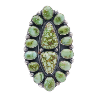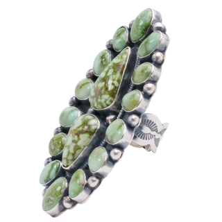 Elevate your jewelry collection with the captivating brilliance of this cluster-style statement ring by Navajo silversmith Reeda R. Begay. The stunning combination of brilliant green Sonoran turquoise gemstones creates a mesmerizing mosaic of color, evoking the lush landscapes of the Southwest. Embrace the artistry and tradition of Navajo craftsmanship with this ring, a bold and striking addition to your style that reflects the natural beauty of these exquisite gemstones.