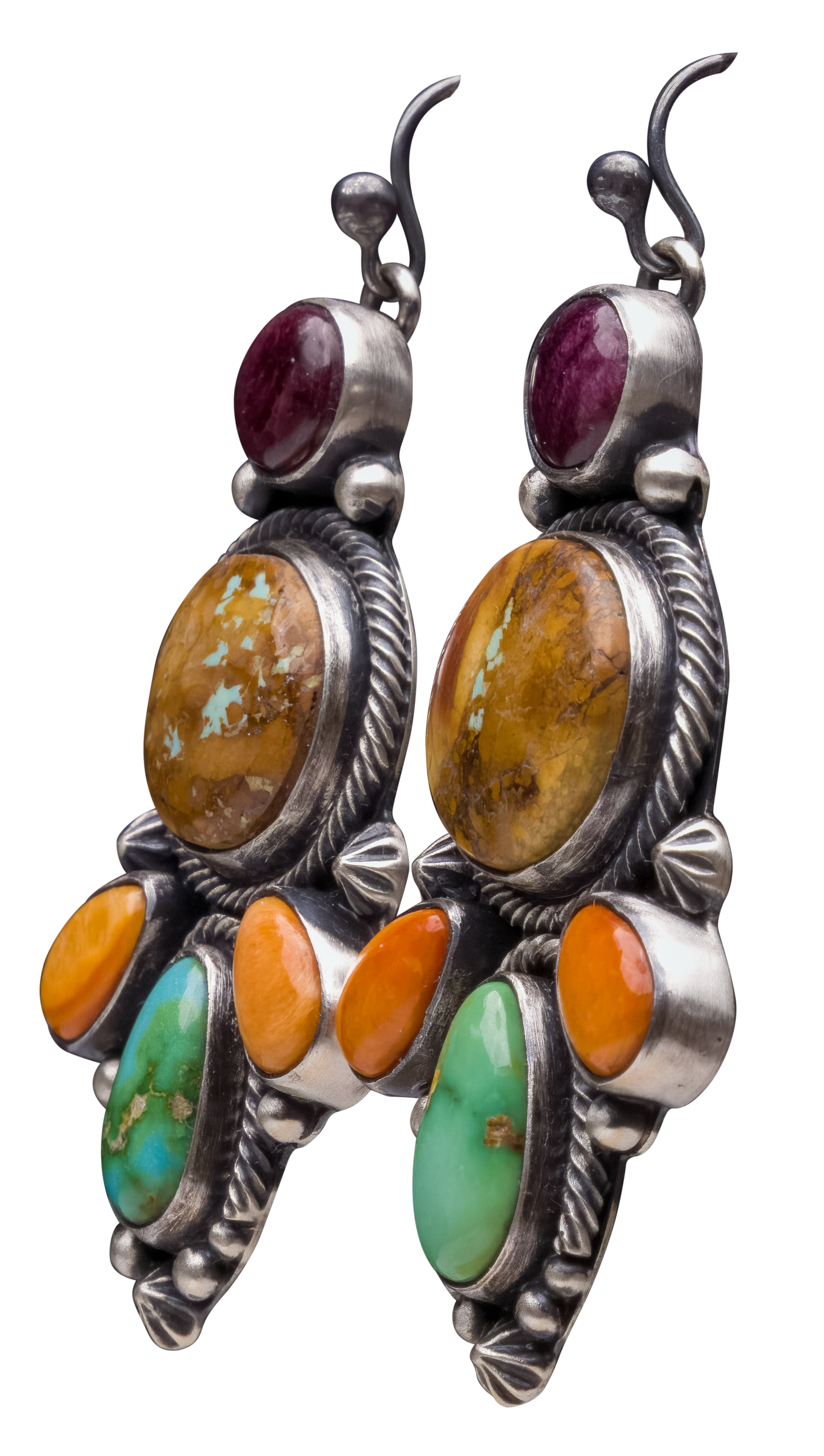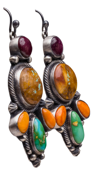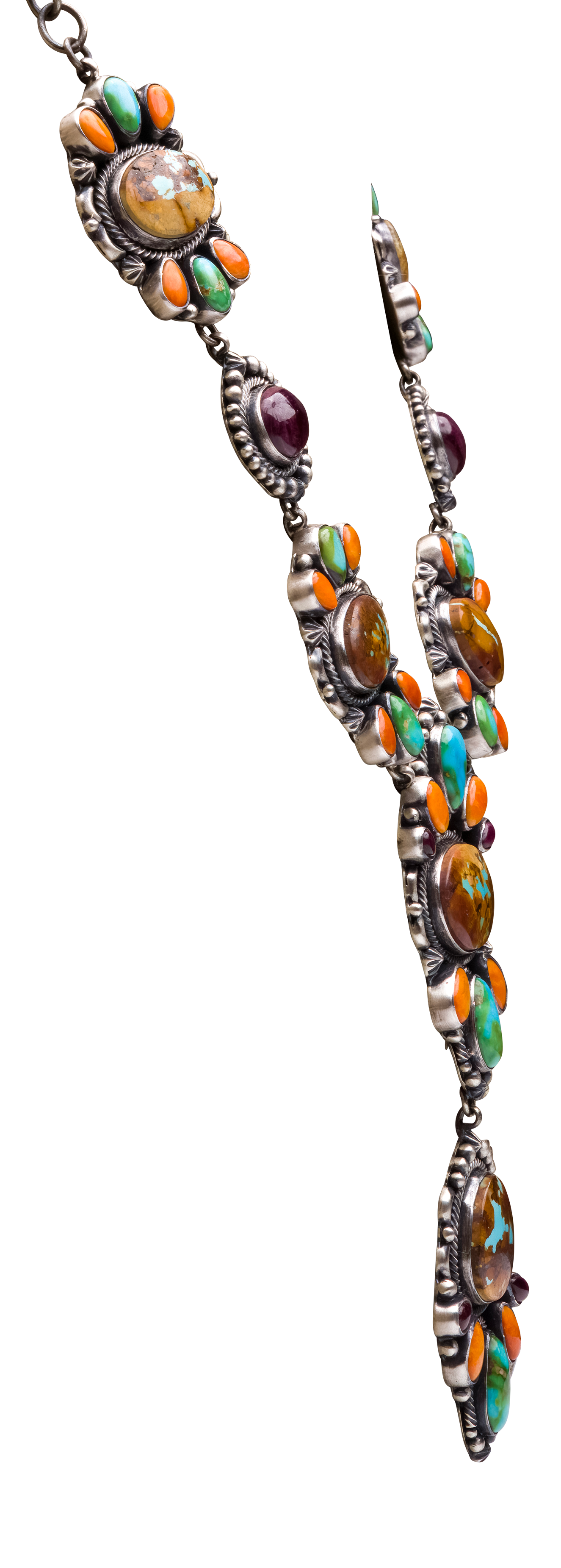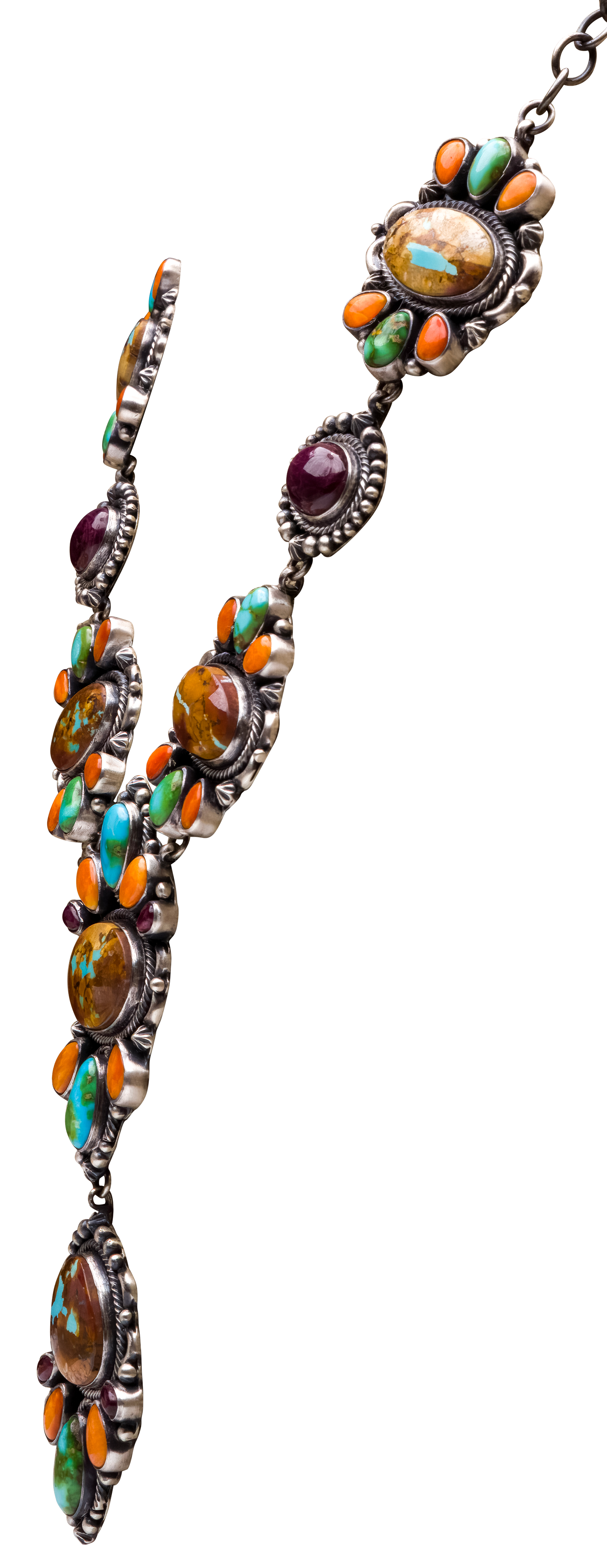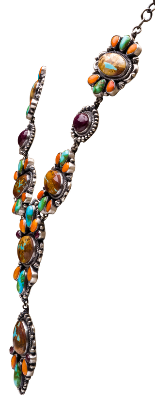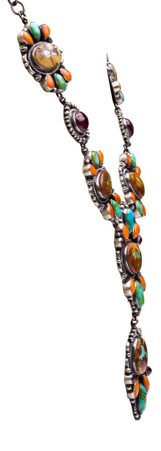 Sterling silver with spiny oyster shell, Sonoran Gold, & Boulder turquoise lariat necklace and earrings set