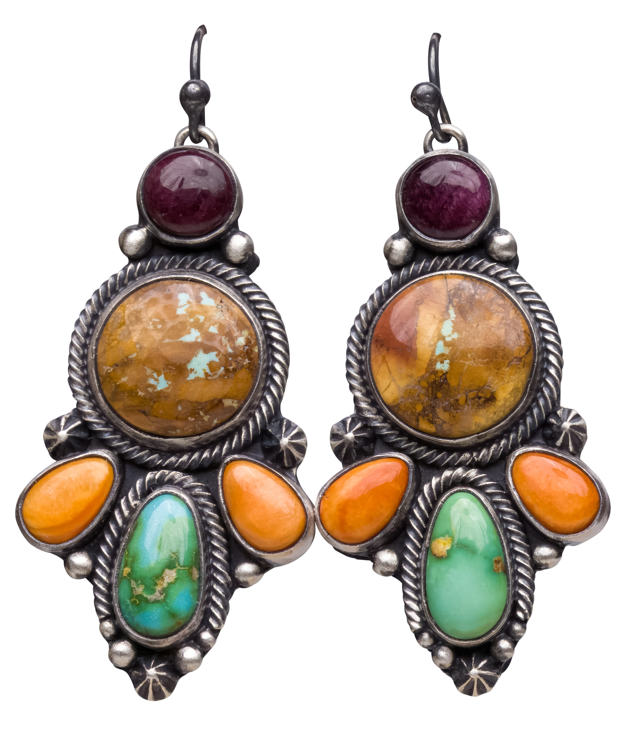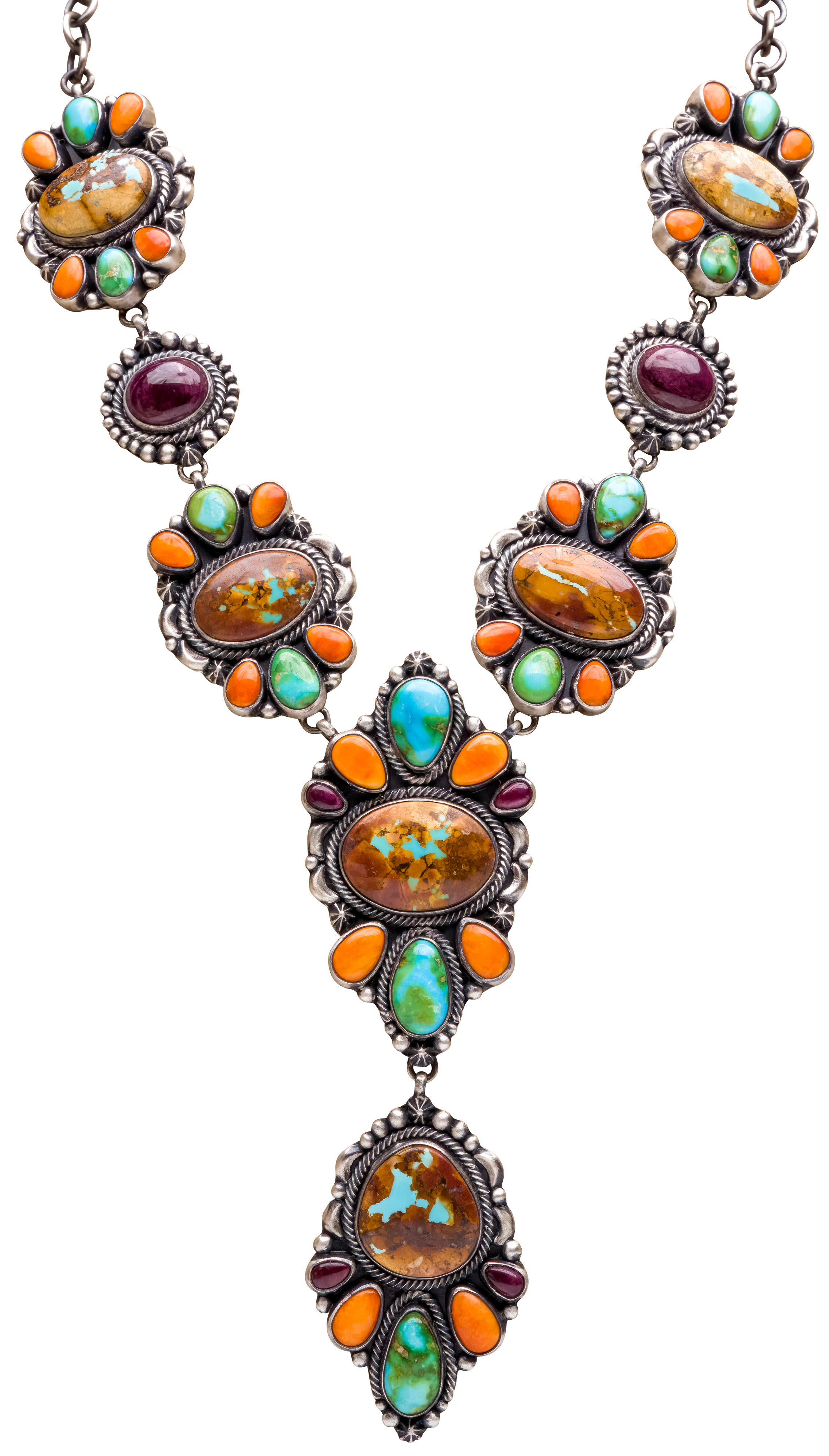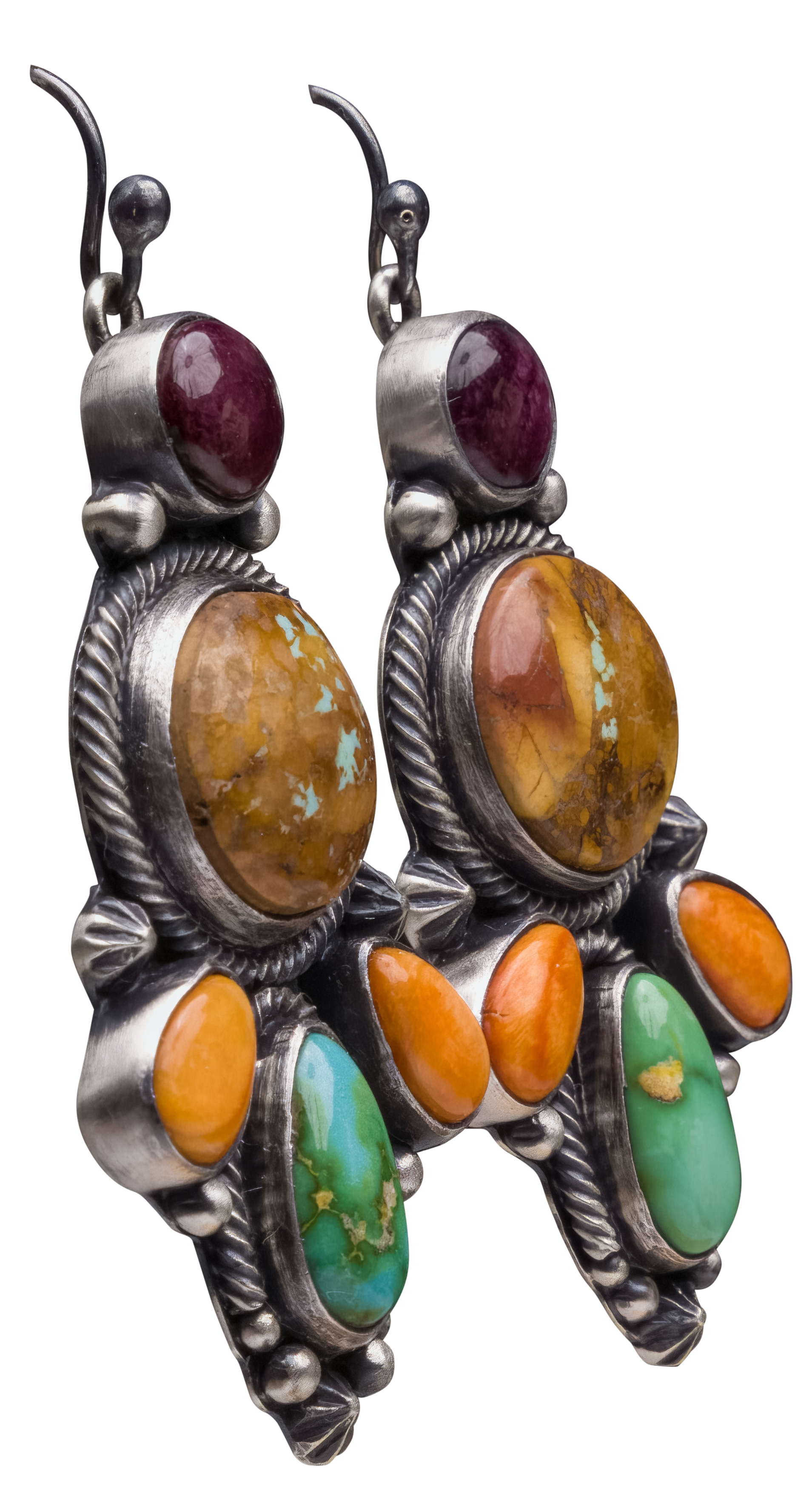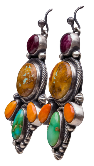 Sterling silver with spiny oyster shell, Sonoran Gold, & Boulder turquoise lariat necklace and earrings set