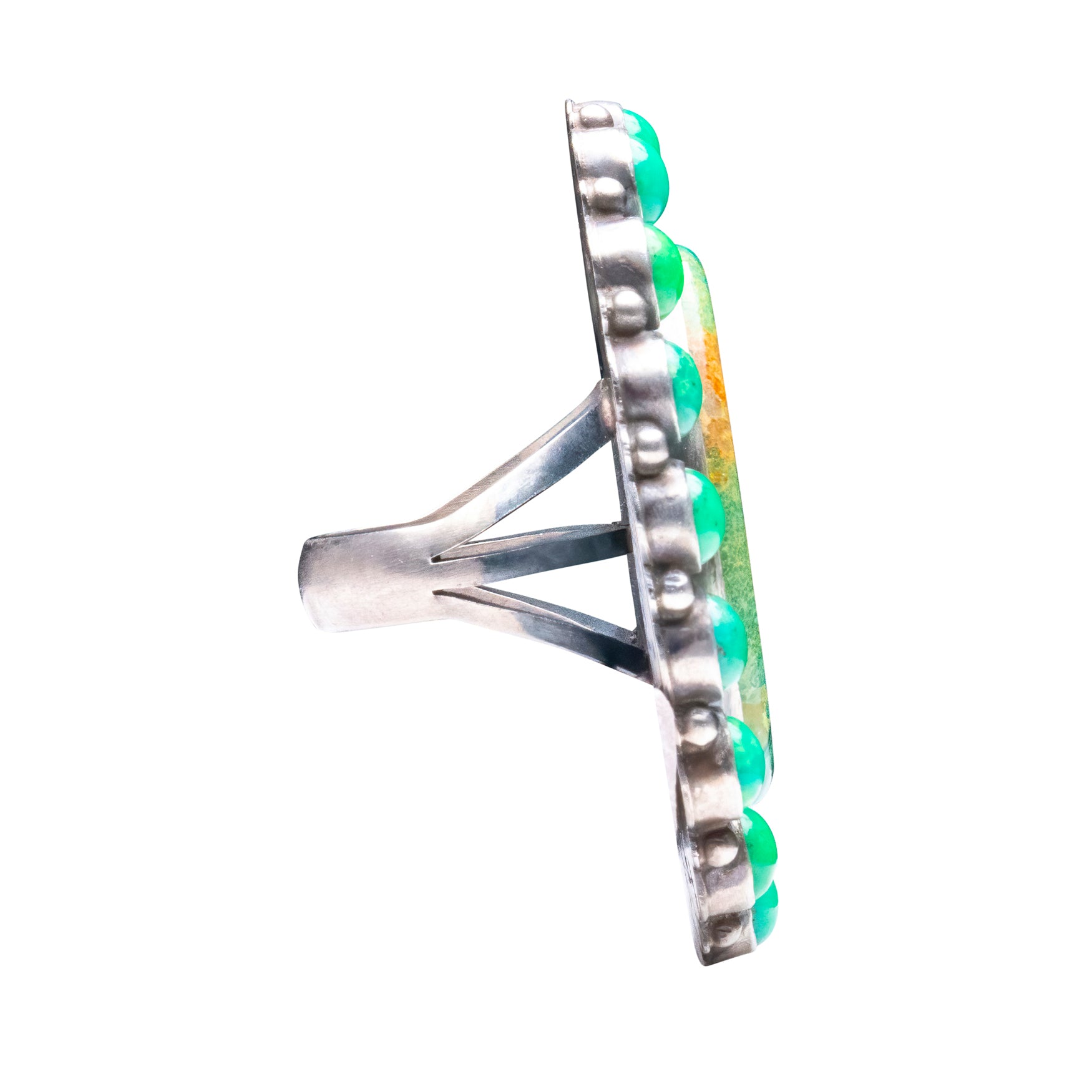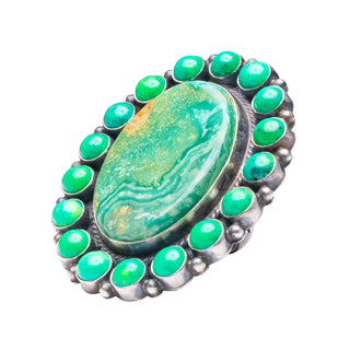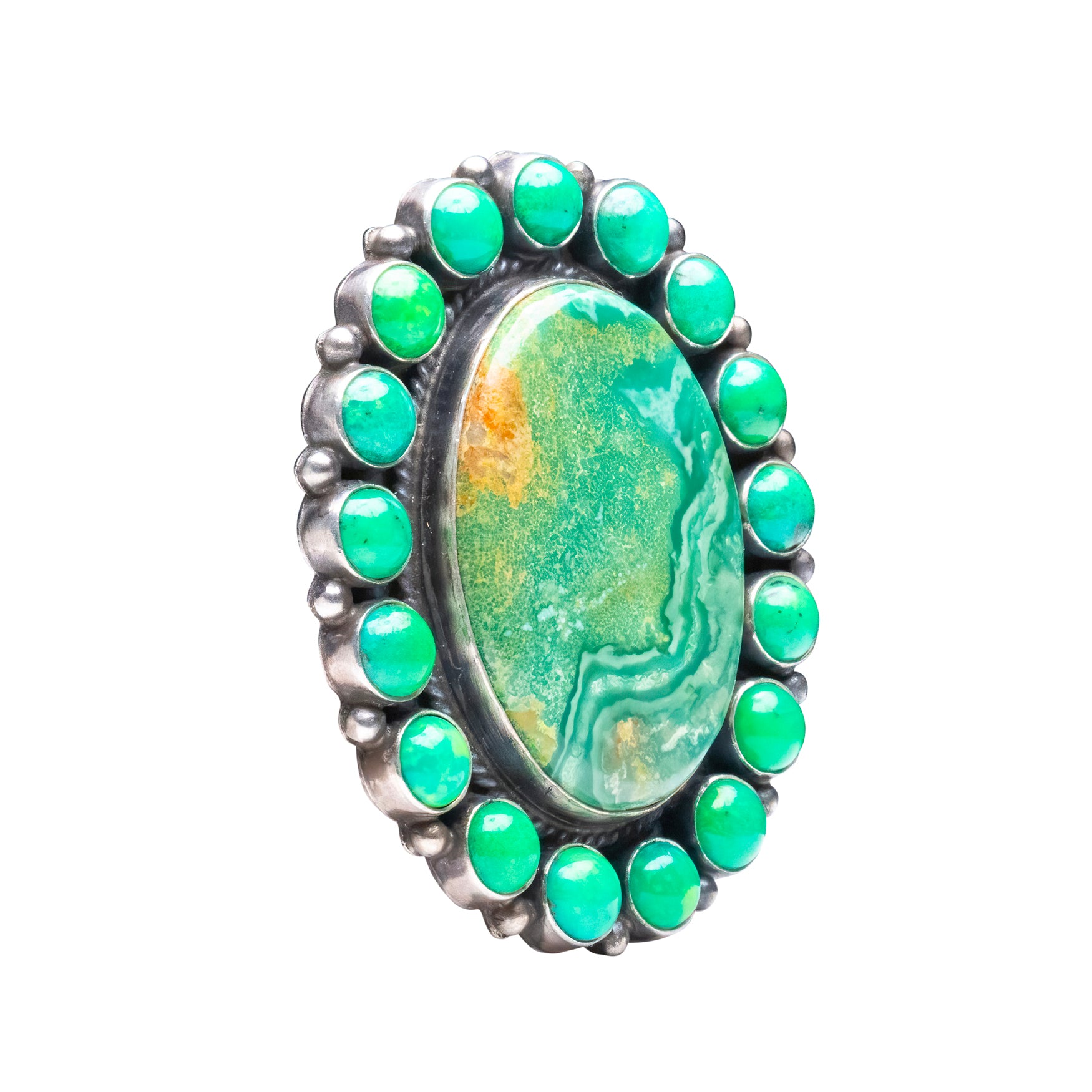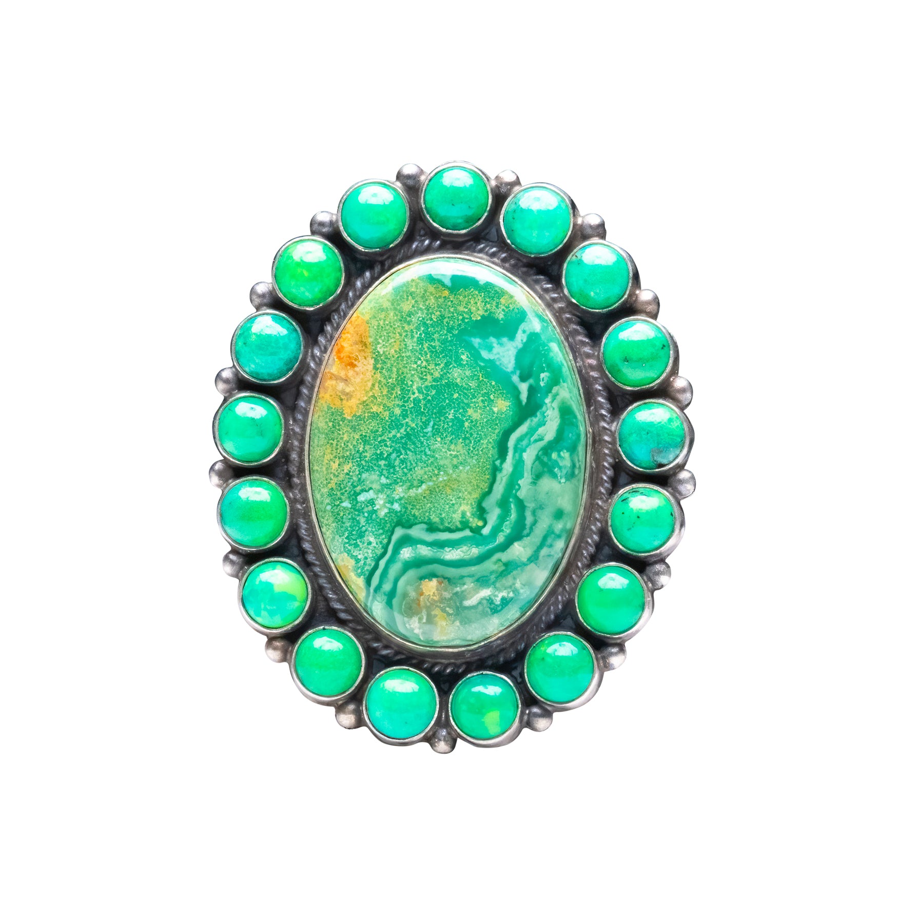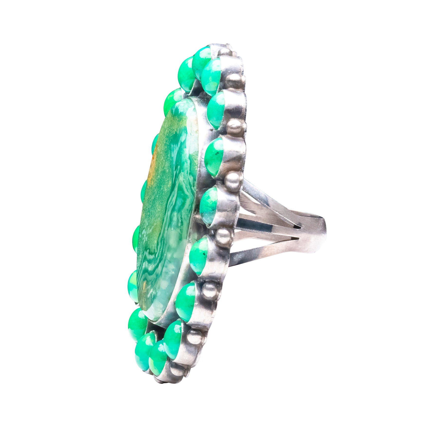 Sonoran Turquoise is the gem in this ring! Handcrafted by acclaimed artisan, Anthony Skeets, each element of this gorgeous piece of wearable art is full of Skeets' eye for balance and attention to detail. The ring's slight oblong shape draws viewers' eyes from the vibrant sterling silver that surrounds each stone towards the Sonoran Turquoise's vibrant matrix. This is truly a one-of-a-kind piece.