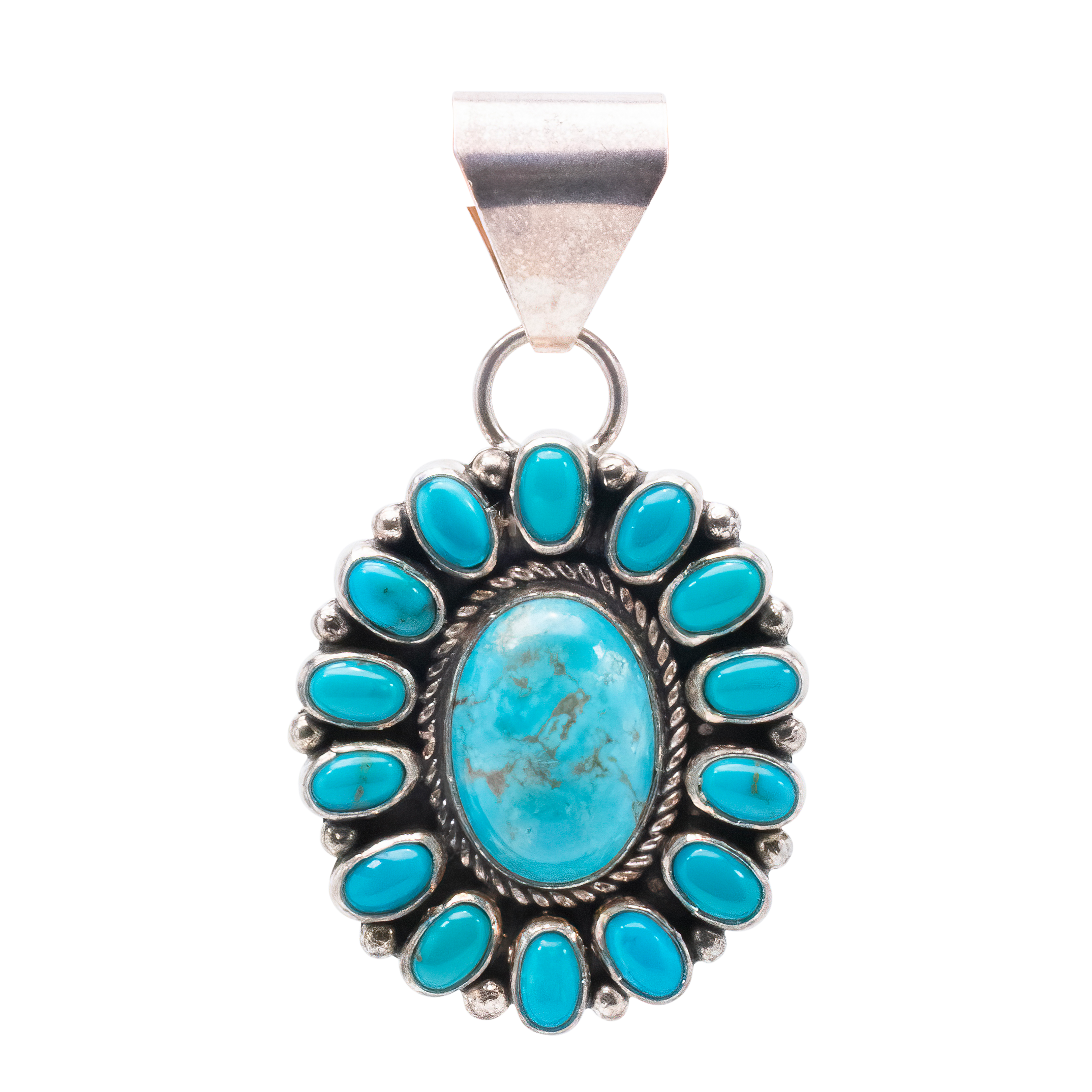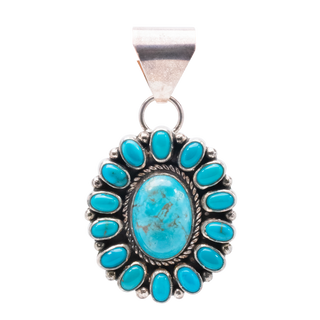 Embrace the natural beauty of Nevada Turquoise with this stunning cluster pendant by Navajo artist Erma Arviso. Sourced from the Emerald Valley Mine in southwestern Nevada, this turquoise exhibits a spectrum of shades wrapped in bright sterling silver twists and drops. This pendant not only accessorizes, it also pays homage to the rich tapestry of Navajo culture and the landscapes of the American Southwest.