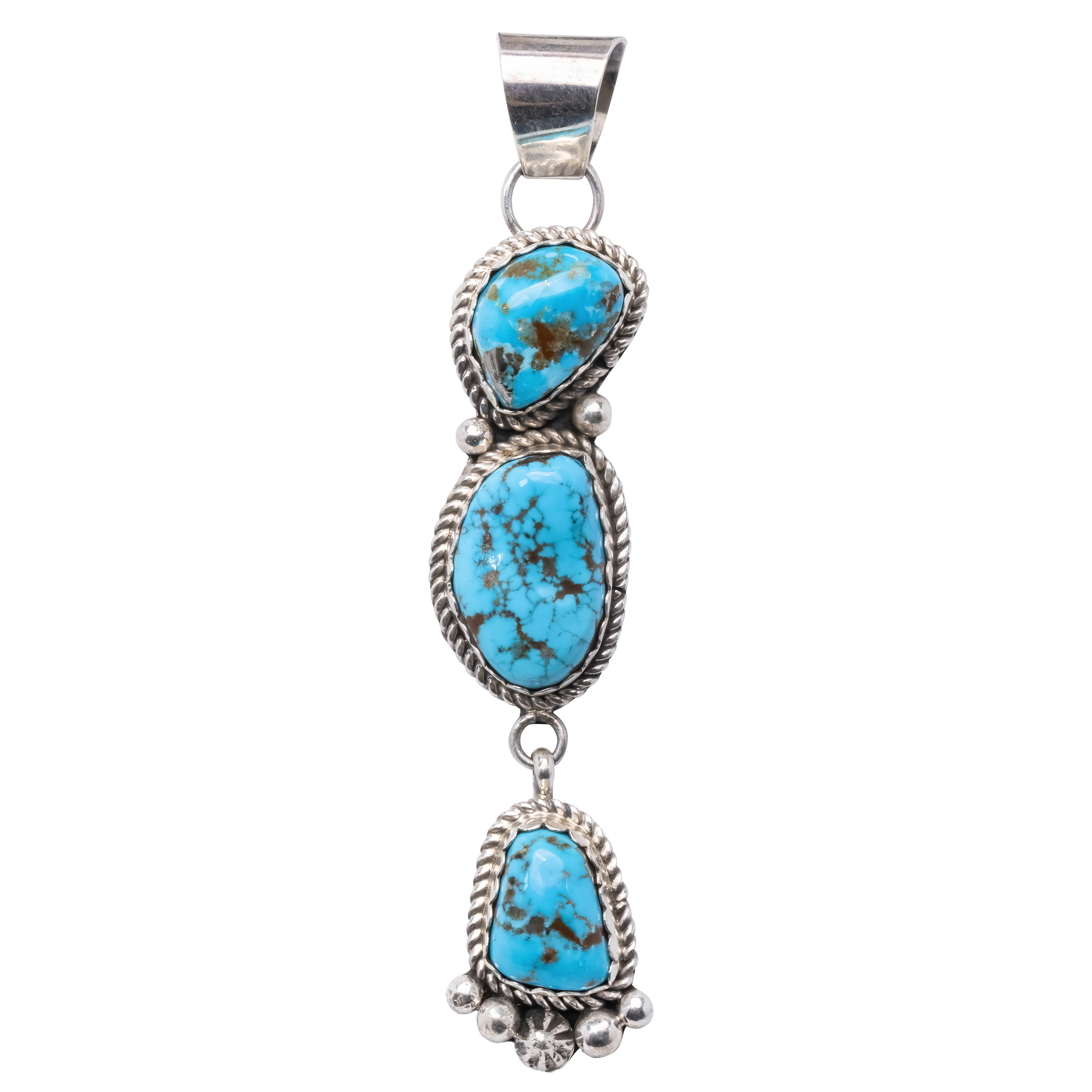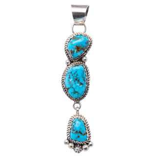 Adorn yourself with the allure of Morenci Turquoise with this exquisite pendant. Mined in Southeastern Arizona, Morenci Turquoise is celebrated for its classic "true blue" color, prized by collectors worldwide. This pendant features three stunning Morenci Turquoise stones, meticulously selected and artisan-made to showcase the beauty of this rare and highly collectible gem.