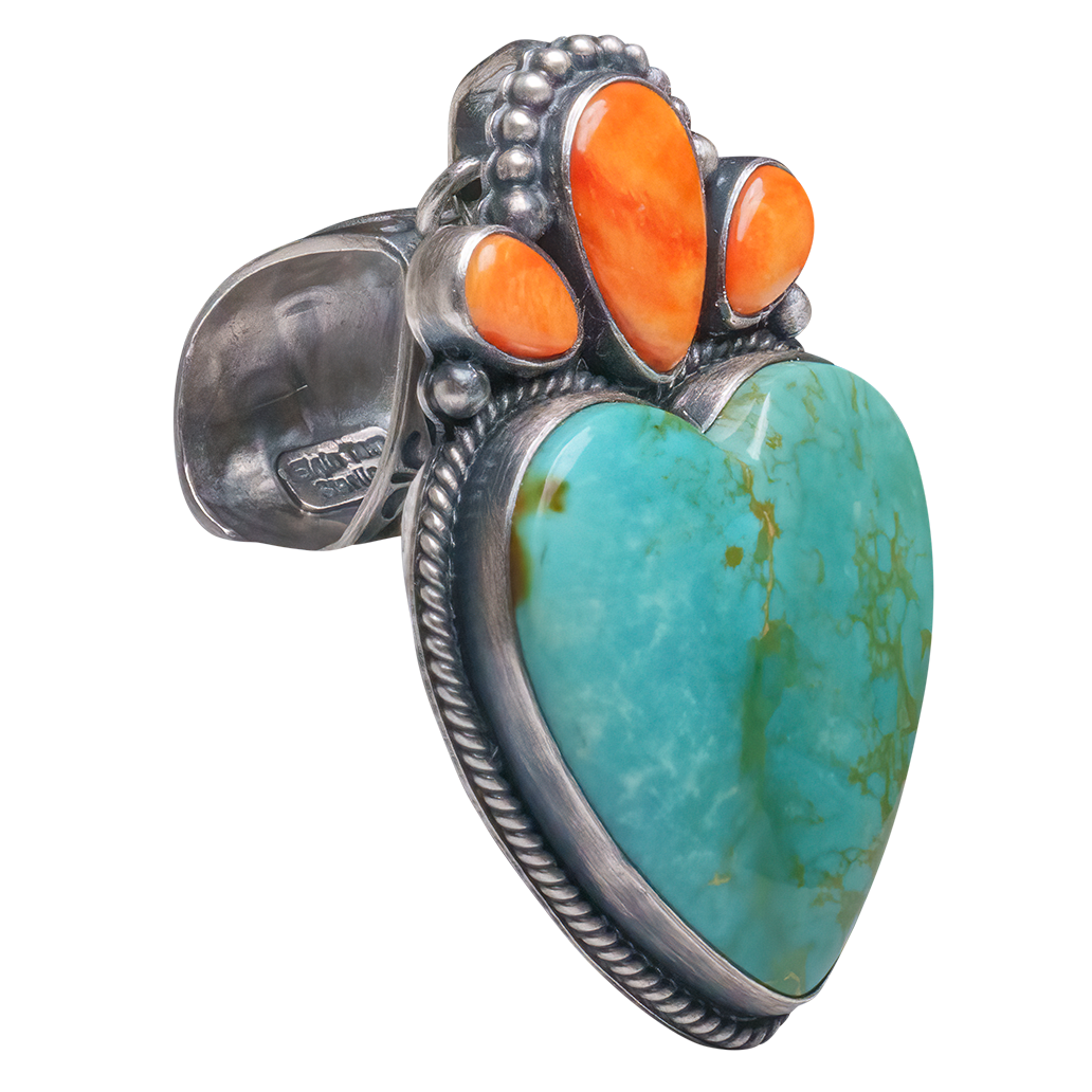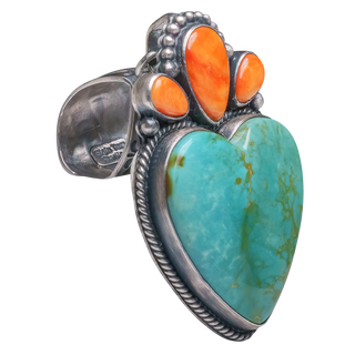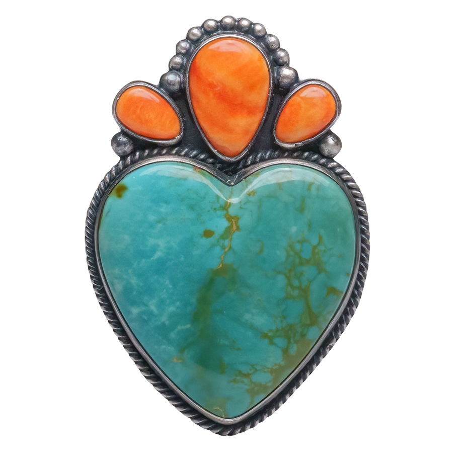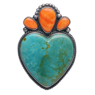 Handcrafted by acclaimed Navajo artisan, Murphy Platero, this sterling silver heart pendant features Kingman Turquoise and orange spiny oyster shell. Adorned with elegant silverwork that accents the natural beauty of the stone's intense colors, this pendant is the perfect statement-piece for any outfit. Platero's artistry, too, makes this piece a stunning addition to your collection.