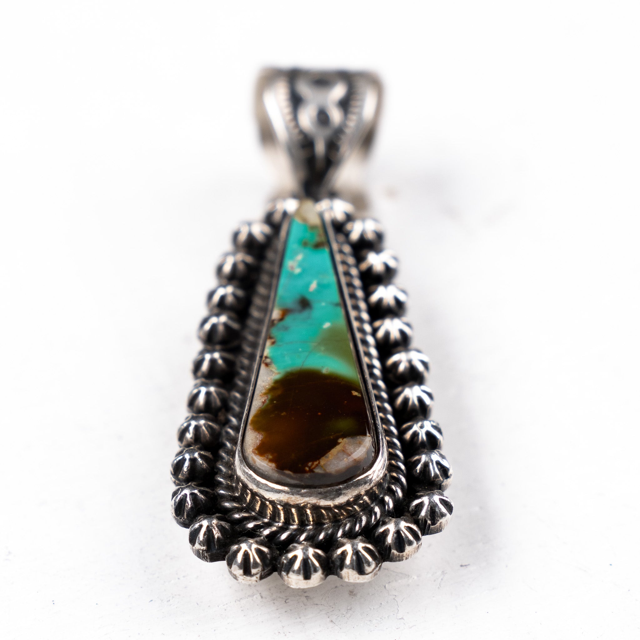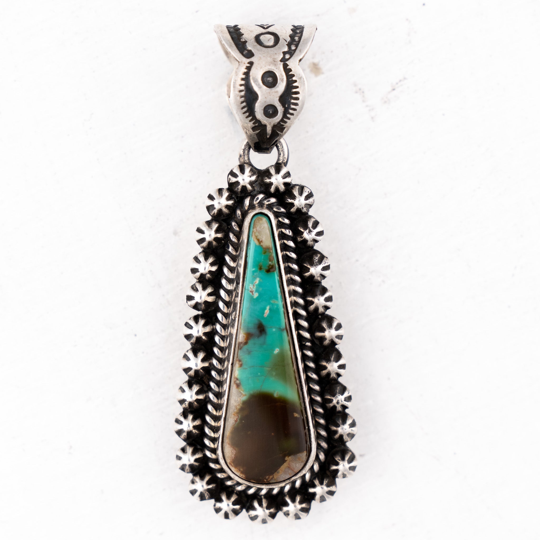 A Royston Turquoise stone shows off rich green hues and an earthy matrix in this beautiful pendant crafted by Happy Piasso. Bright sterling silver wraps around the central stone, embellished with star buttonsand a twisted wire detail. A hand-stamped bail finishes this beautiful piece.
