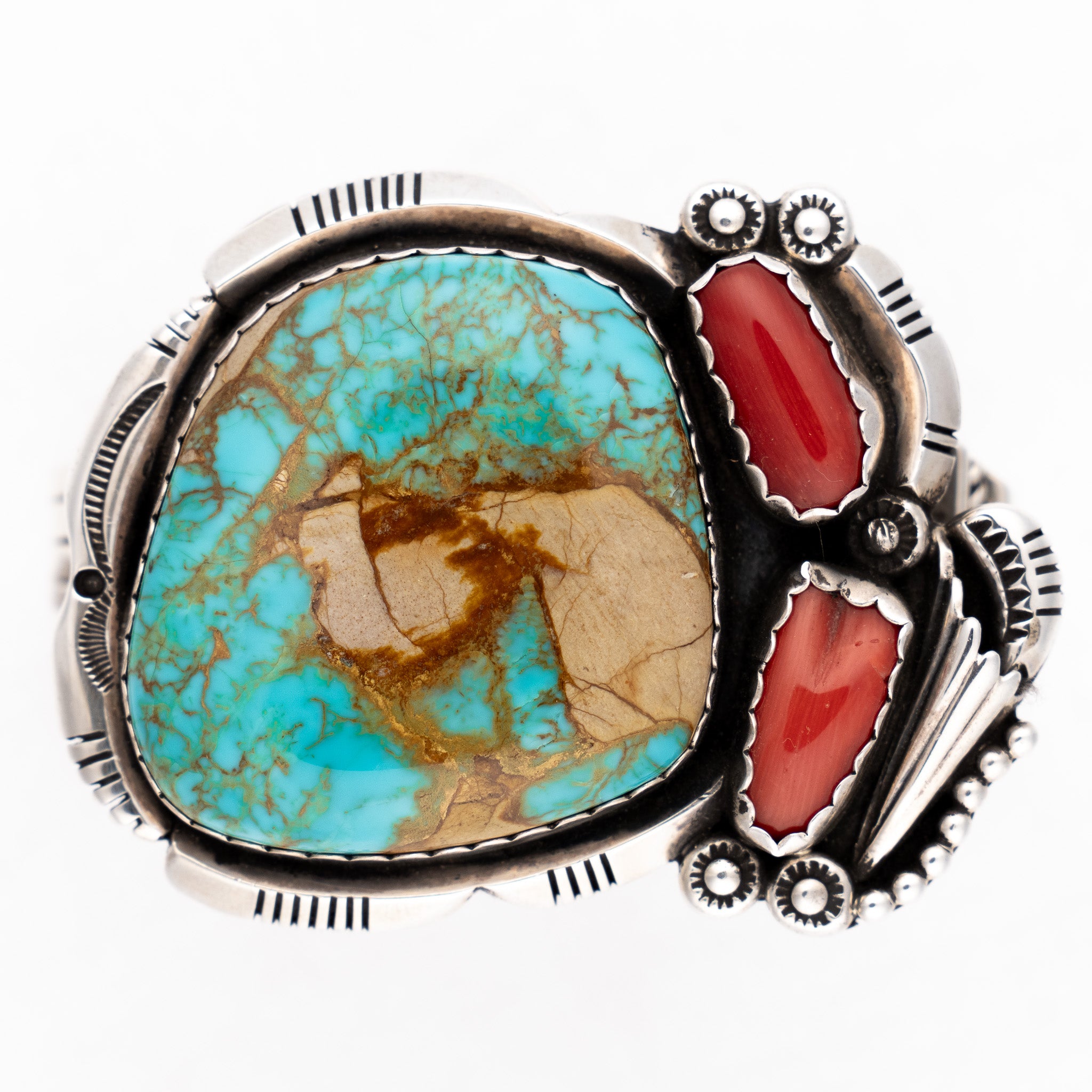 Pilot Mountain Turquoise and coral take center stage in this cuff crafted by Jolies Draper. Each stone is wrapped in sterling silver that emphasizes their vibrant colors. Embellished with snapped bezels, hand-stamped designs, file-work, and modern applique work, this stunning cuff is truly one-of-a-kind.
