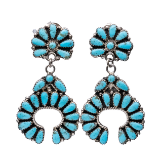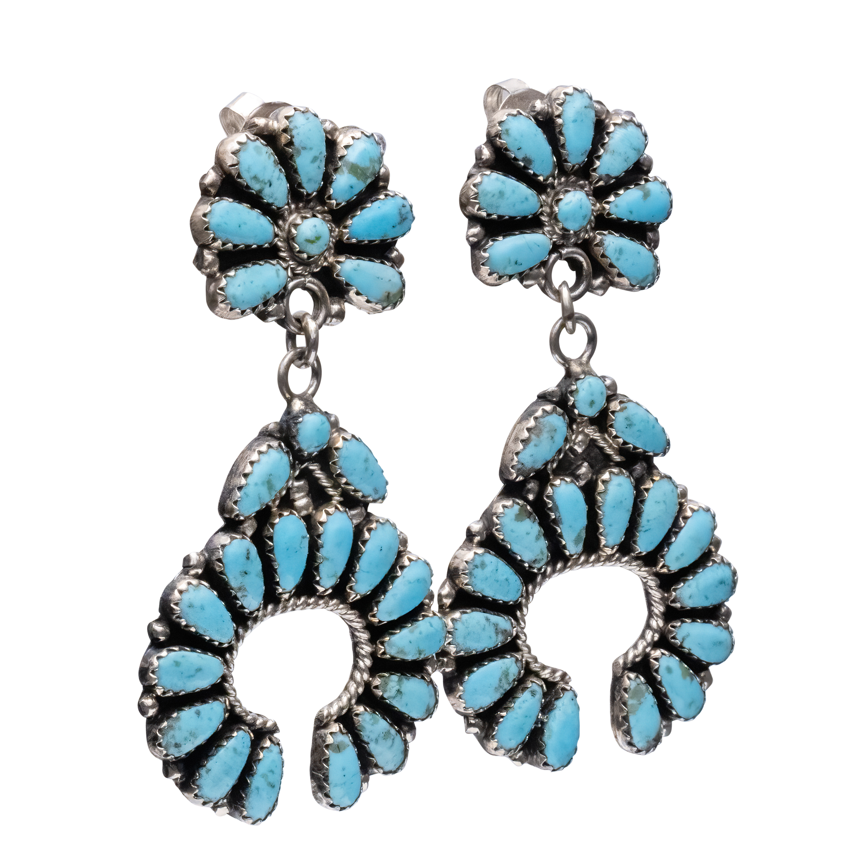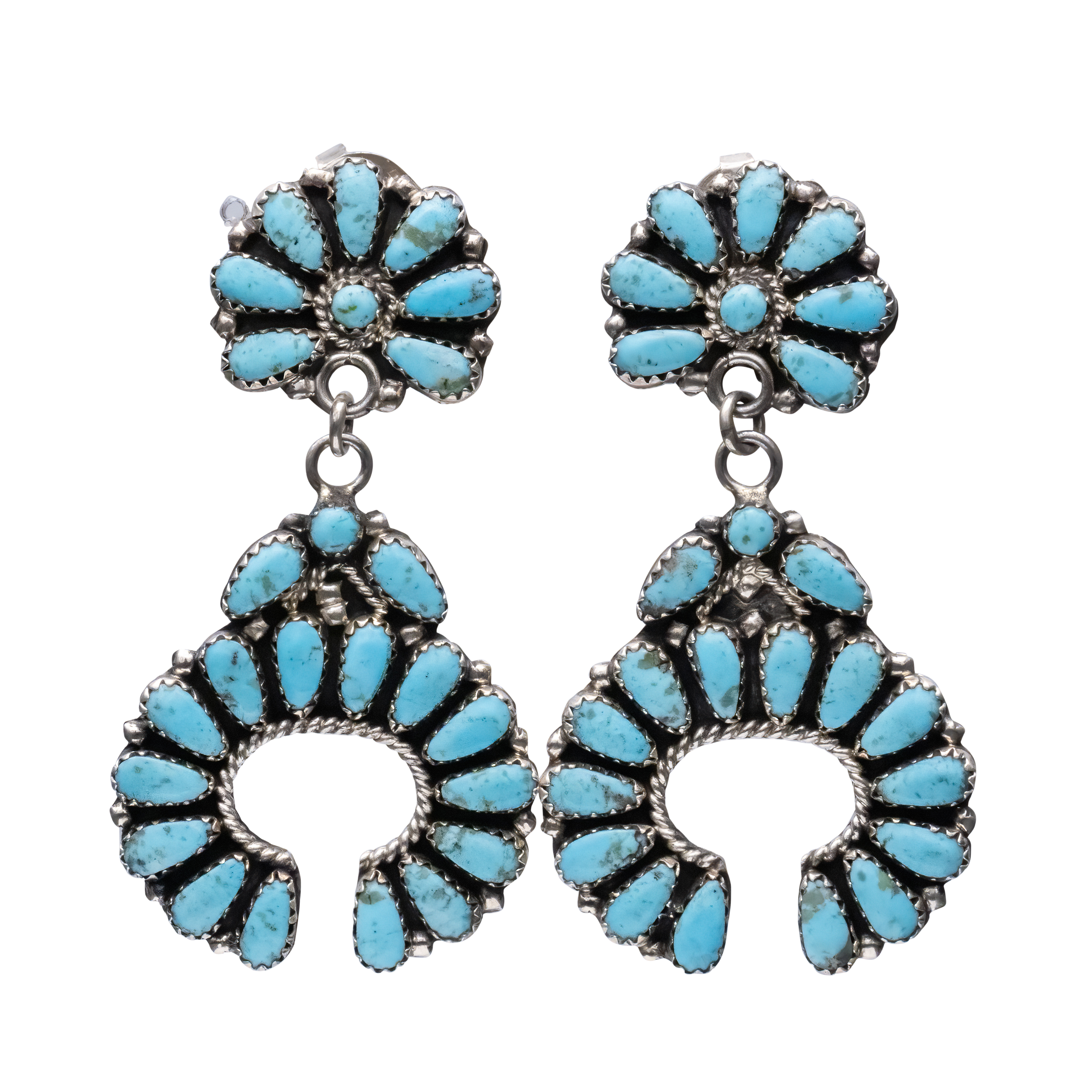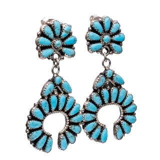 Enhance your jewelry collection with these breathtaking cluster style earrings by Navajo artist Zeta Begay, featuring vibrant Kingman Turquoise. Each earring showcases a symmetrical array of meticulously set turquoise stones, celebrated for their stunning sky-blue color and delicate matrix lines. The turquoise clusters are arranged in a traditional floral pattern, giving the earrings a timeless and elegant appeal. Crafted with precision, these earrings hang gracefully, adding a touch of sophistication to any look. These earrings connect the wearer with the rich cultural heritage of the Navajo people while providing a chic and stylish accessory perfect for special occasions or daily wear.
