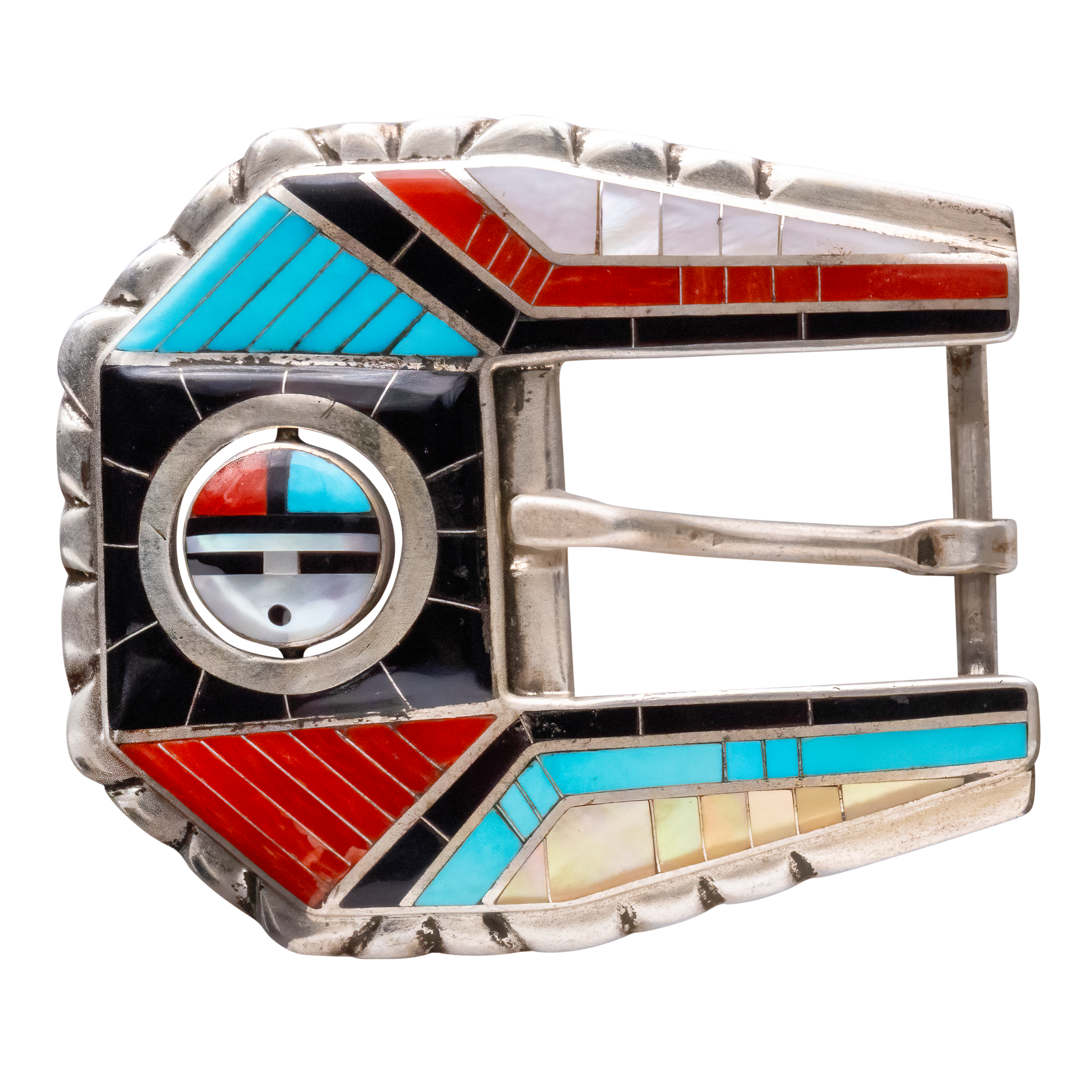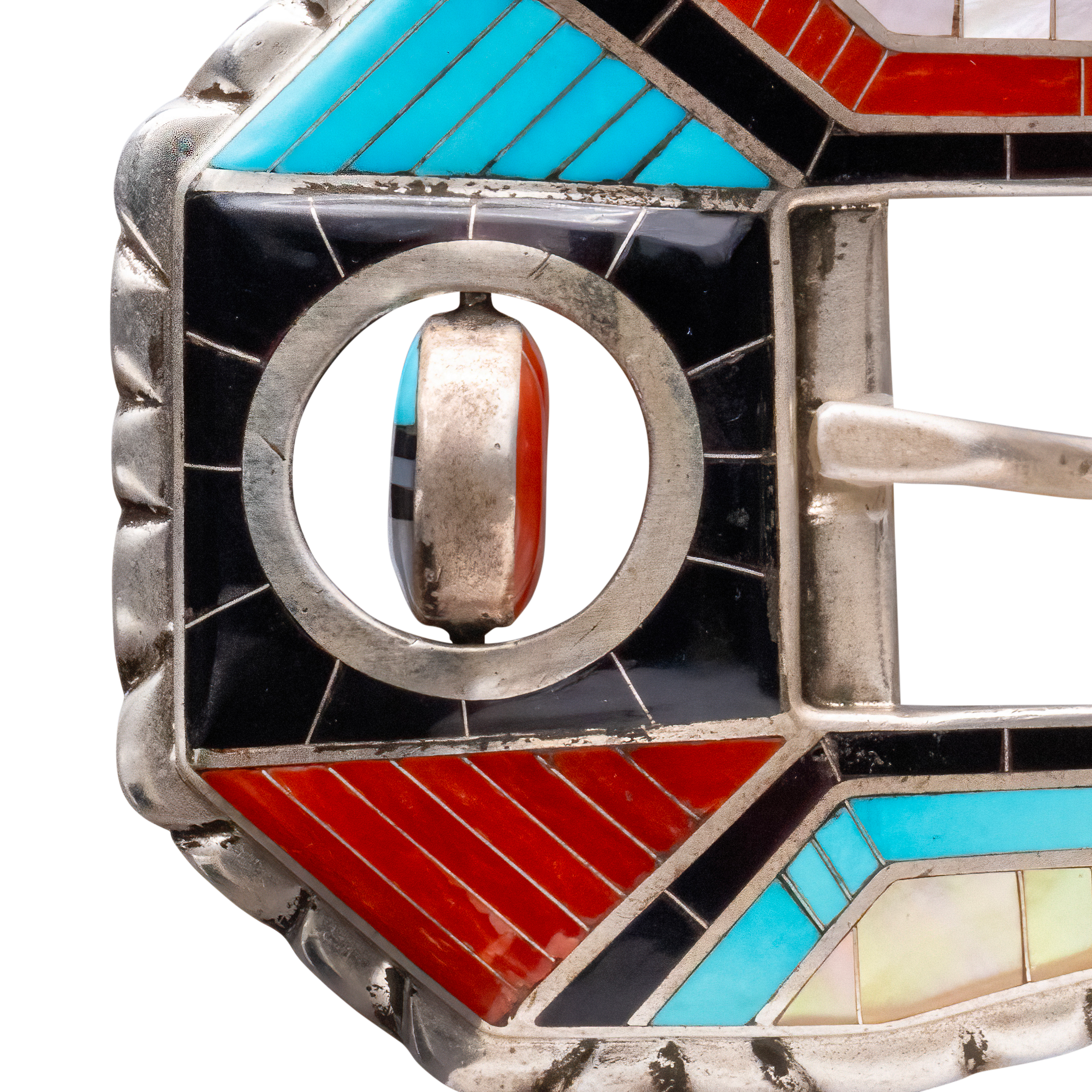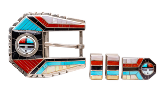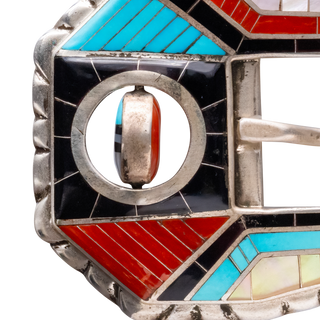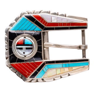 This belt buckle set, handcrafted by accomplished artist Don Dewa, features traditional Zuni inlay work and vibrant colors that showcase the earth's geologic beauty and Dewa's skill as as artisan. Utilizing stones of Sleeping Beauty Turquoise, Coral, Jett, and Mother of Pearl, this buckle's complementary colors make a stunning composition. A rotating sun-face sits in the center piece of the buckle, perfectly placed to draw the eye--a small but extraordinary detail. This set's exemplary construction, traditional deigns, and eye-catching colors make it unforgettable.