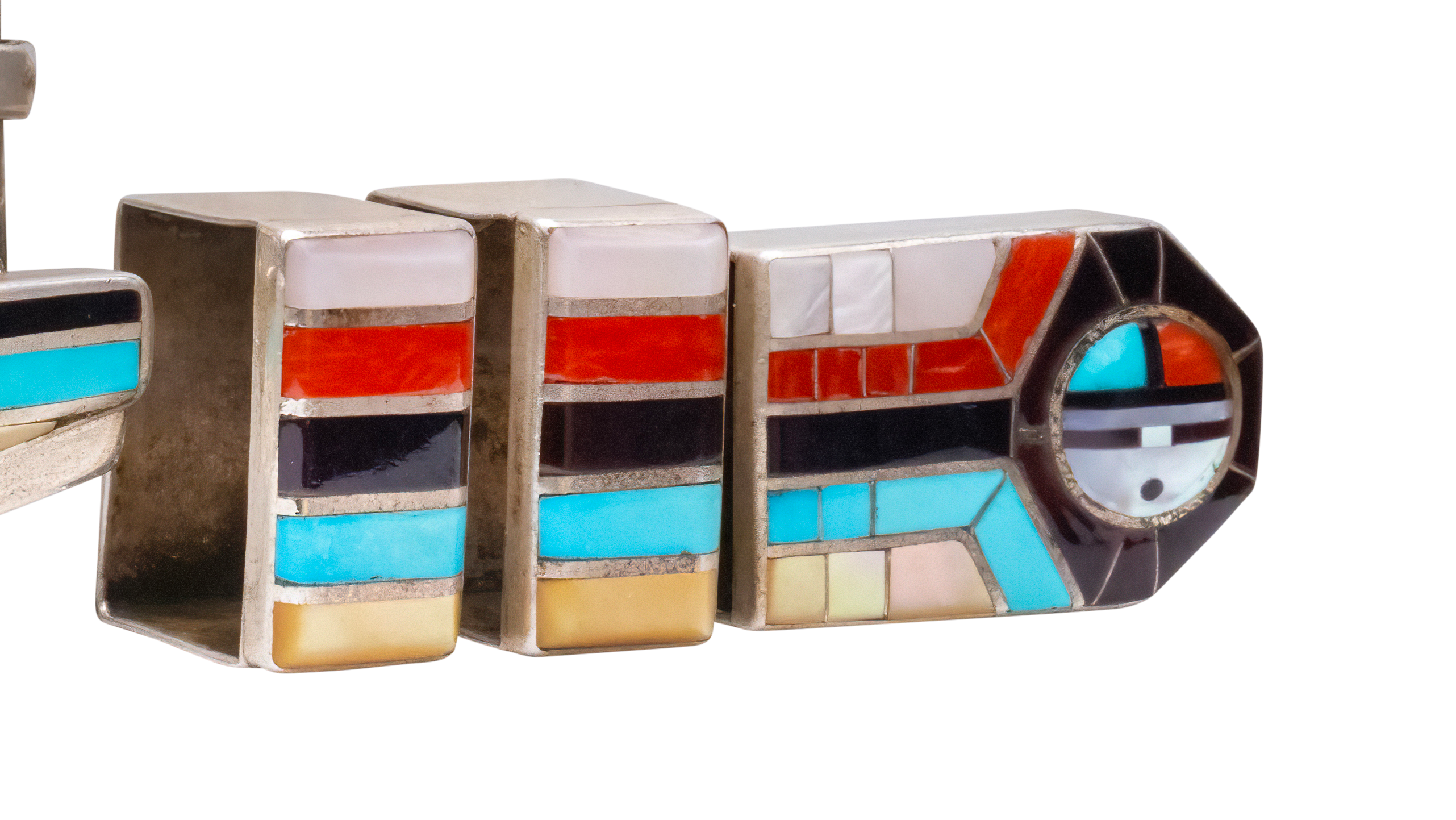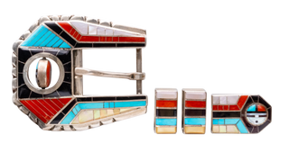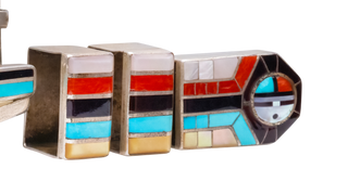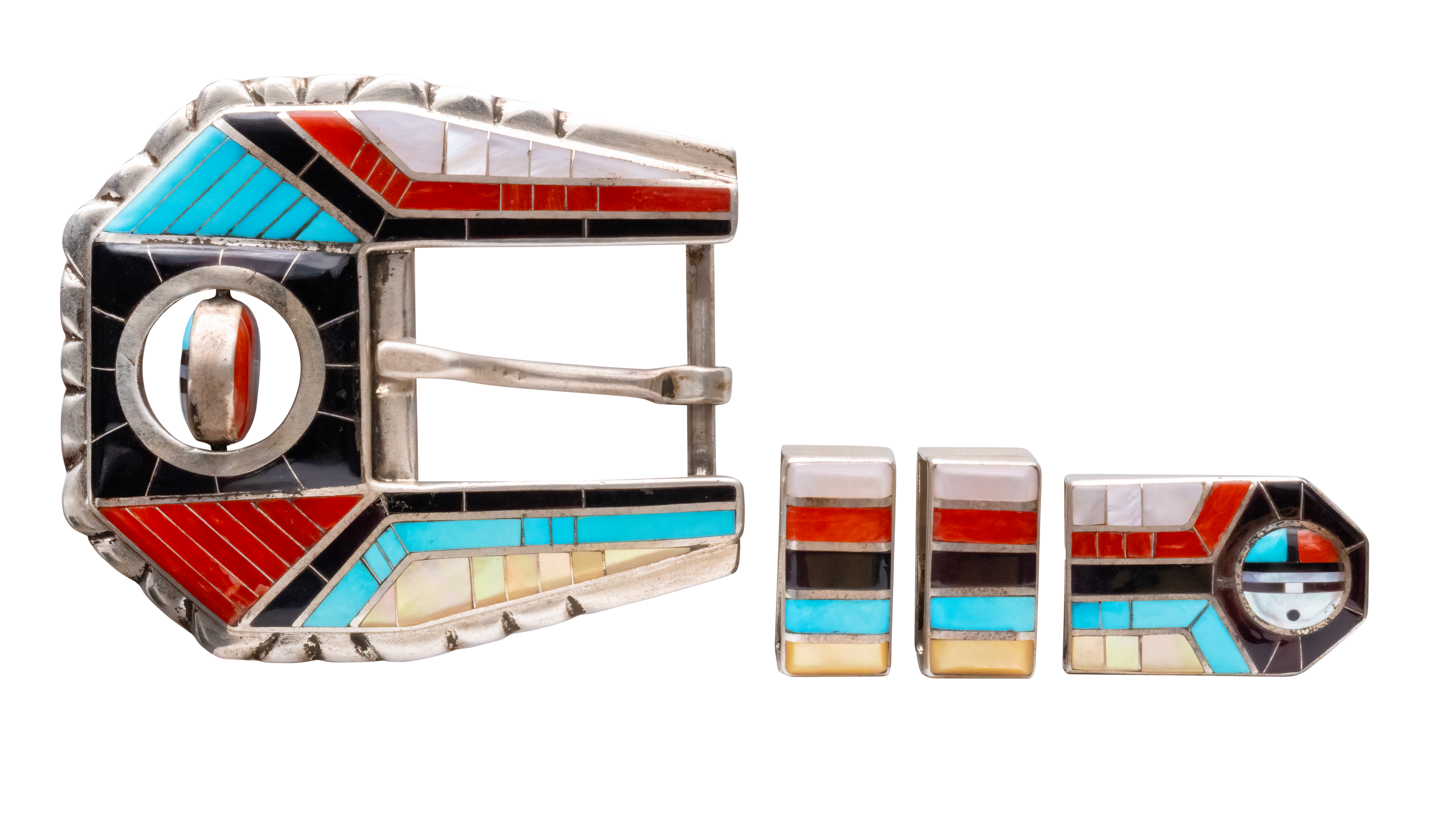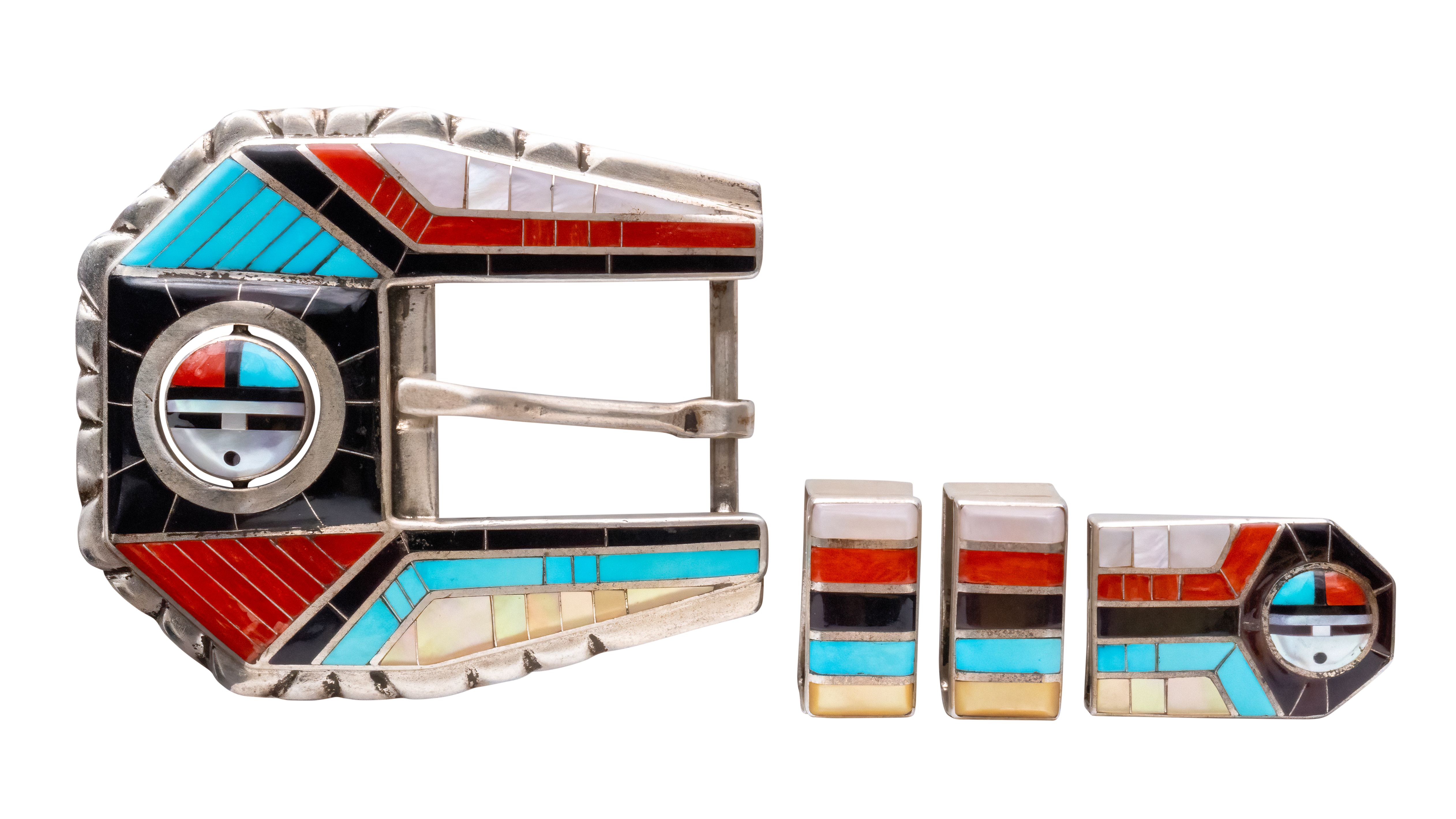 This belt buckle set, handcrafted by accomplished artist Don Dewa, features traditional Zuni inlay work and vibrant colors that showcase the earth's geologic beauty and Dewa's skill as as artisan. Utilizing stones of Sleeping Beauty Turquoise, Coral, Jett, and Mother of Pearl, this buckle's complementary colors make a stunning composition. A rotating sun-face sits in the center piece of the buckle, perfectly placed to draw the eye--a small but extraordinary detail. This set's exemplary construction, traditional deigns, and eye-catching colors make it unforgettable.