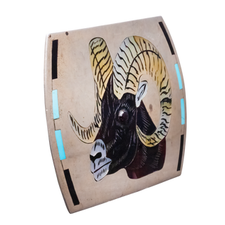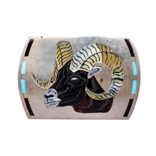 This unique belt buckle handcrafted by Zuni Pueblo artist Dale Edaakle features a intricate inlay work that forms an eye-catching mosaic. A ram's head constructed from mother of pearl, jett, & Sleeping Beauty Turquoise--all hand-carved with precision that showcases Edaakle's skill. A detailed, and stunning composition, the ram head is framed by four, rectangles of jett and Sleeping Beauty Turquoise to draw the eye and evoke a sliver of the sky.