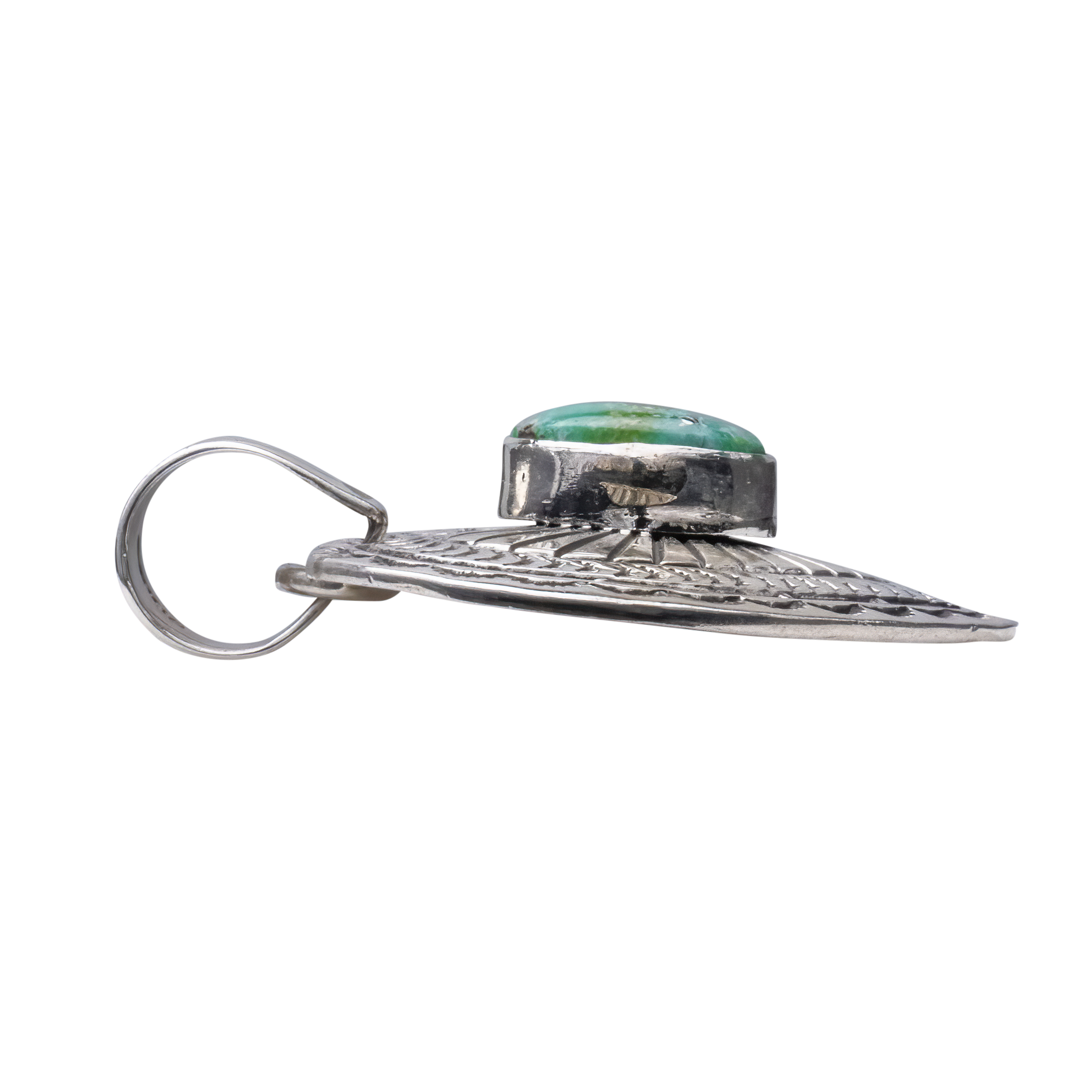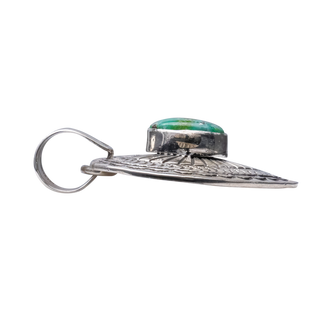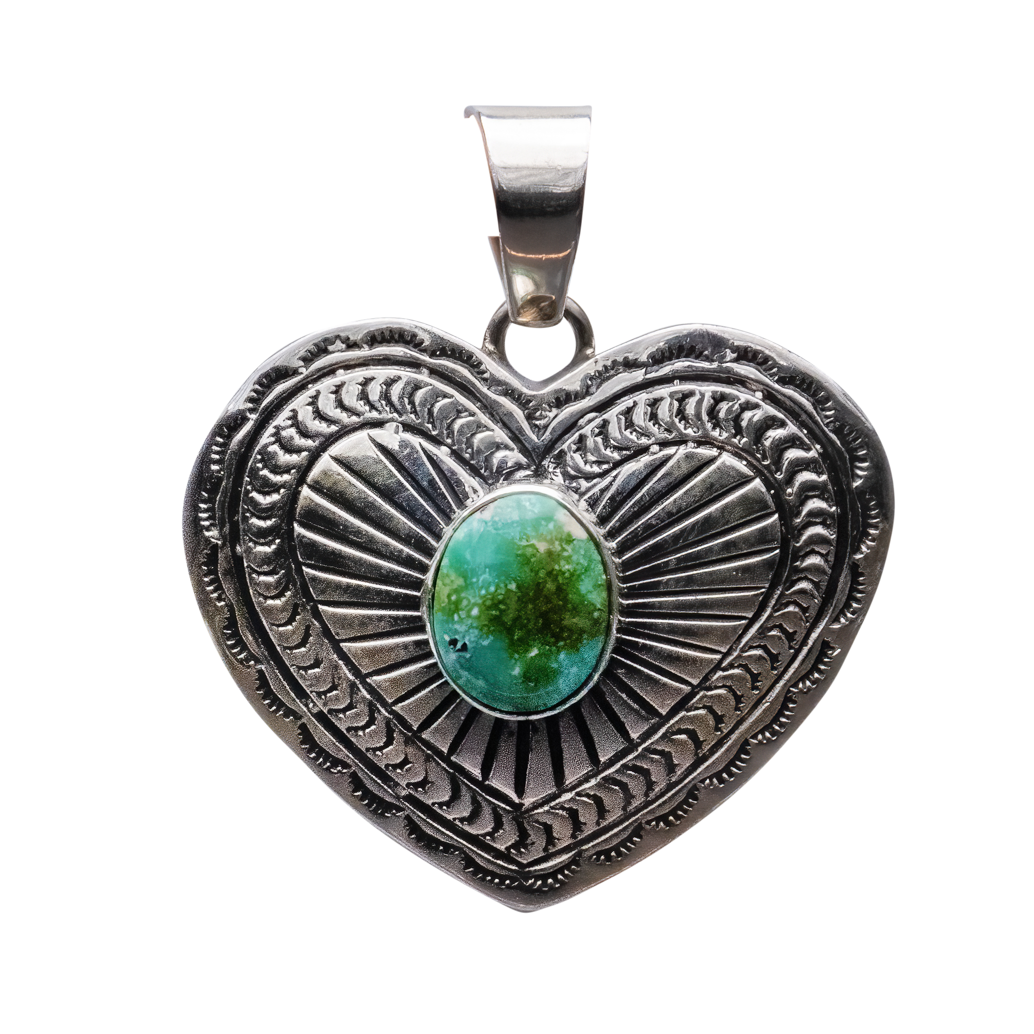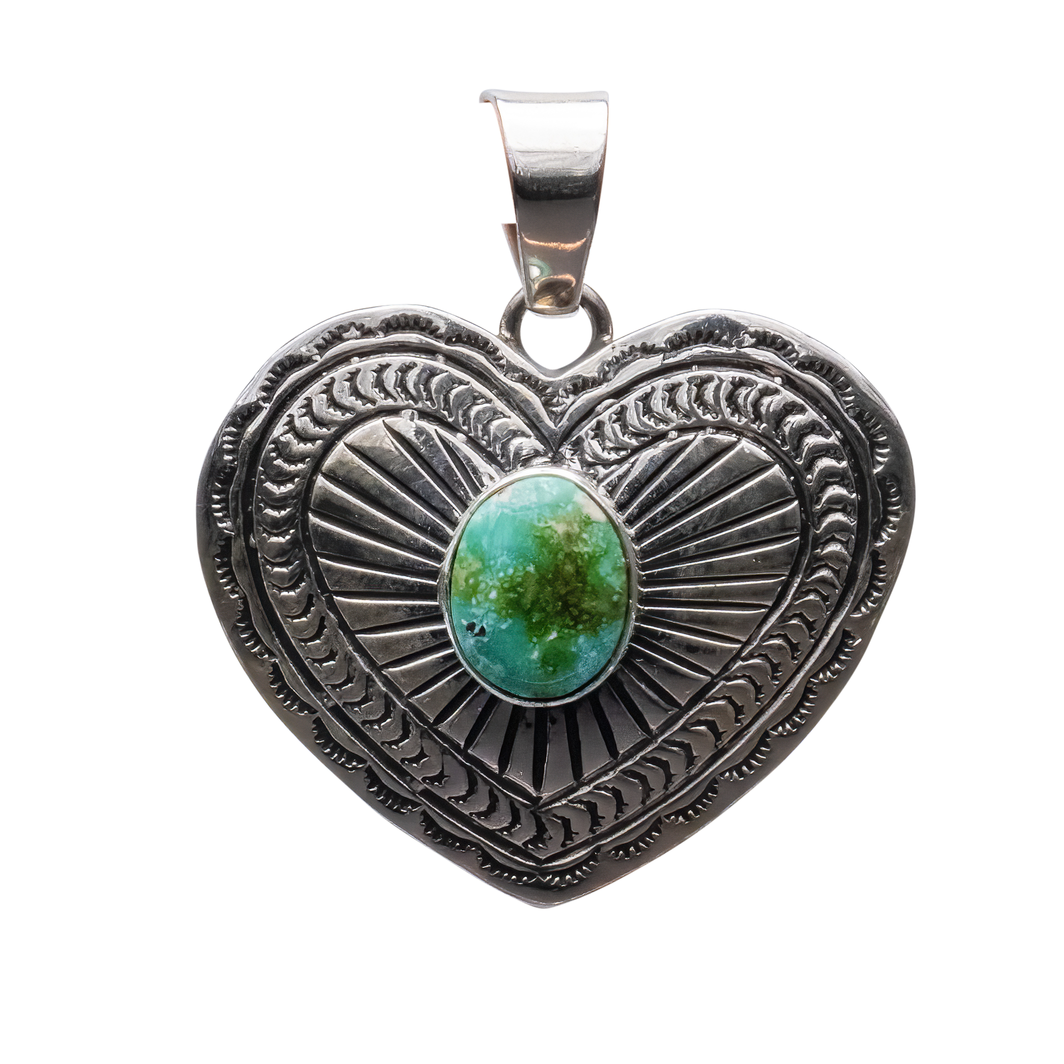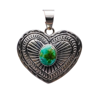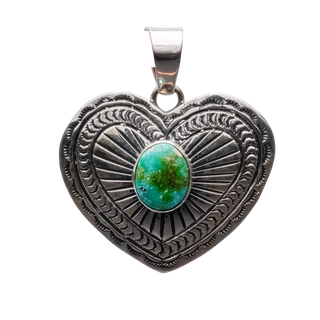 Celebrate love and artistry with this enchanting heart-shaped pendant crafted by Navajo artist June Delgarito. At the center of this intricately designed sterling silver heart lies a stunning piece of Sonoran Turquoise, known for its vibrant green hue intermixed with delicate golden-brown matrixes. The pendant is beautifully framed by a detailed sterling silver border that features traditional Navajo patterns, adding depth and character to the piece. This romantic pendant is not just a piece of jewelry, it is also a symbol of affection, meticulously handcrafted to capture the essence of both the stone's natural beauty and the cultural heritage of the Navajo people. Ideal for a meaningful gift or as a personal treasure, this pendant is a timeless piece that will be cherished for generations.