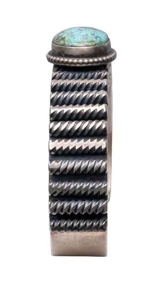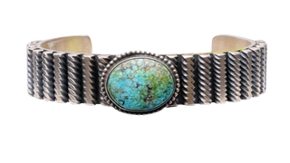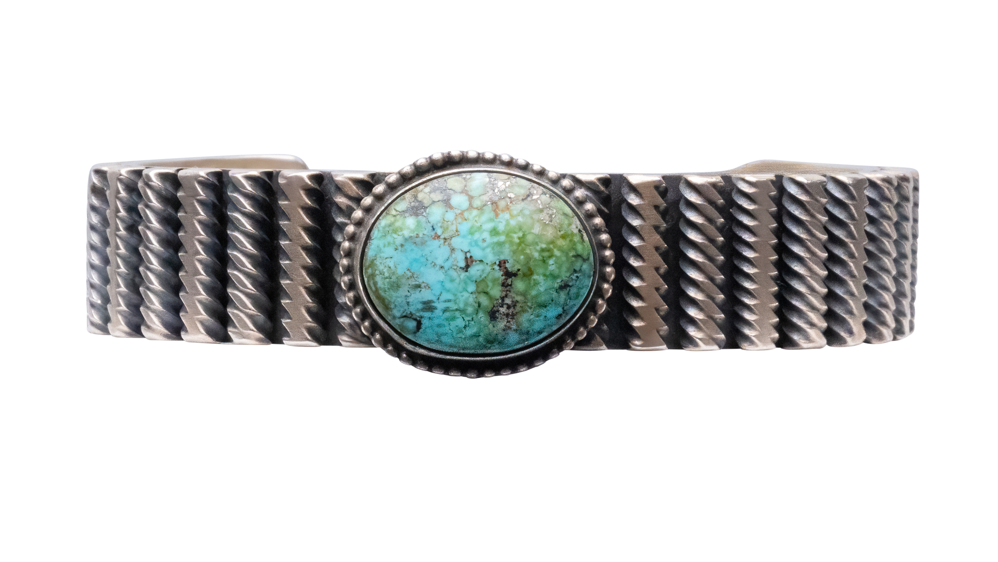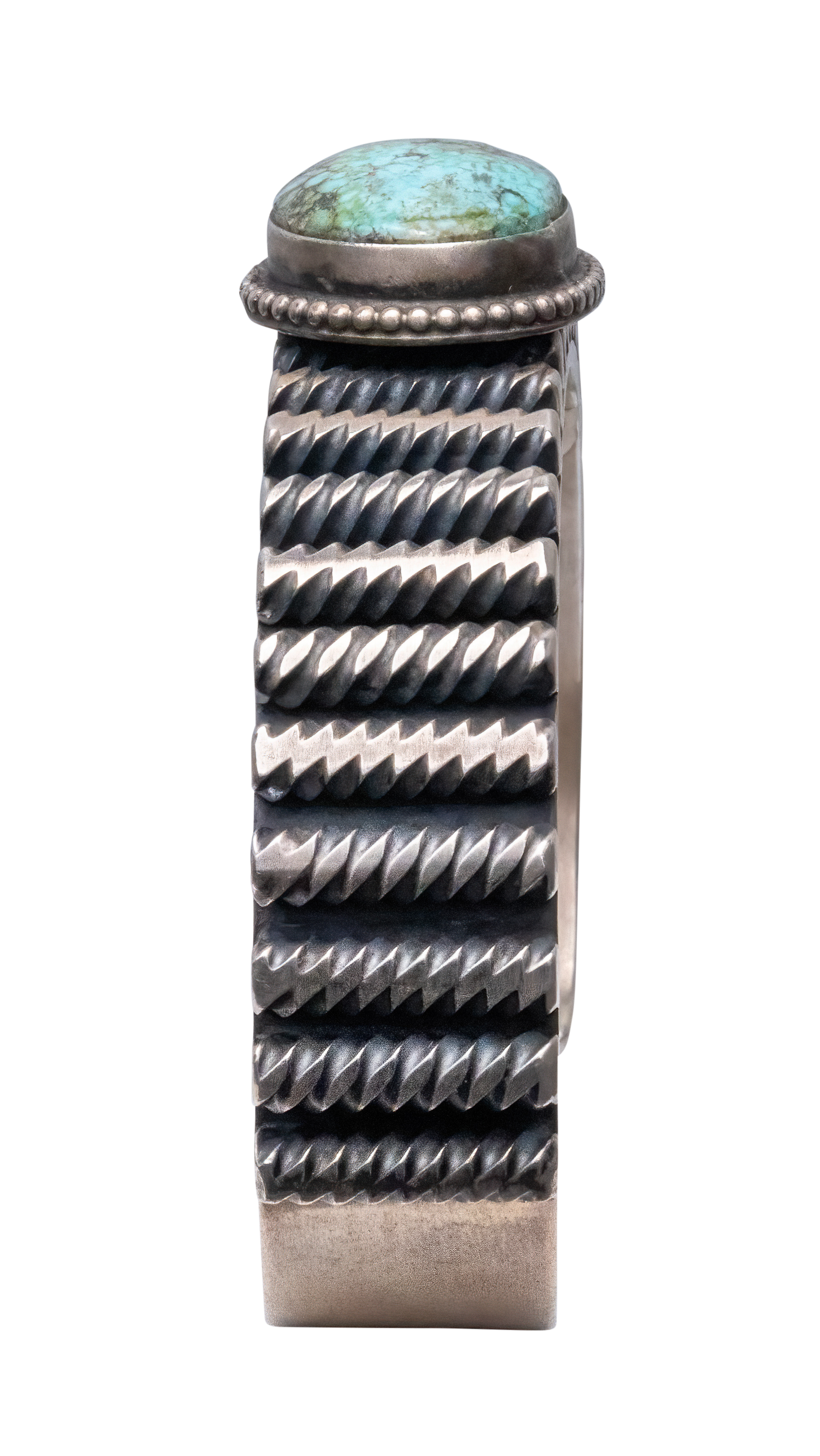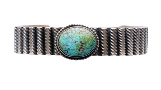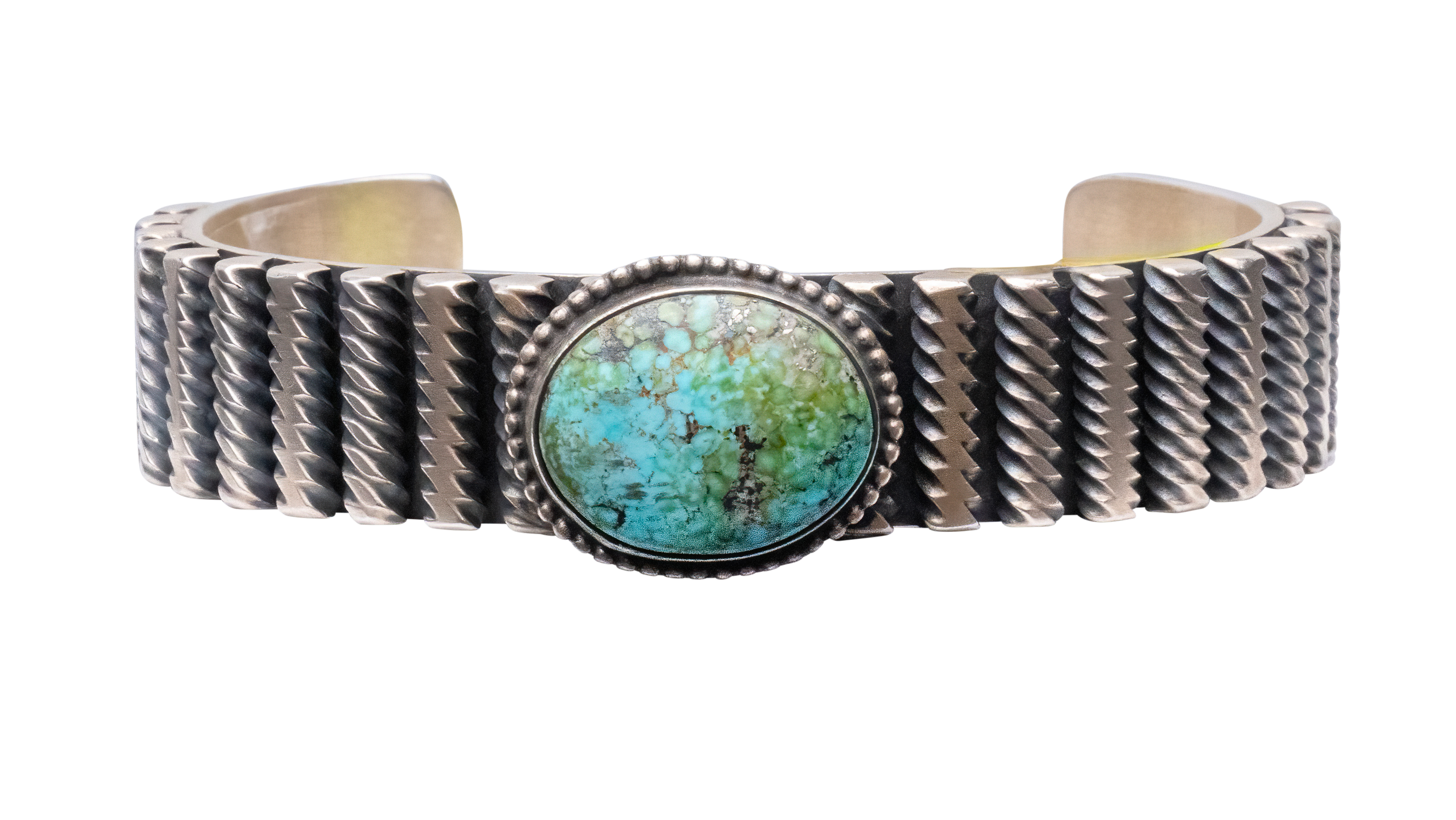 Acclaimed artisan Leander Tahe's skill and eye for aesthetics shine in this cuff. A vibrant Sonoran Turquoise stone is encased at the center of a sterling silver setting. Hand-stamped zigzag bars and silver drops decorate the sides of this cuff and create a sense of movement and texture. With its beautiful turquoise center piece and Tahe's meticulous stamping techniques, this cuff is a masterpiece.