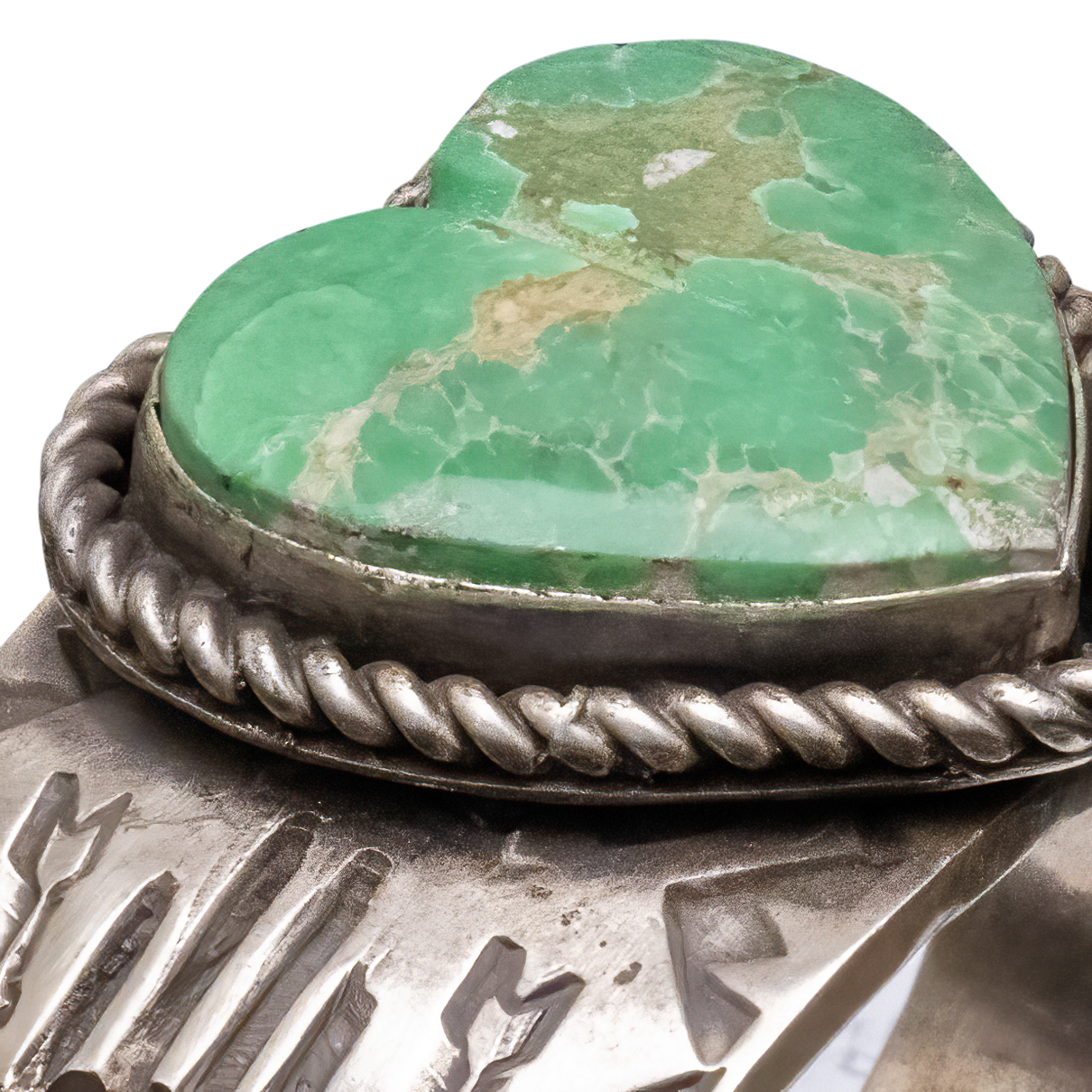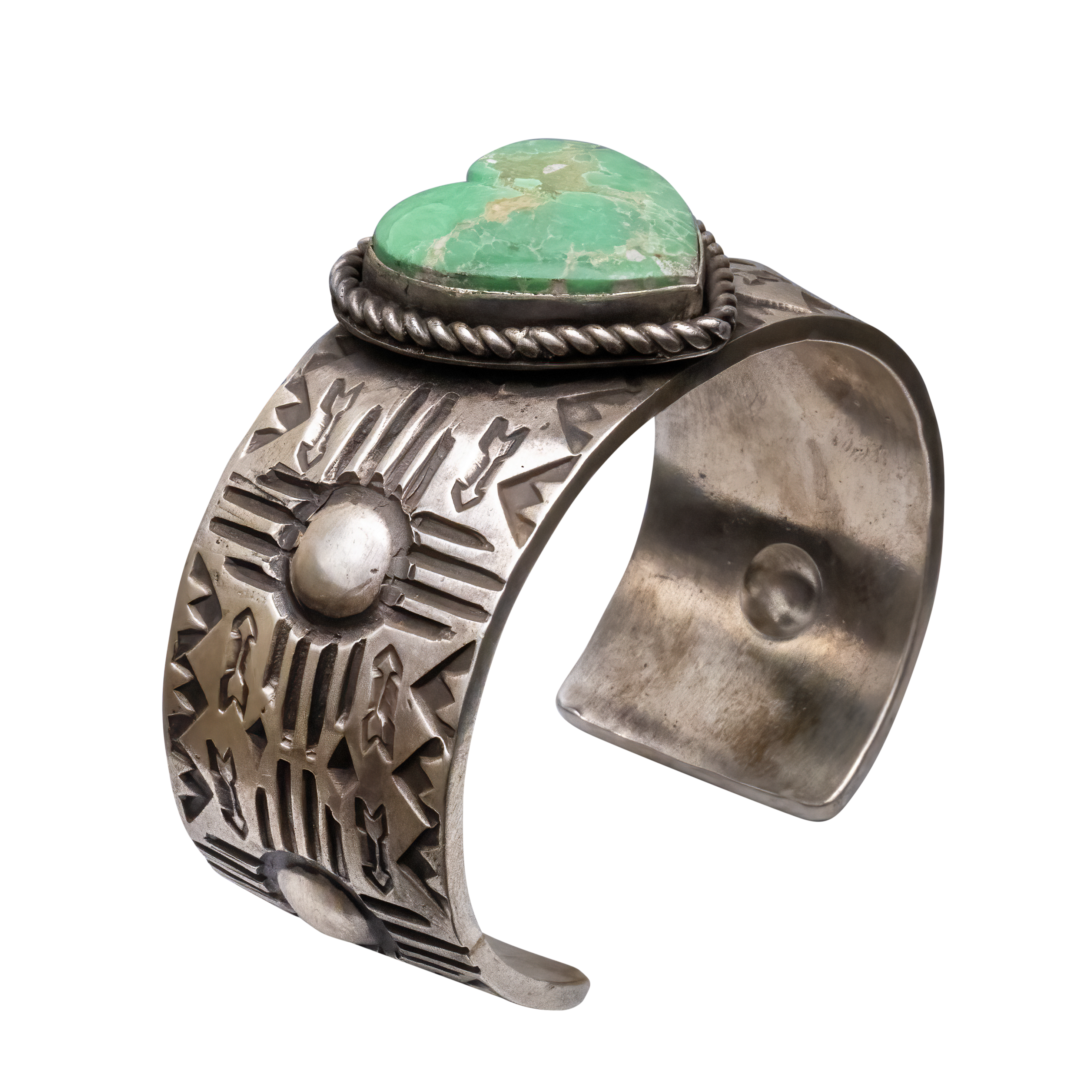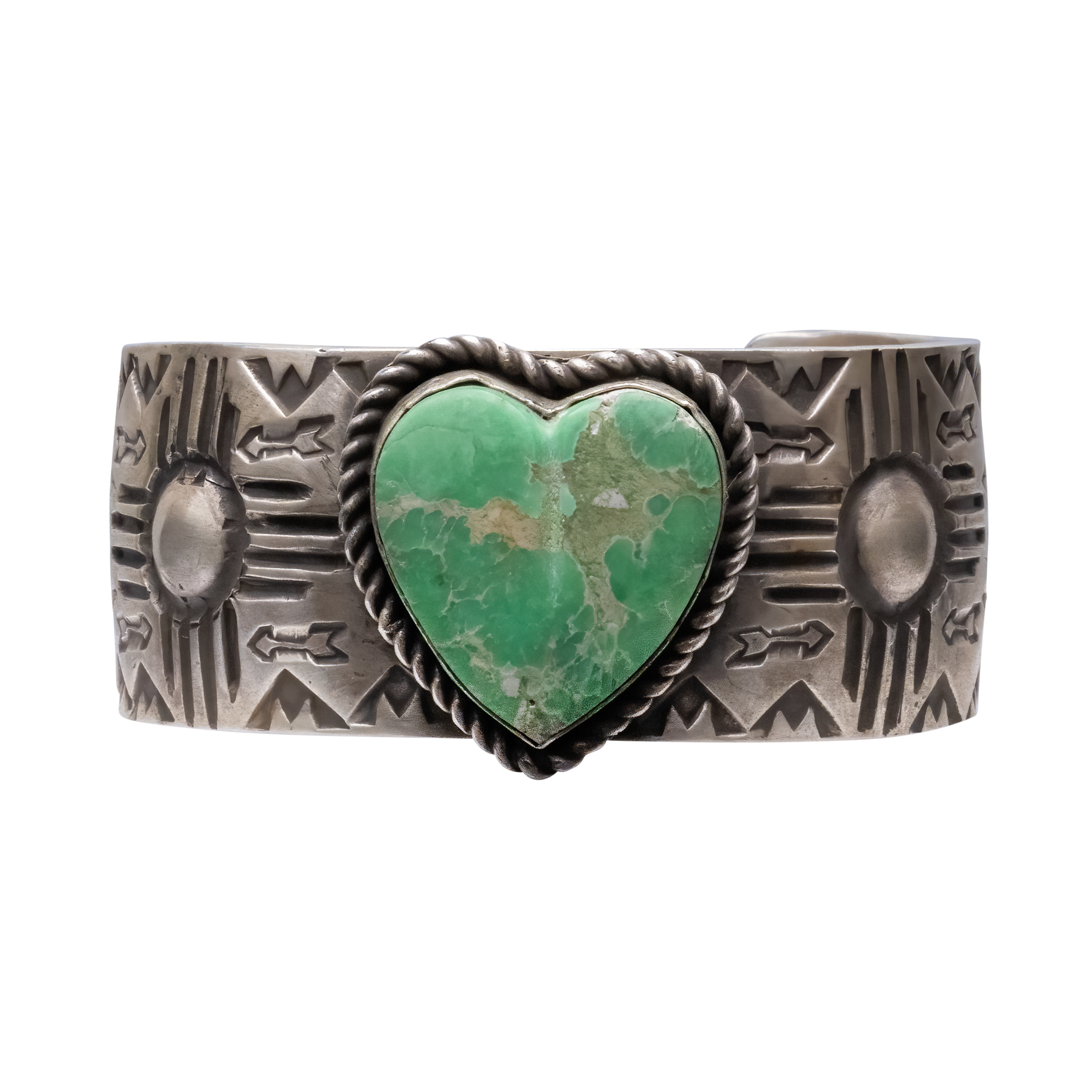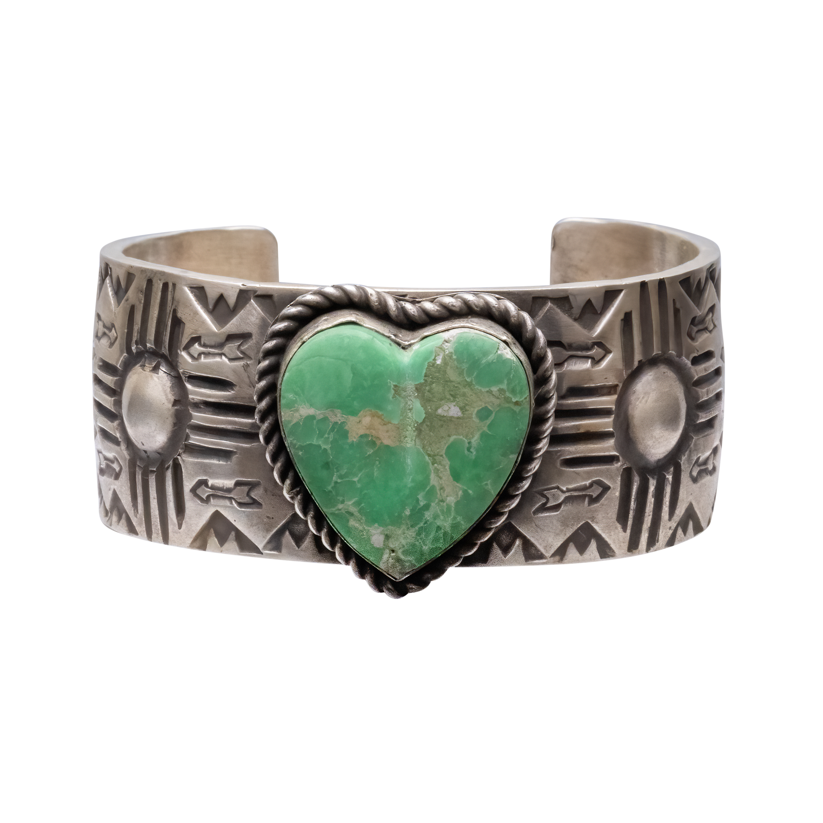 Celebrate love and artistry with this captivating sterling silver cuff crafted by Navajo artist Ronnie Willie. The centerpiece of this unique piece is a heart-shaped Kingman Turquoise stone, beautifully showcasing a deep blue marbled by a green and brown matrix. This romantic stone is complemented by Ronnie's signature stamp work, featuring traditional Navajo symbols and designs that create a harmonious blend of culture and craftsmanship around the band. The cuff's solid silver construction ensures durability while maintaining a delicate balance with the intricate detailing. Ideal for a meaningful gift or as a special addition to your own collection, this cuff is a testament to nature's beauty and Navajo silversmithing.