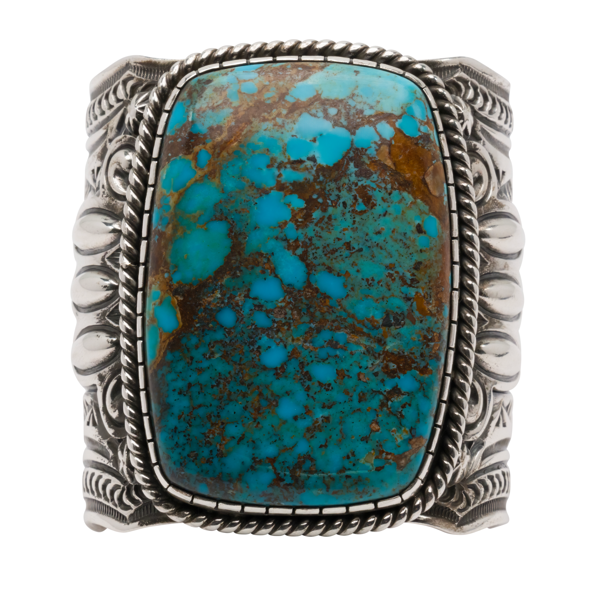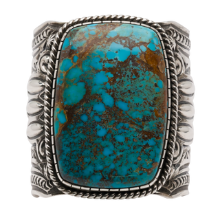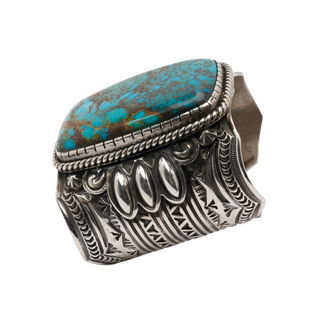 This handcrafted sterling silver cuff, crafted by acclaimed silversmith Arnold Blackgoat, features a stunning Gobber Turquoise centerpiece. The Gobber Turquoise stone's vibrant colors and striking patterns are highlighted by bright sterling silver. Intricate silverwork mirrors the stone's natural beauty, creating a piece that's not only a bracelet but a conversation starter and a unique work of art.