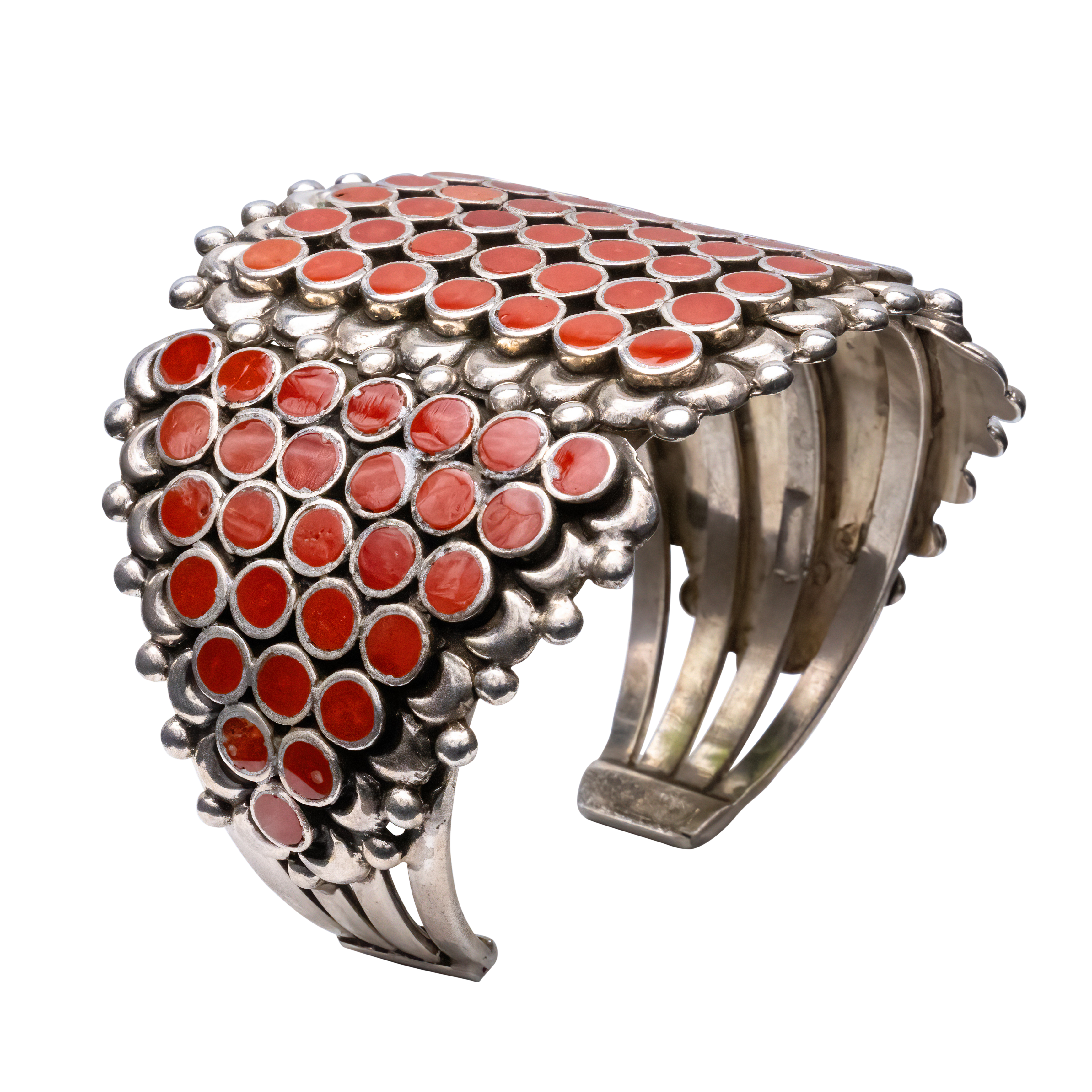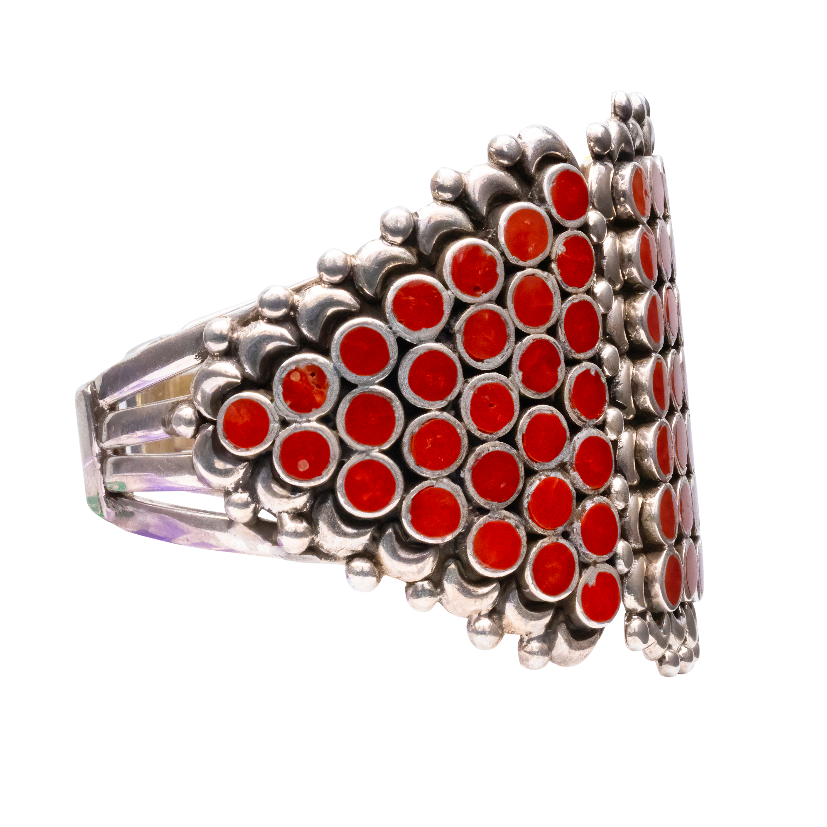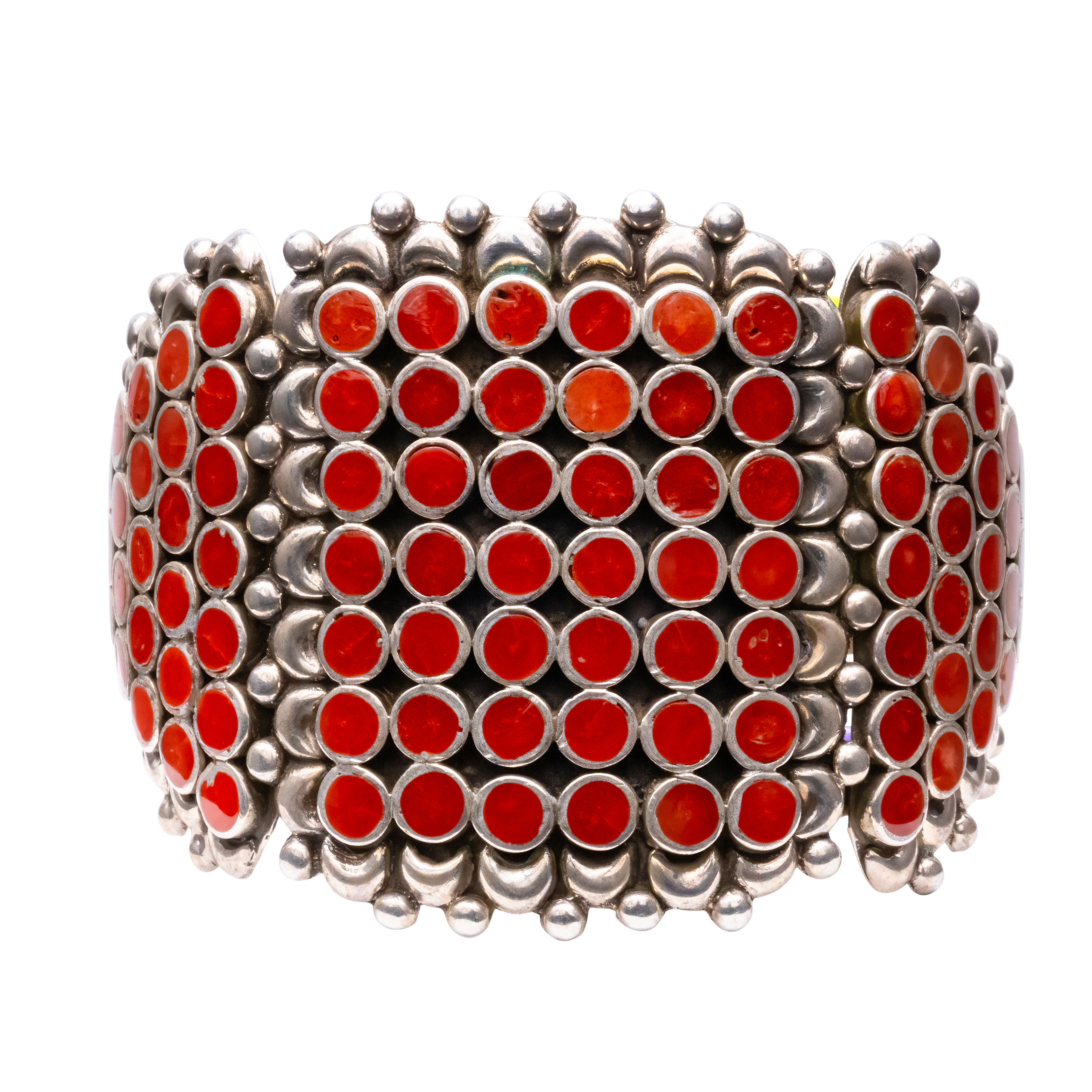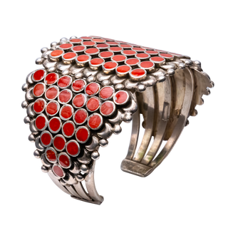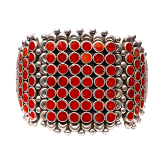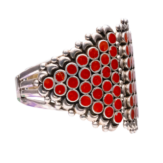 Introducing a magnificent inlay cluster cuff, meticulously crafted by Zuni Pueblo artist Vincent Shirley, that epitomizes the beauty of the Southwest. This exquisite cuff features a vibrant array of Mediterranean coral meticulously set in sterling silver, creating a stunning mosaic of color and texture. Each piece of coral is carefully selected and arranged to create a captivating cluster design that reflects the artist's impeccable attention to detail. Adorn your wrist with this timeless masterpiece, a true testament to Zuni craftsmanship and the natural splendor of the coral reefs.
