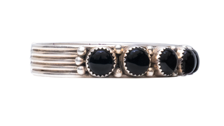 This stunning bracelet, crafted by Navajo artist Phillip Yazzie, features eleven onyx stones set in gleaming sterling silver. Carefully assembled in a line, each onyx stone is encased in a sawtooth bezel and framed by silver drops. Finally, a hand-stamped, linear design finishes the edges of the bracelet. Yazzie's expert craftsmanship shines from every element!