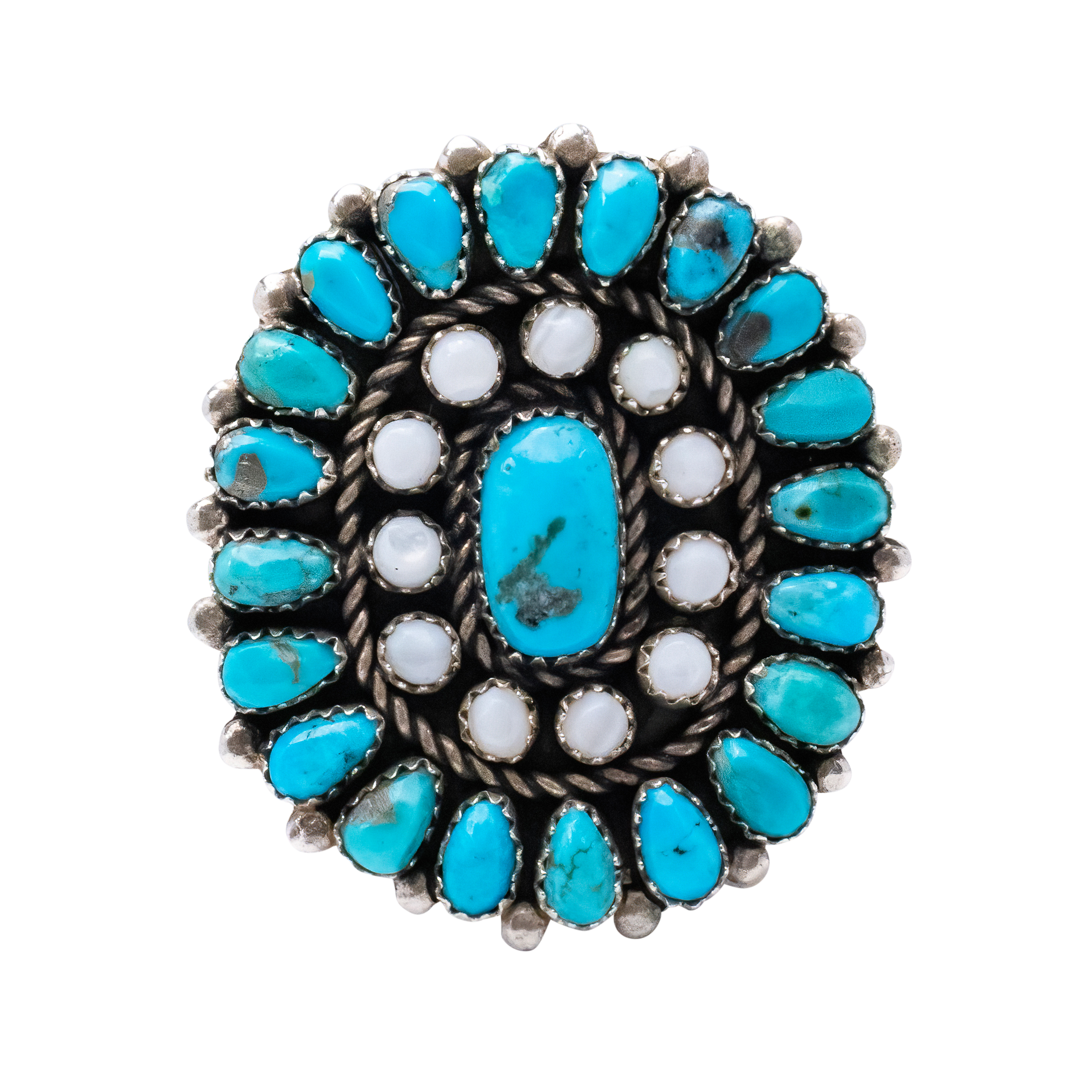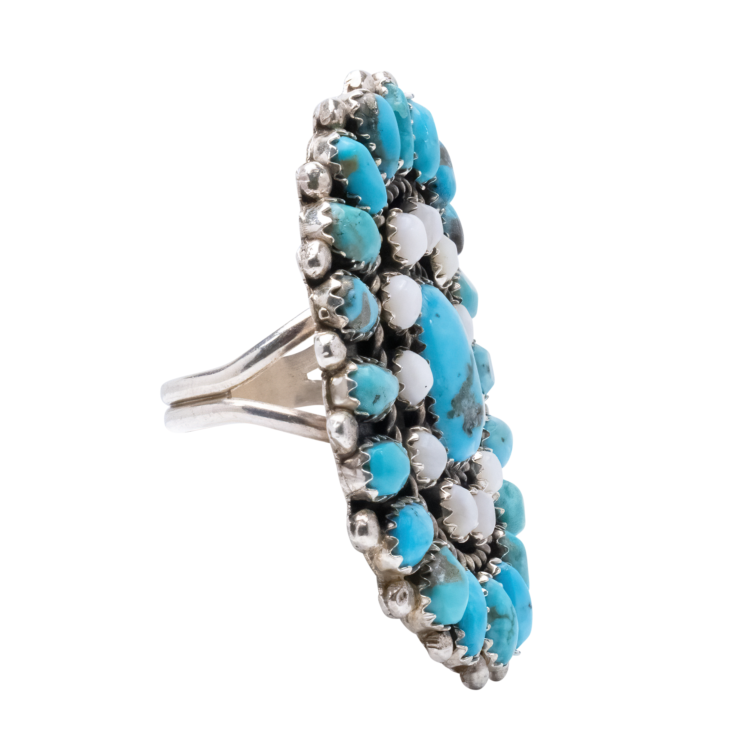 Imbued with the timeless allure of Kingman turquoise sourced from one of America's oldest mines and complemented by the shimmering elegance of Mother of Pearl, this ring is a masterpiece of natural beauty and expert craftsmanship. With Kingman turquoise boasting enchanting sky-blue hues steeped in over a millennium of history, and Mother of Pearl's iridescence and strength lending an extra layer of sophistication, this artisanal creation embodies the rich heritage of the American Southwest. Expertly crafted by renowned artist Fred Begay, each stone tells a story of enduring elegance, making this ring a cherished heirloom for generations to come.