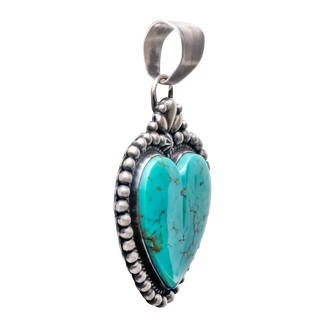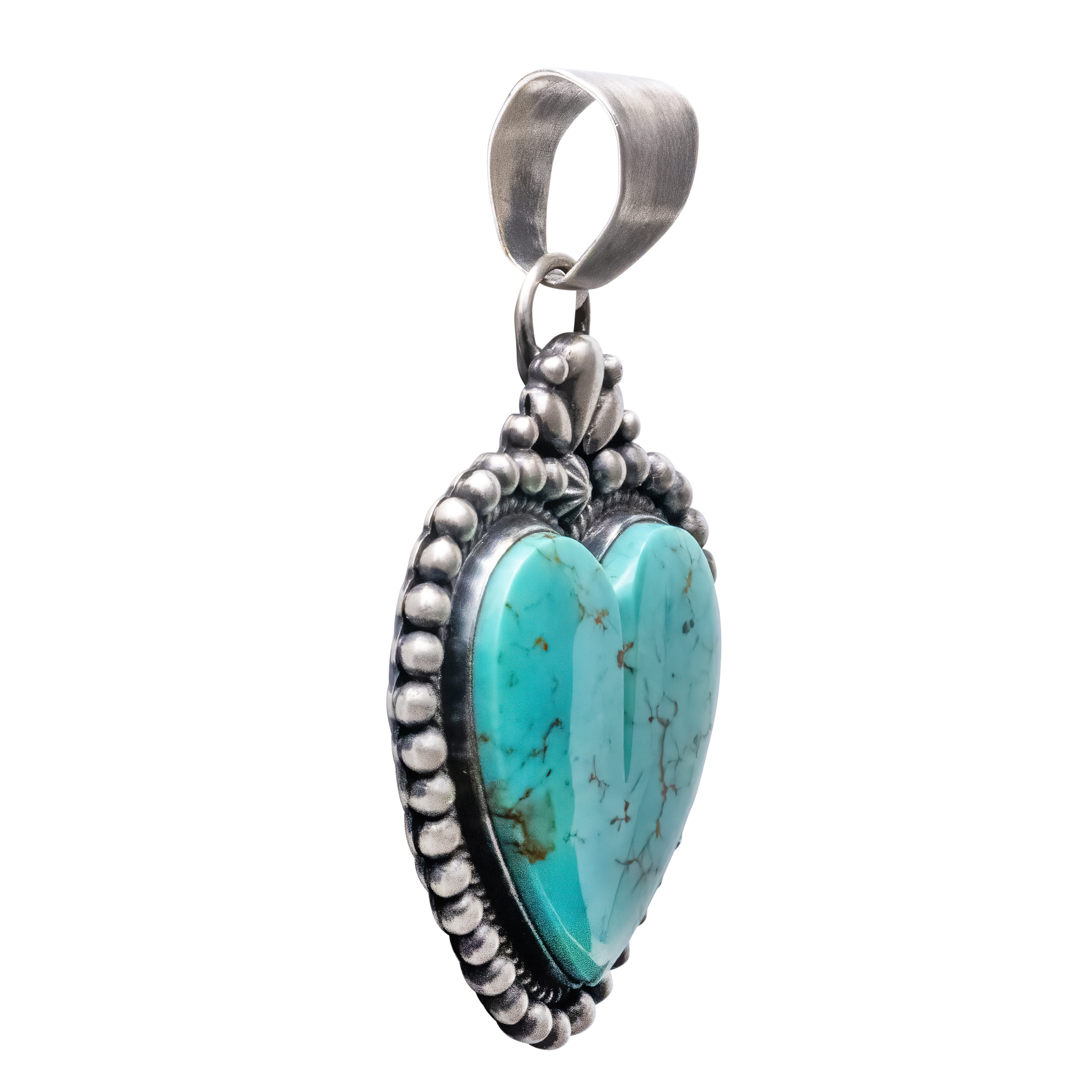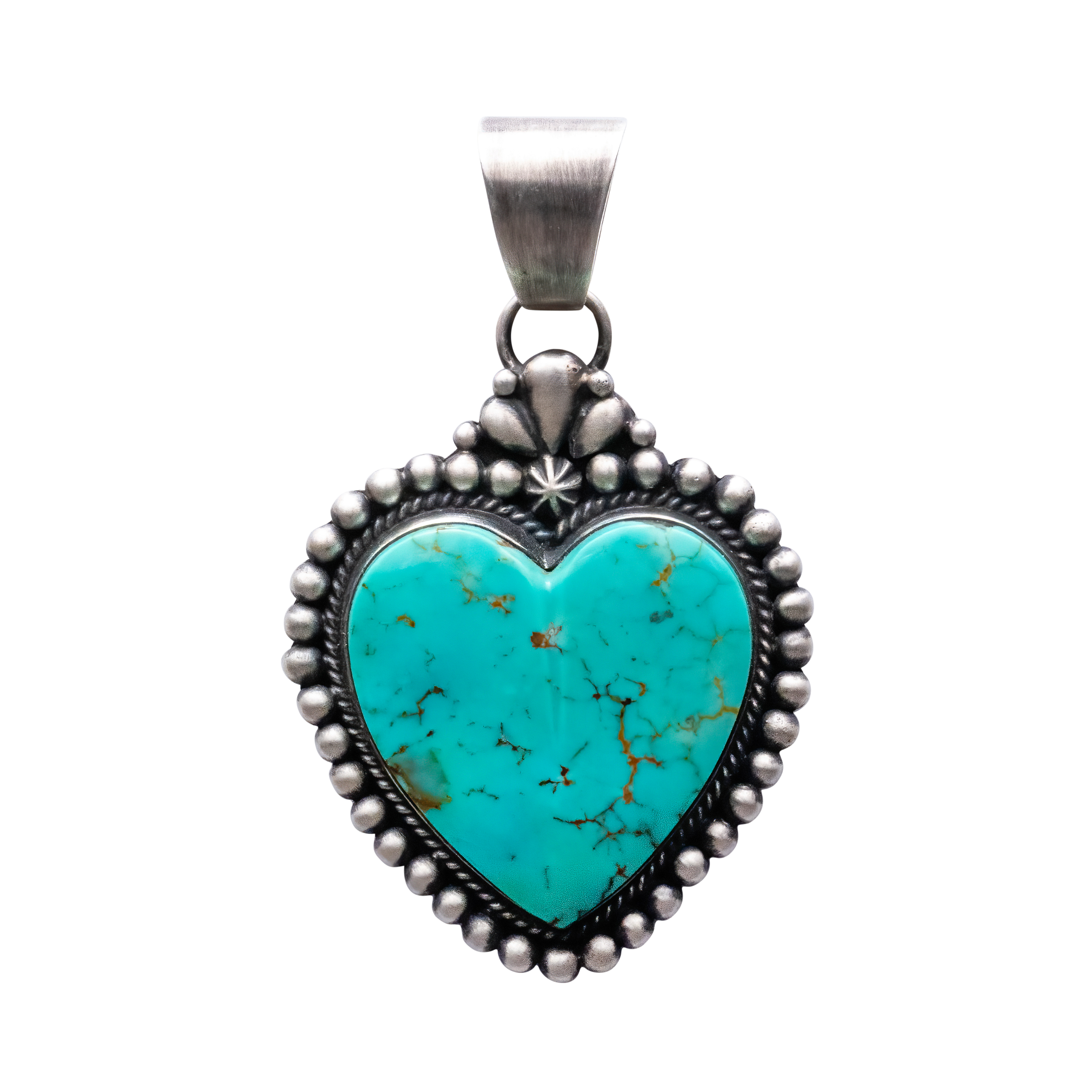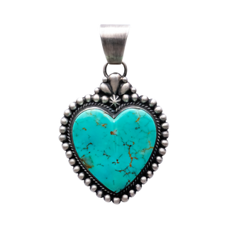 Discover Southwest elegance with Lowell Draper's pendant, showcasing a heart-shaped Kingman Turquoise center stone. Sterling silver detailing, including star buttons and silver drops, surrounds the stone with intricate craftsmanship. This piece reflects Draper's reverence for Navajo heritage and embodies timeless beauty and tradition. Elevate your collection with this exquisite pendant, destined to be a cherished heirloom.