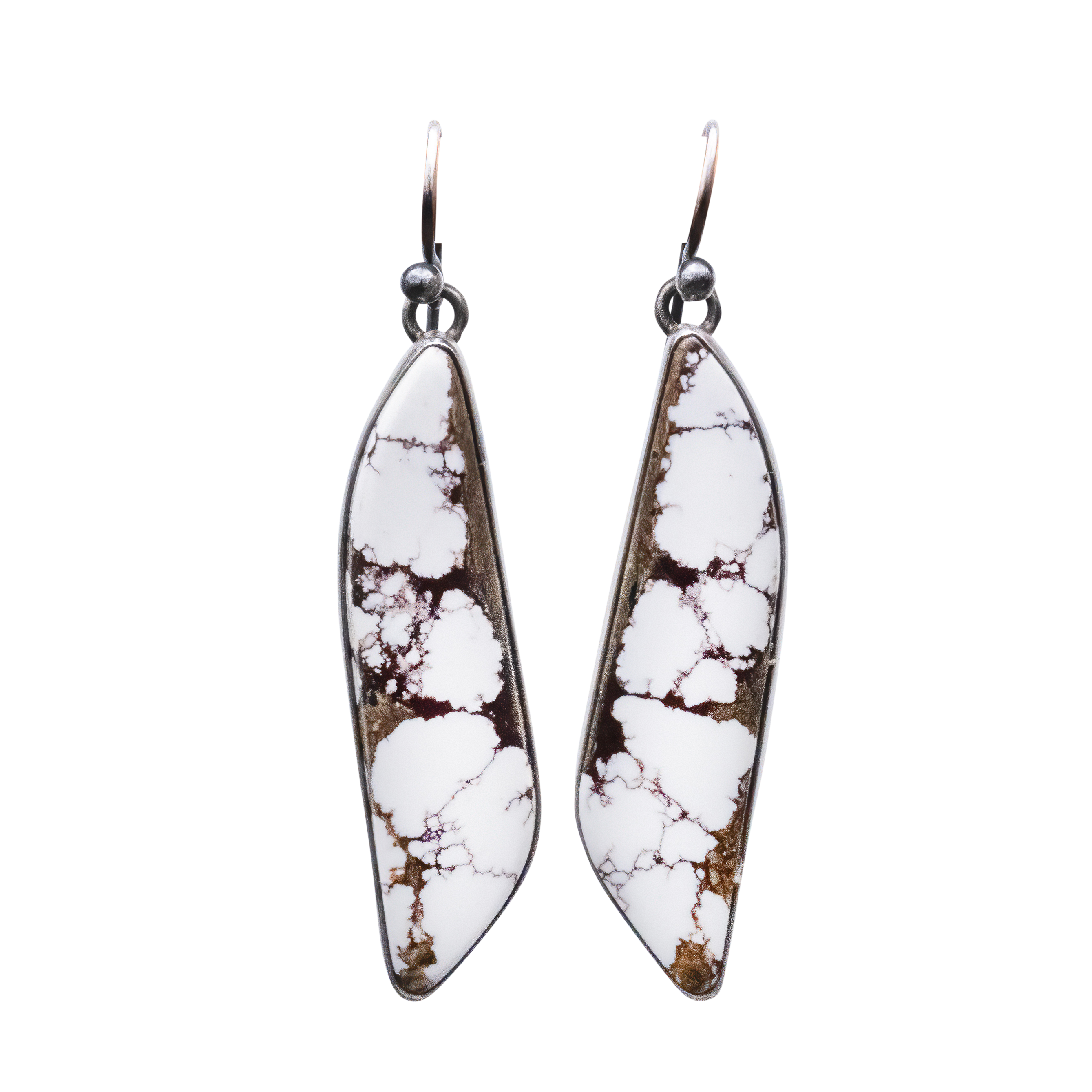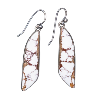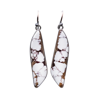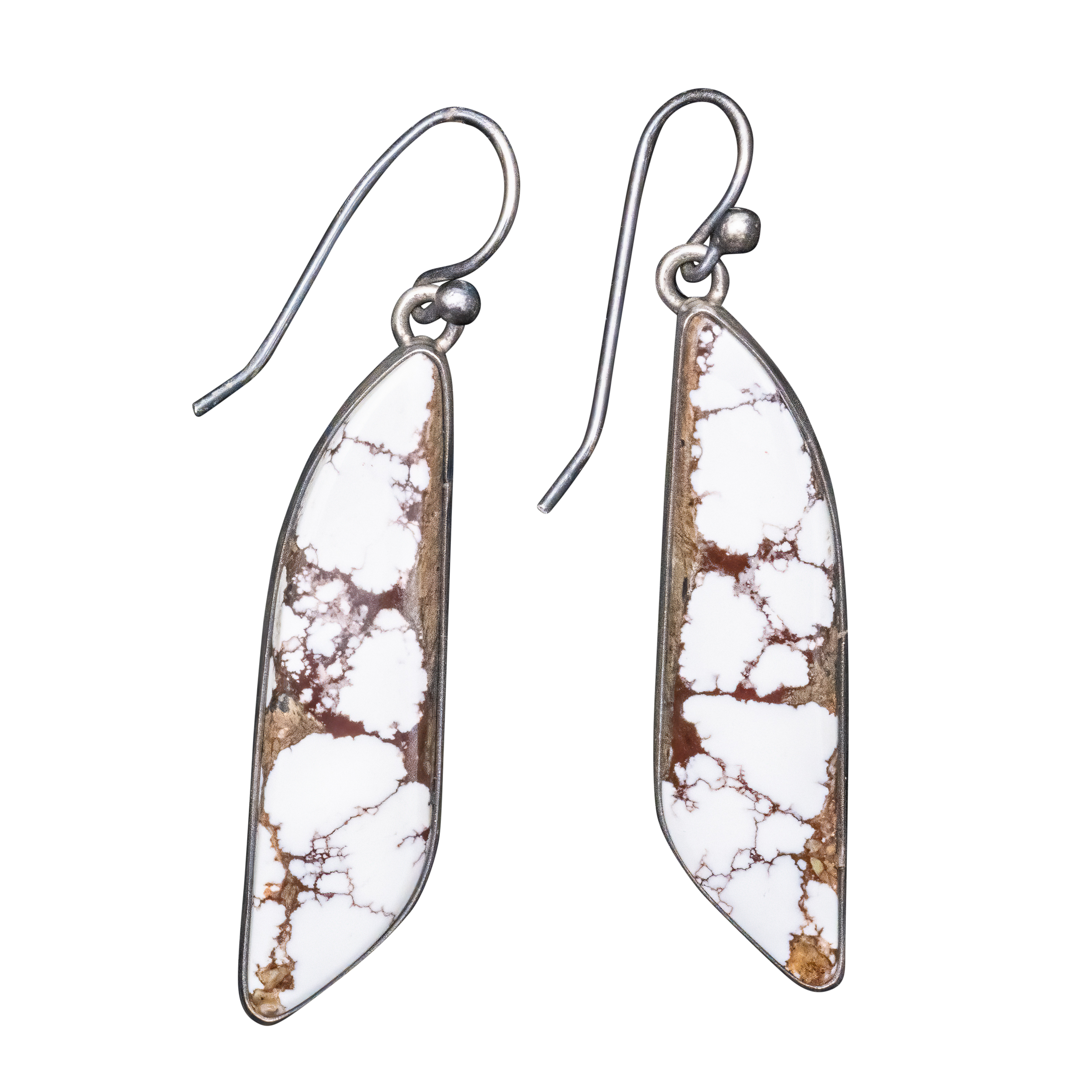 Elevate your style with these exquisite dangle earrings crafted by Diane Wylie, showcasing the mesmerizing beauty of White Horse. Each earring features a unique White Horse stone, renowned for its striking matrix and calming energy. Suspended delicately from sterling silver hooks, these earrings exude elegance and Southwest charm. Embrace the allure of natural beauty and artisanal craftsmanship with this stunning set.