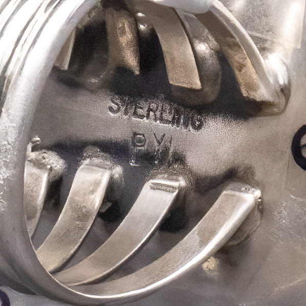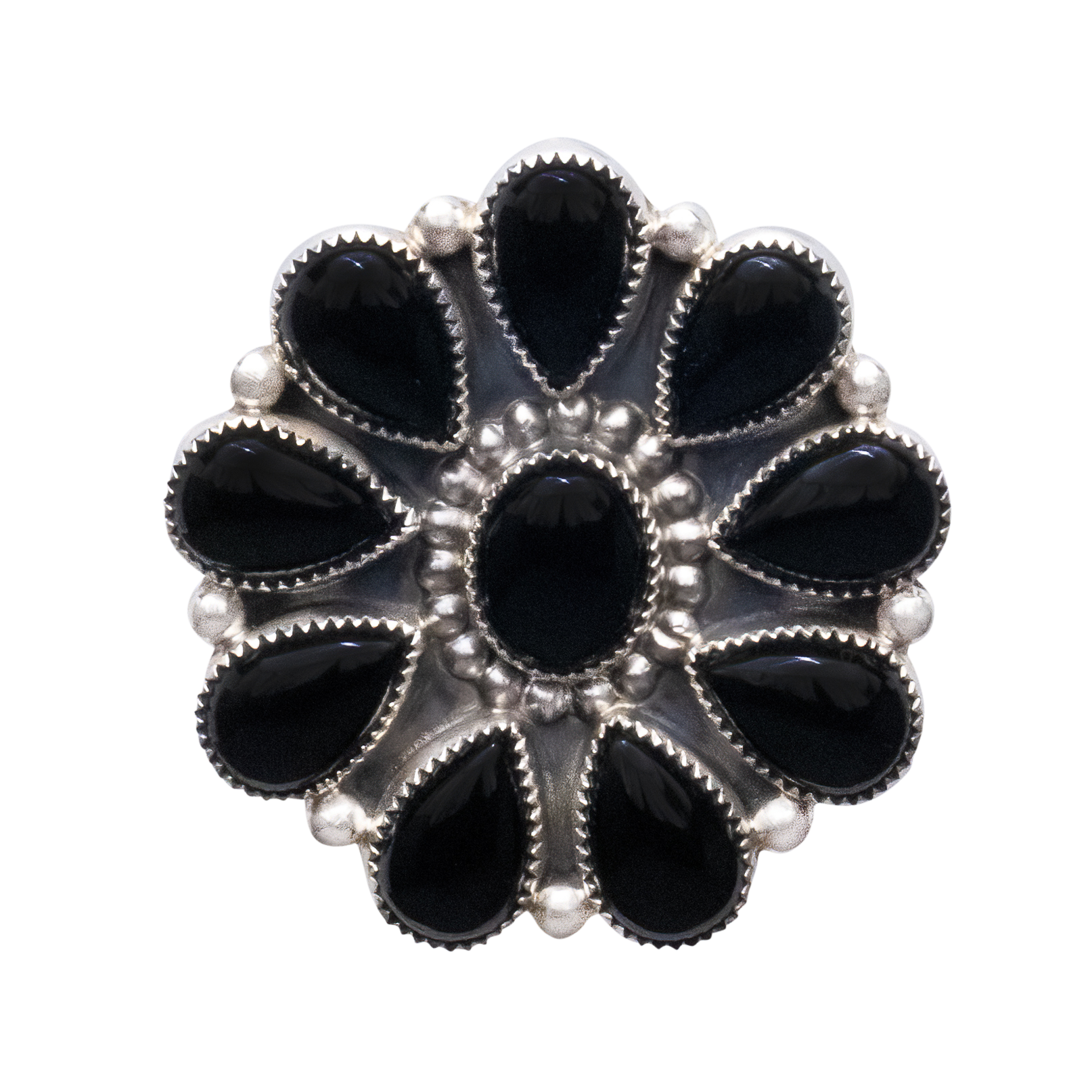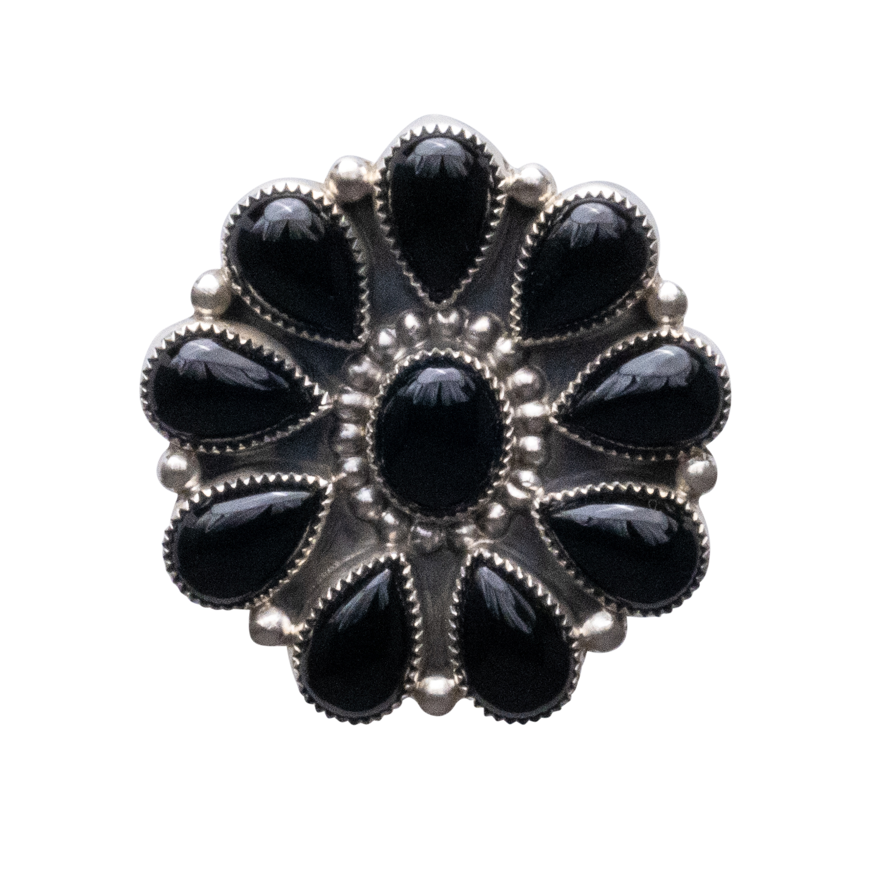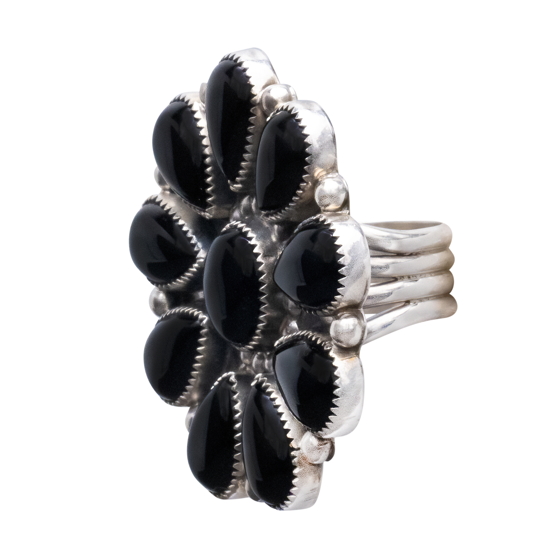 This gorgeous ring was crafted by the talented and accomplished artist Phillip Yazzie. With onyx gemstones assembled in a classic cluster design atop a sterling silver setting, this ring's arrangement of stones resembles a flower where nine tear-drop shaped stones surround a round center stone like petals. Sawtooth bezels surround each stone and securely hold them in place. Silver drops frame the center stone and separate each petal for added detail and intrigue. Its polished silver-work, enticing arrangement, and deep black onyx color balanced by bright silver make this ring a strong statement piece.