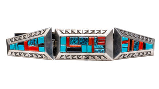 Step into the spotlight with this exquisite three-piece belt by Navajo artists Alvin Begay and Lulu Begay, a captivating fusion of contemporary style and traditional craftsmanship. The belt features a stunning mosaic inlay and multi-stone overlay, showcasing the rich hues of Mediterranean coral, Acoma jet, Sleeping Beauty Turquoise, and Kingman Spiderweb Turquoise. Each stone is meticulously set to create a mesmerizing tapestry of color and texture.