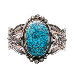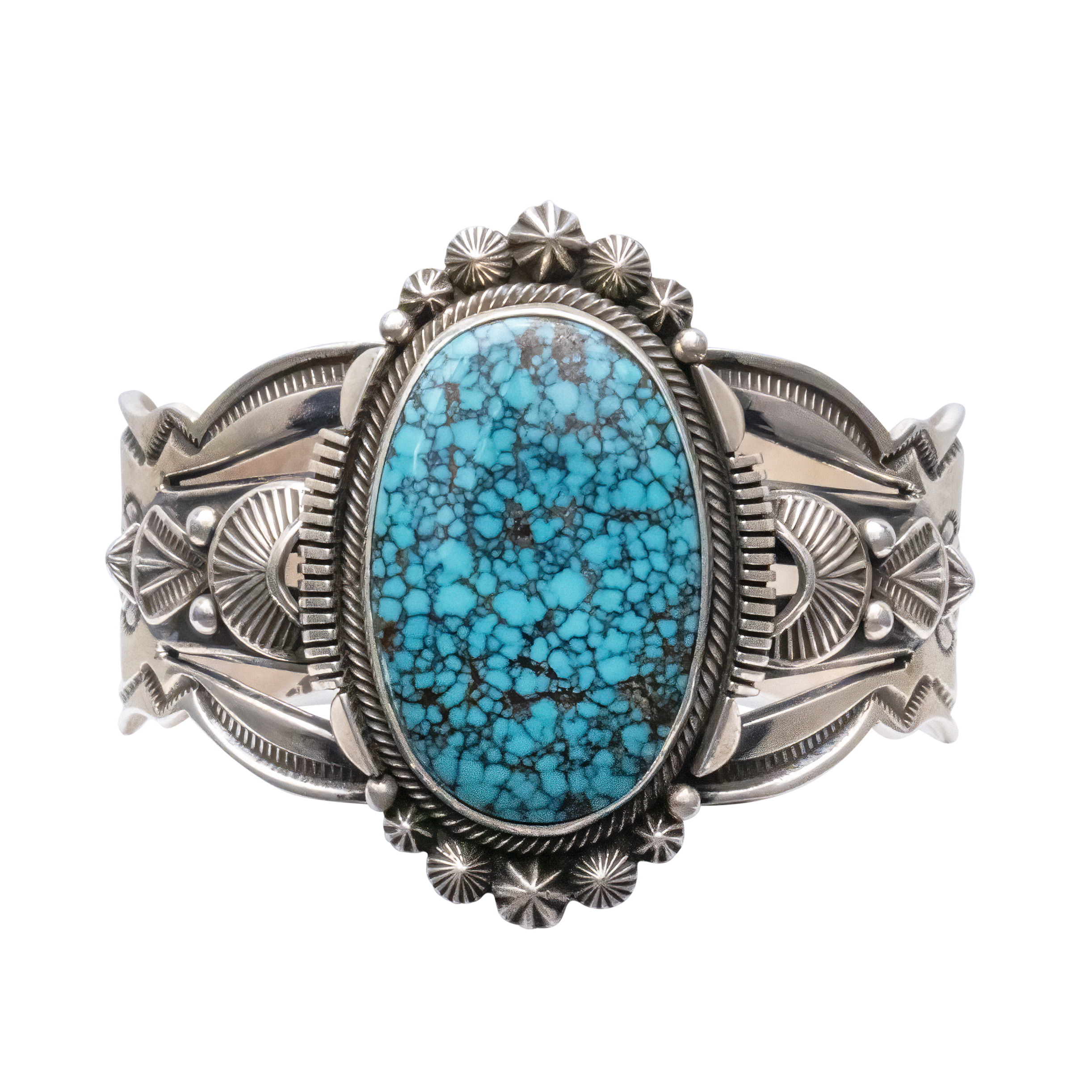 Step back in time and embrace the enduring beauty of the Southwest with this vintage Kingman Turquoise cuff steeped in history and tradition. Crafted six decades ago, this cuff bears witness to the passage of time. Its aged patina is imbued with stories of generations past. A magnificent Kingman Turquoise stone rests at the center; its vibrant hues echoing the timeless allure of the desert landscape. Adorned with star buttons, delicately twisted wire, and a hand-stamped design reminiscent of traditional Navajo motifs, this cuff exudes a rustic charm that speaks to the artisanal skill of its maker. Tapered sides add a touch of elegance to the piece. More than just a piece of jewelry, this cuff is a wearable piece of history and a testament to the enduring legacy of the Southwest. It will be a cherished heirloom for generations to come.