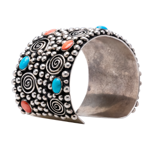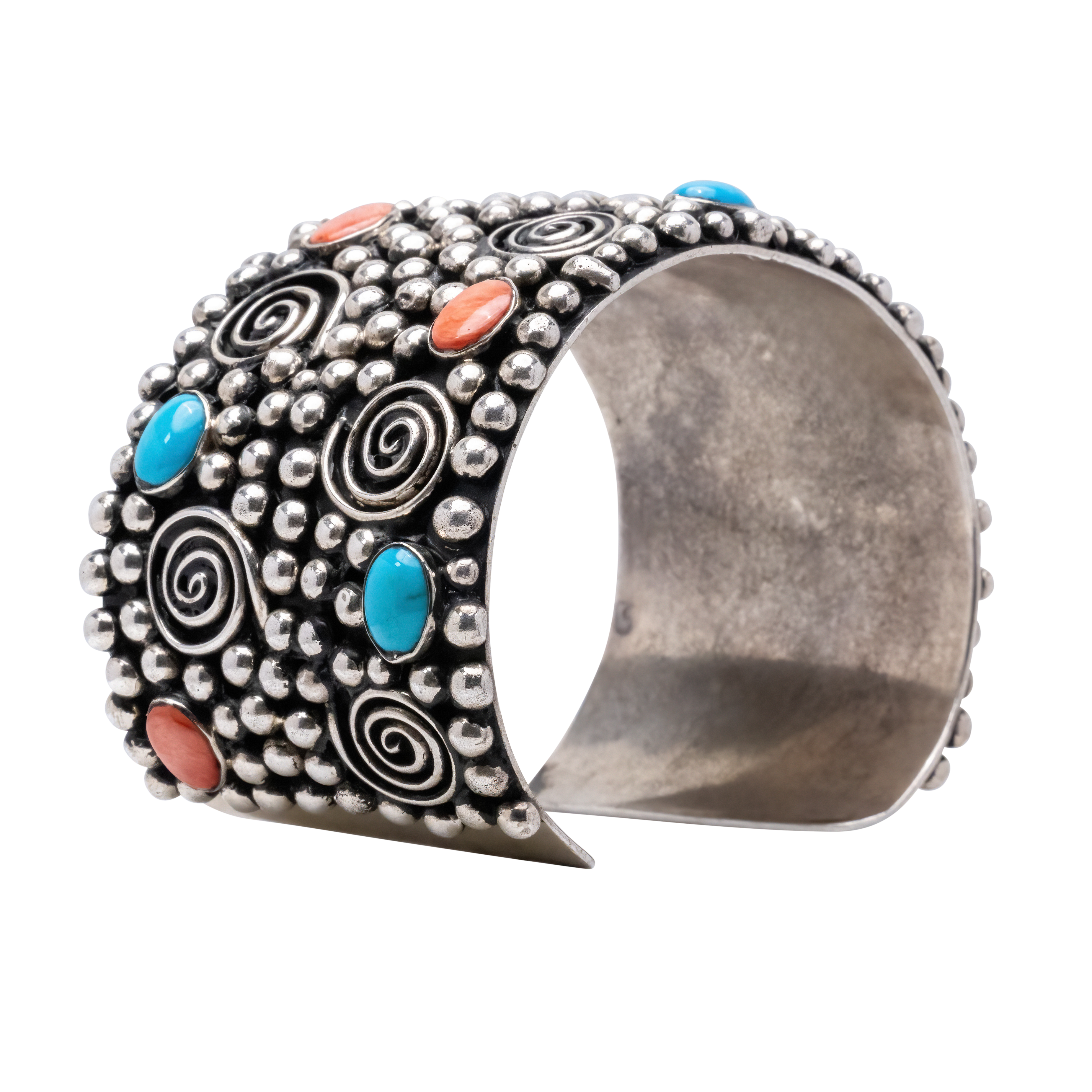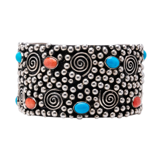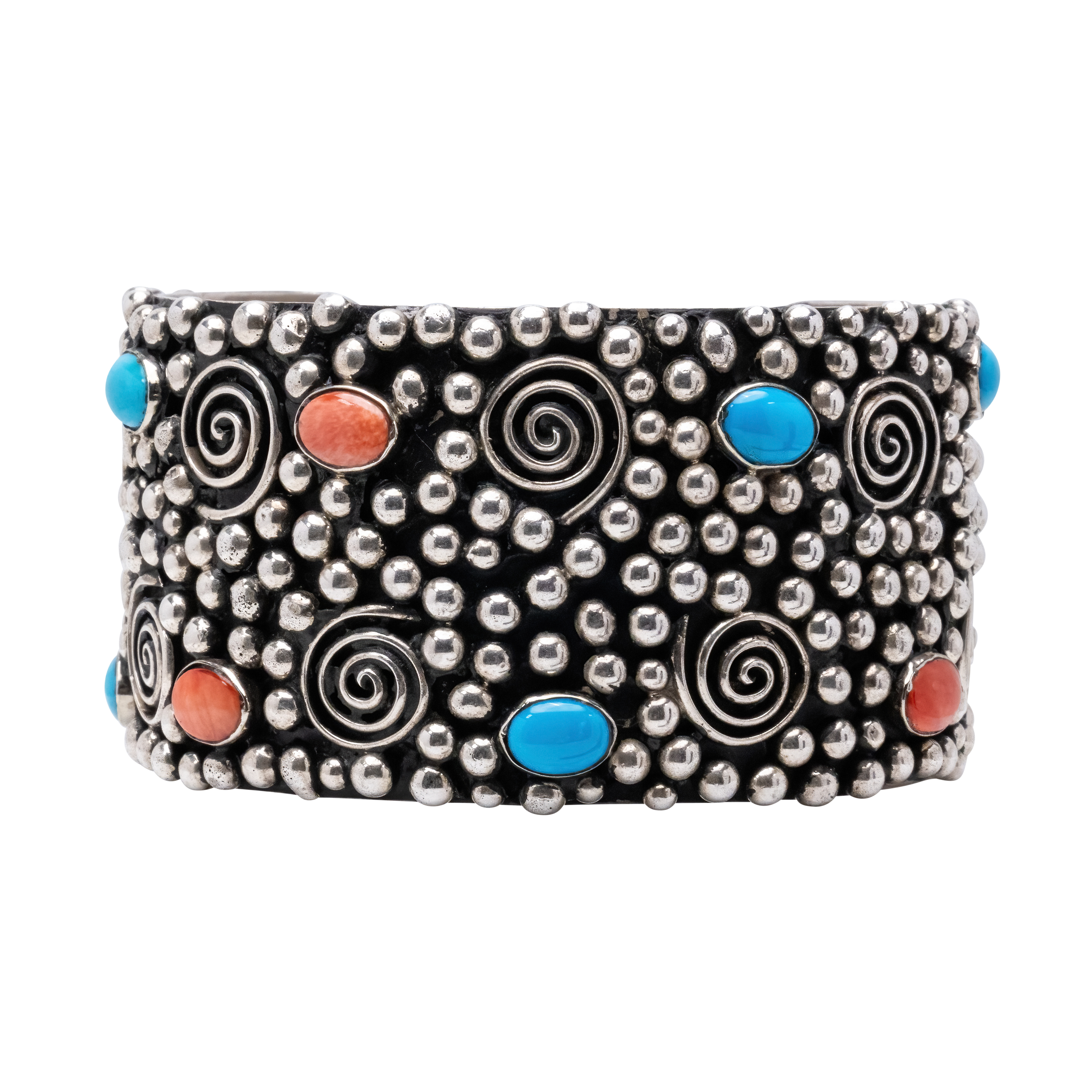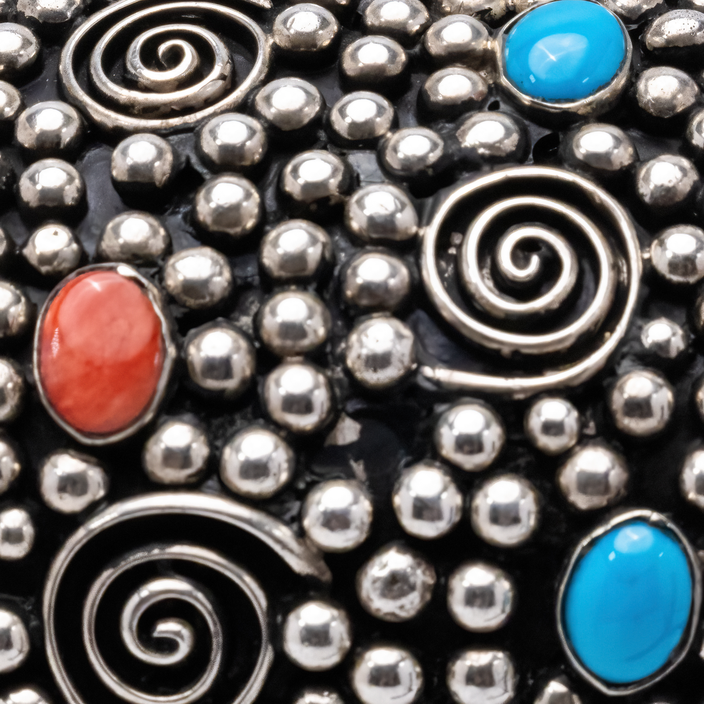 Introducing a mesmerizing creation by artist S. Ray Sterling, this bracelet is a stunning showcase of Southwest-inspired beauty and craftsmanship. Crafted with care and precision, the bracelet features a captivating maze design intricately woven with vibrant Sleeping Beauty Turquoise and fiery orange Spiny Oyster. Each stone is carefully set, adding depth and dimension to the intricate pattern. Delicate silver drops accentuate the maze, adding a touch of elegance and shine to the piece. With its rich colors and intricate detailing, this bracelet is more than just an accessory—it's a wearable work of art that embodies the spirit of the Southwest. Adorn your wrist with this exquisite creation, a timeless symbol of beauty, culture, and tradition.
