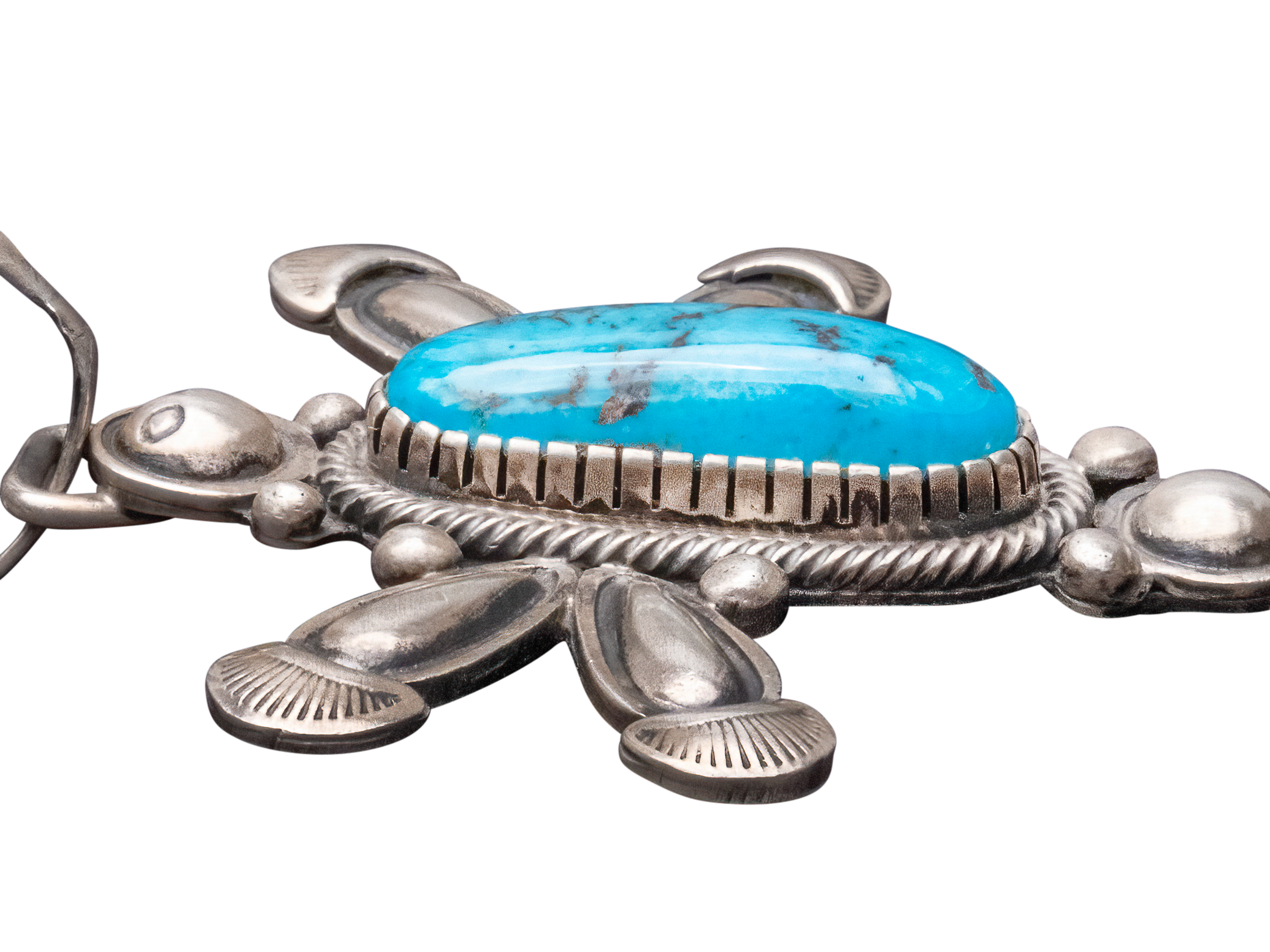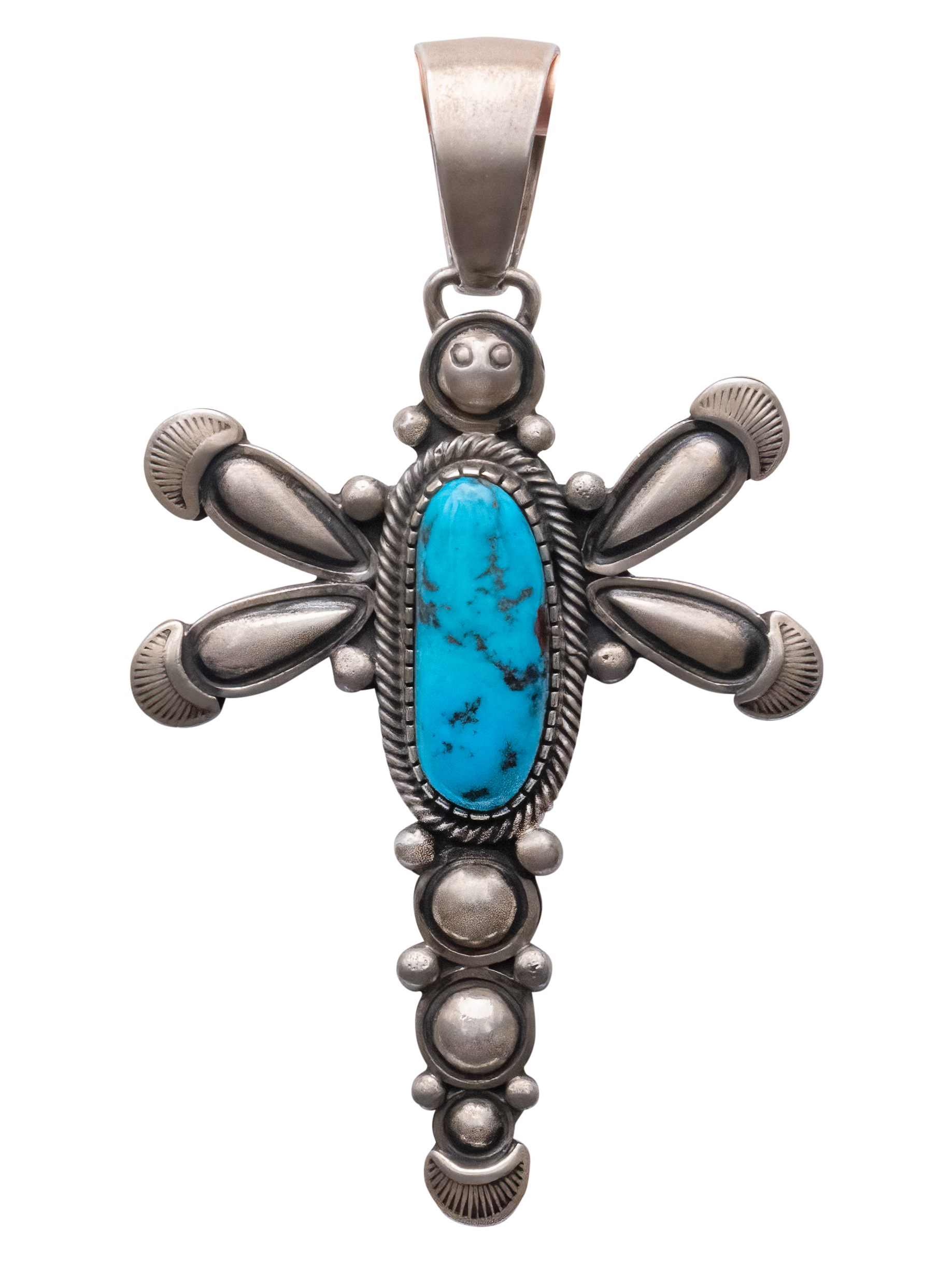 This dragonfly shaped pendant, crafted by Navajo artist Bobby Johnson, features a brilliant blue Sonoran Turquoise turquoise stone. A handmade bezel incases the stone and a twisted wire is wrapped around the bezel. But where this pendant truly gets its unique quality from, is its shape. Shaped like a dragonfly with the Sonoran Turquoise stone at the center of bold silver work that makes up the wings, head, and tail, this piece is a truly unique work of art.