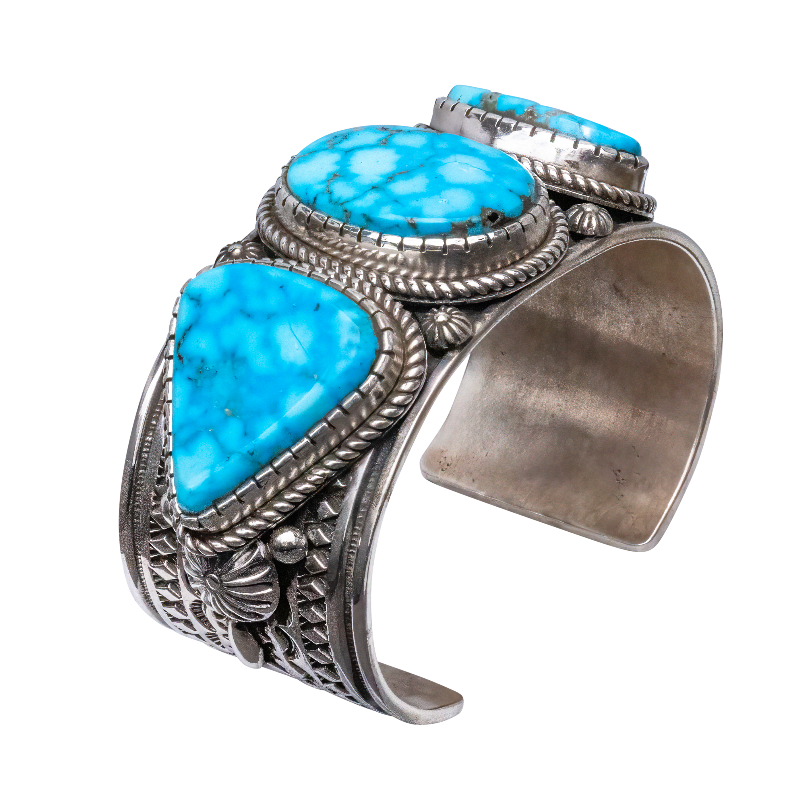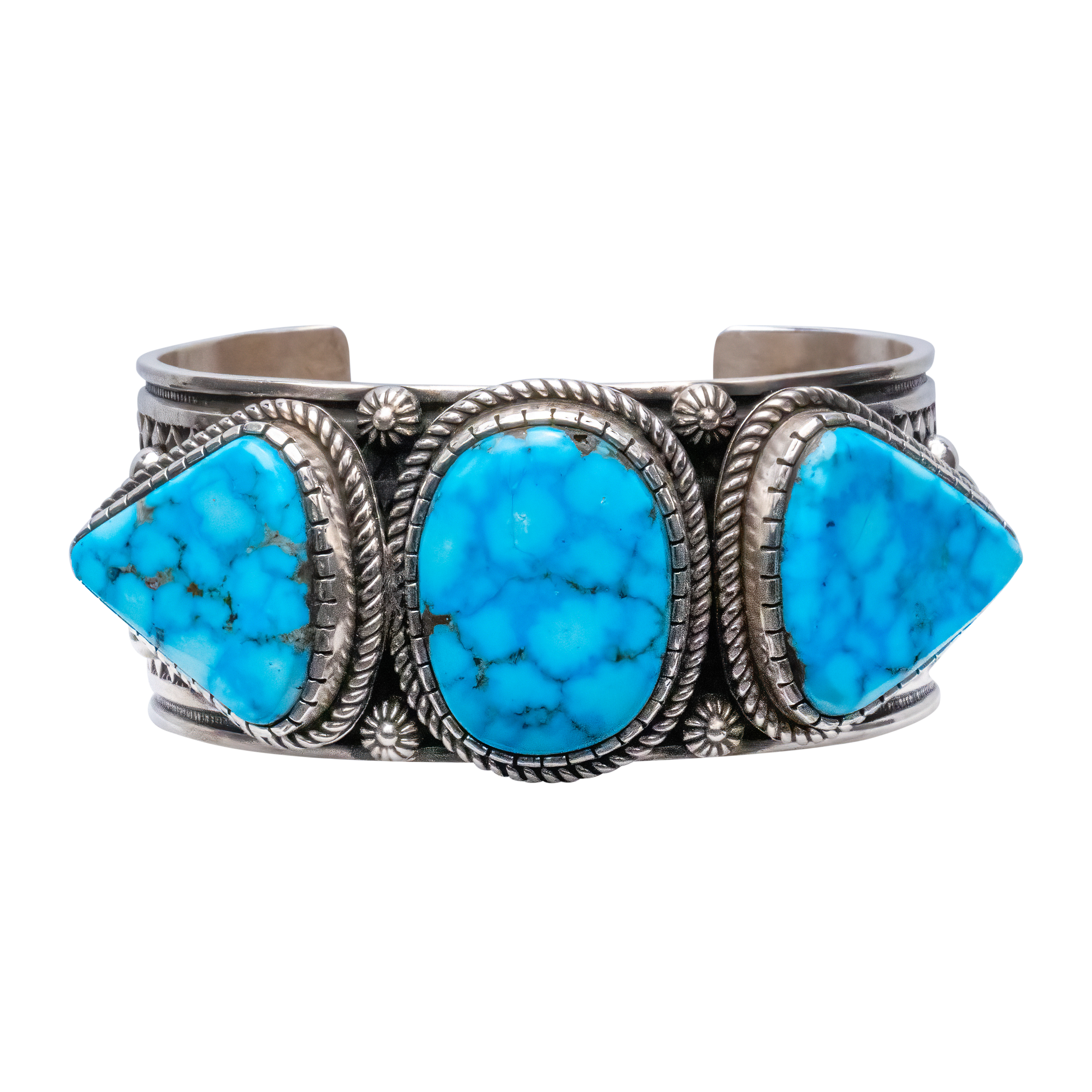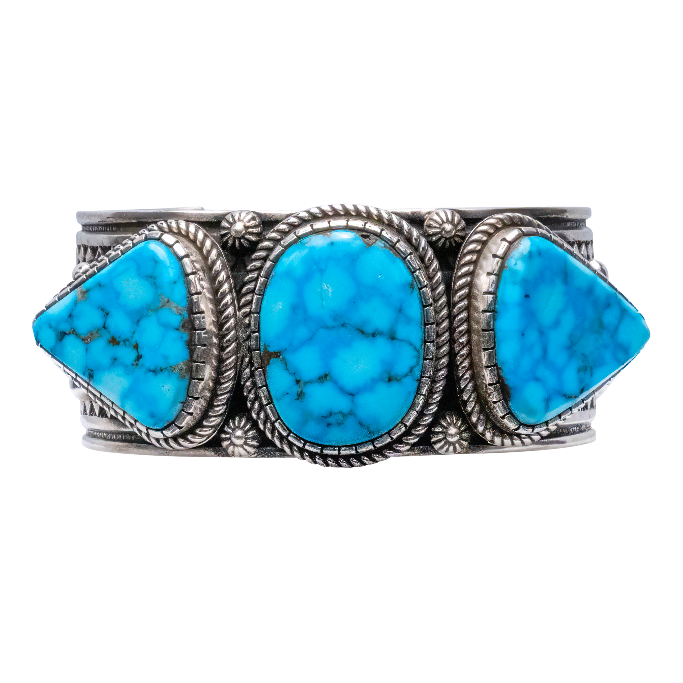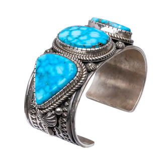 Adorn yourself with acclaimed artist Albert Jake's refined craftsmanship! This cuff that centers Birdseye Kingman Turquoise perfectly melds the earth's geologic beauty with the rich history of traditional silver-work. Featuring three turquoise stones, this piece showcases a hand-stamped rug design, stamped buttons, and silver drops. The intricate details and vibrant turquoise make this cuff a standout piece perfect for any occasion.