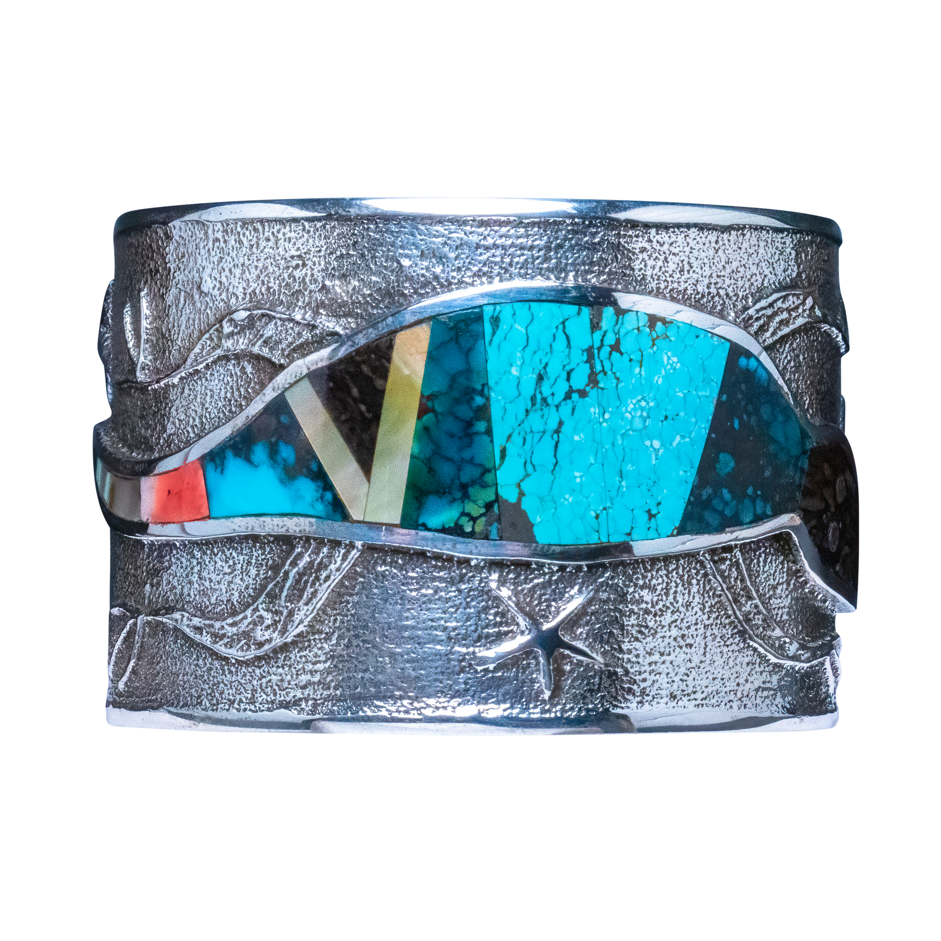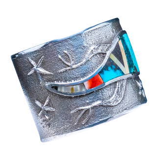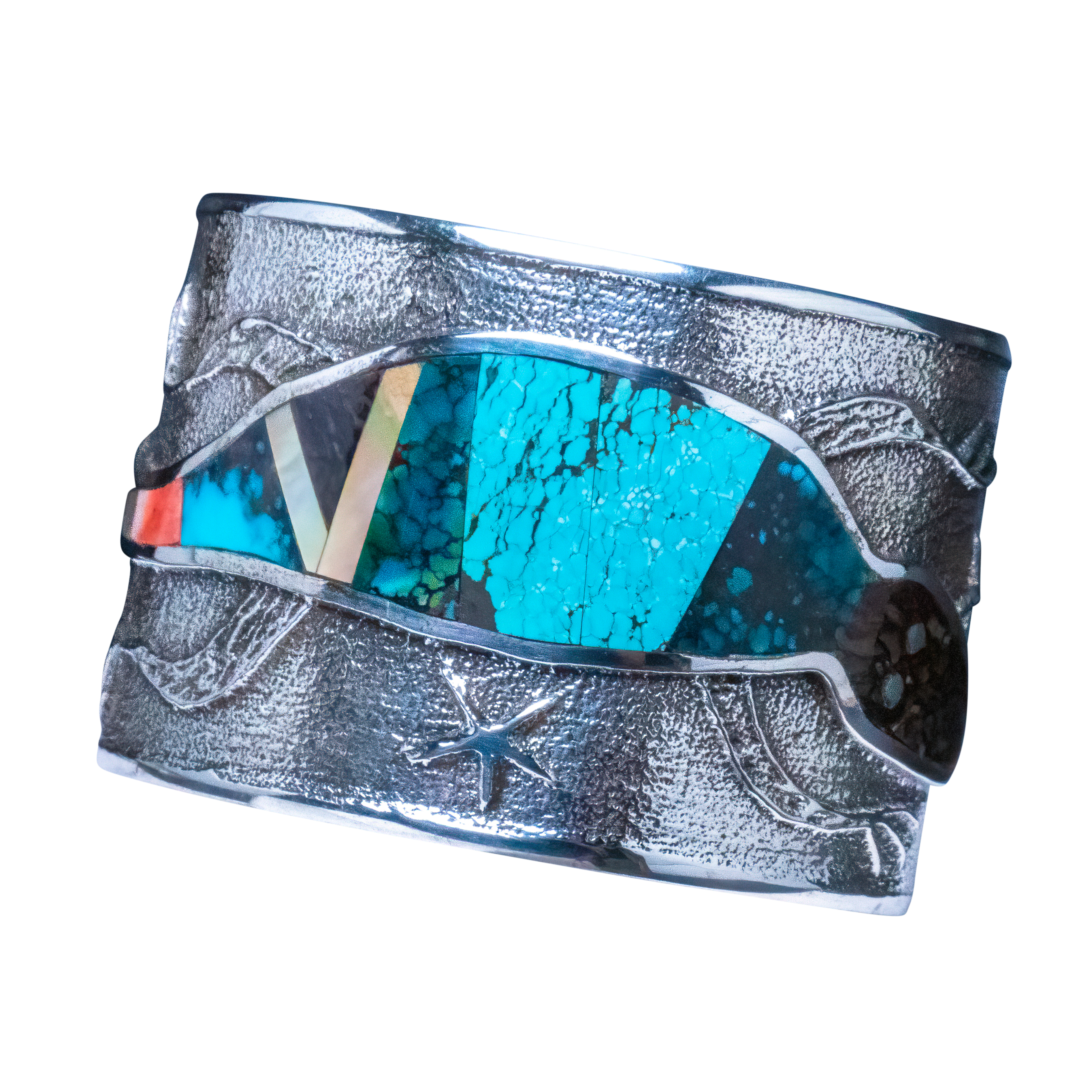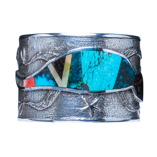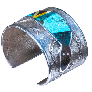 Tufa cast sterling silver with inlay of shell, opal, spiny oyster shell, and a variety of turquoise
