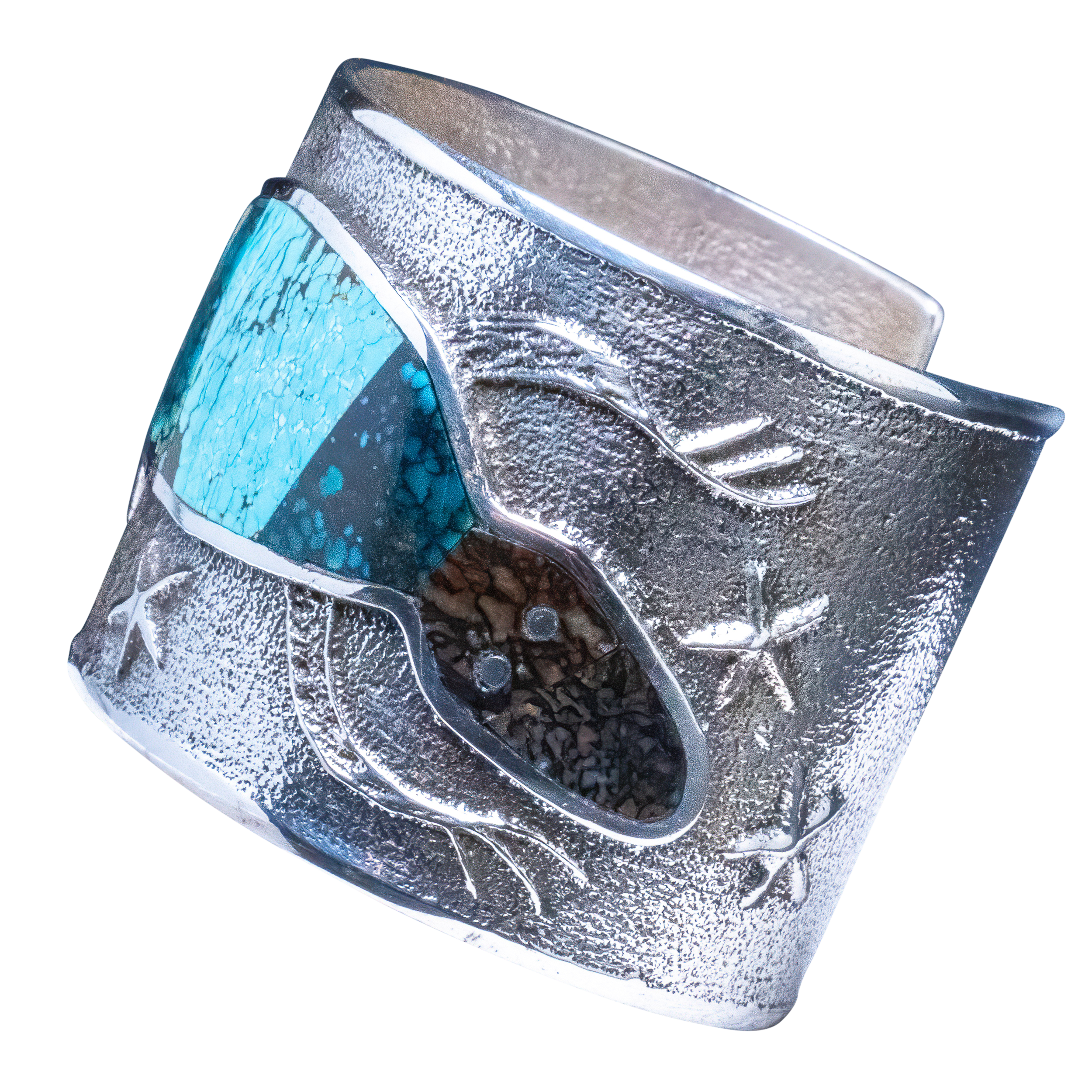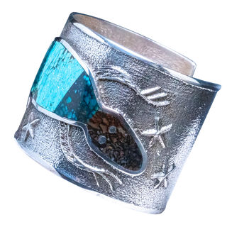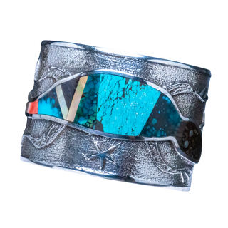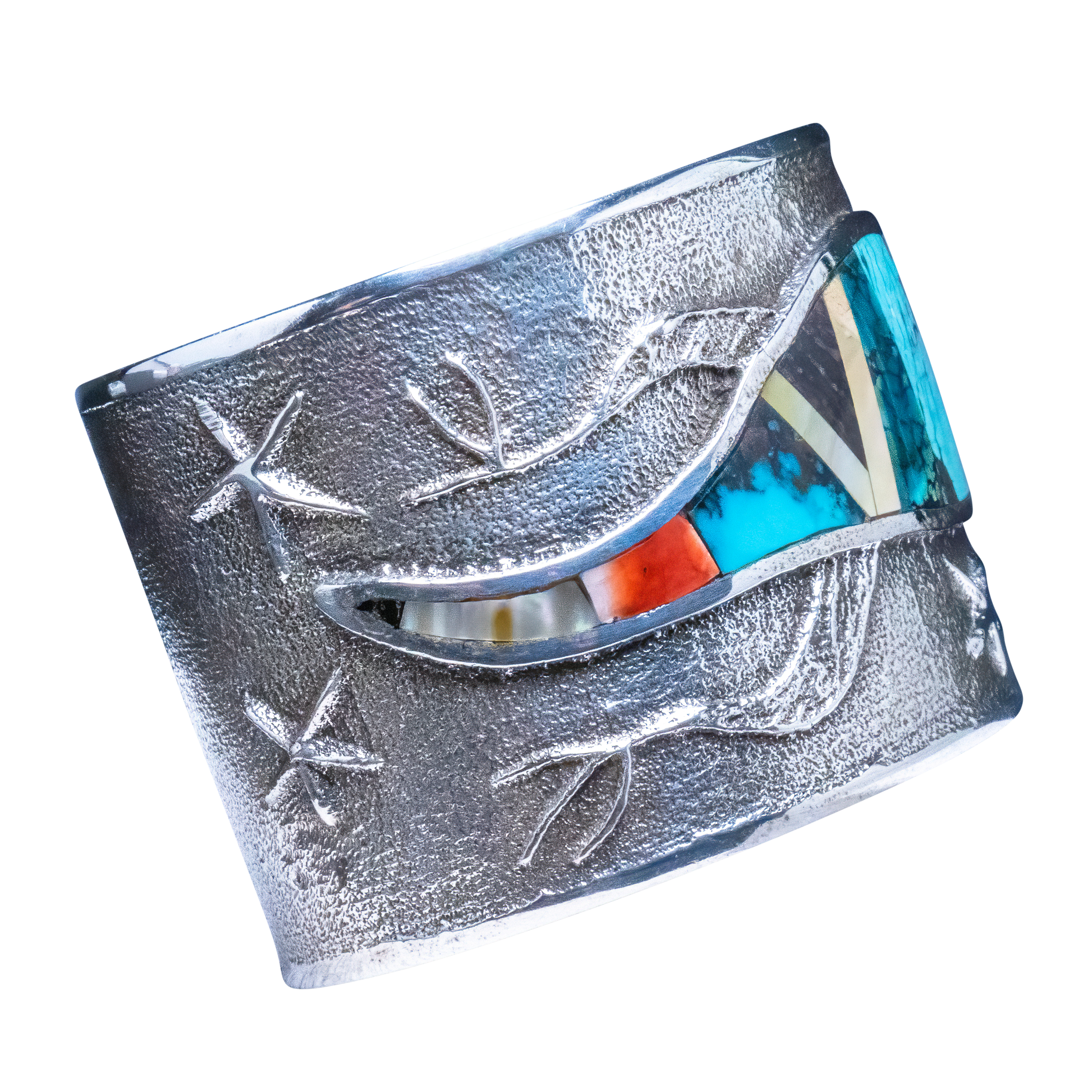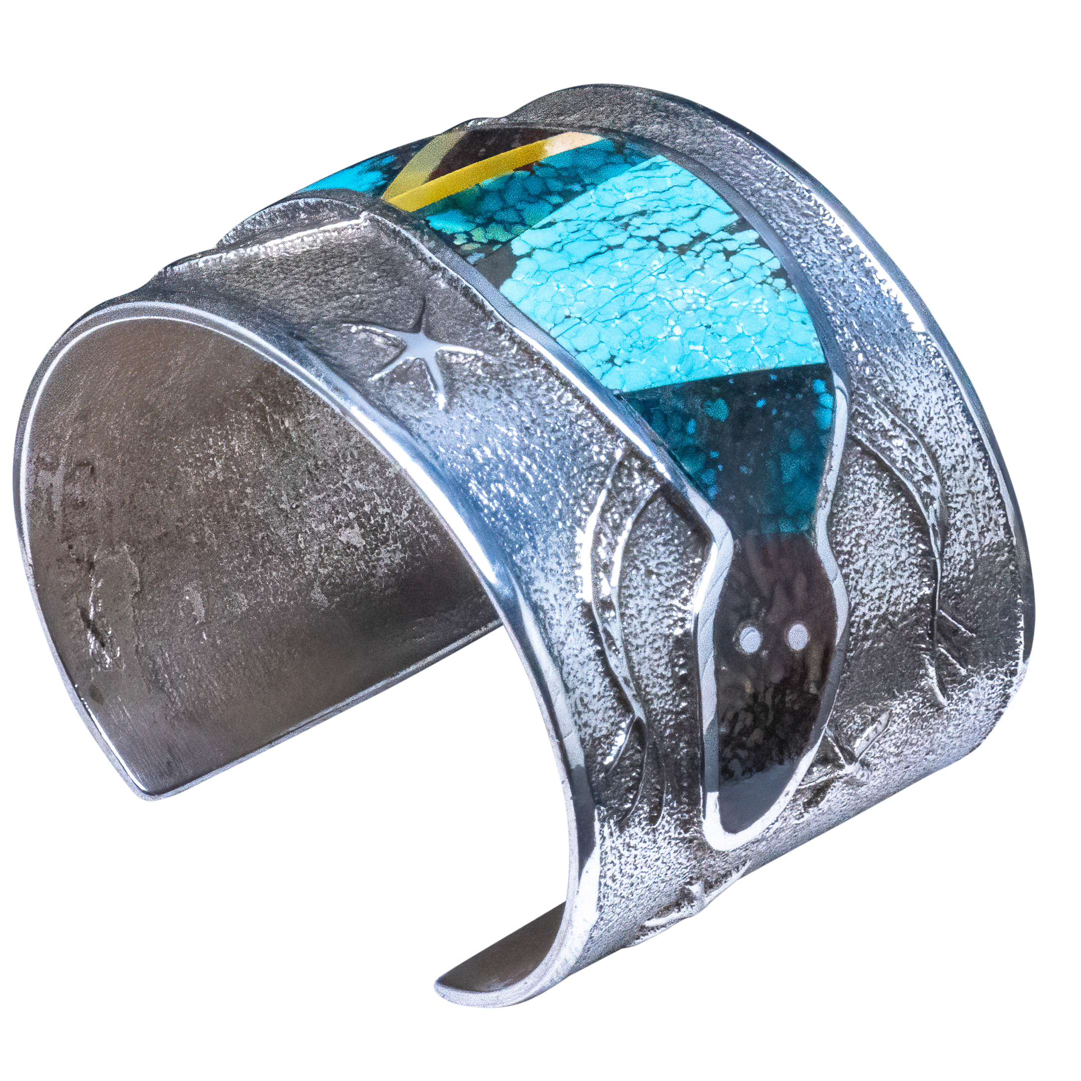 Tufa cast sterling silver with inlay of shell, opal, spiny oyster shell, and a variety of turquoise