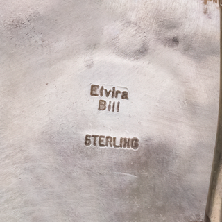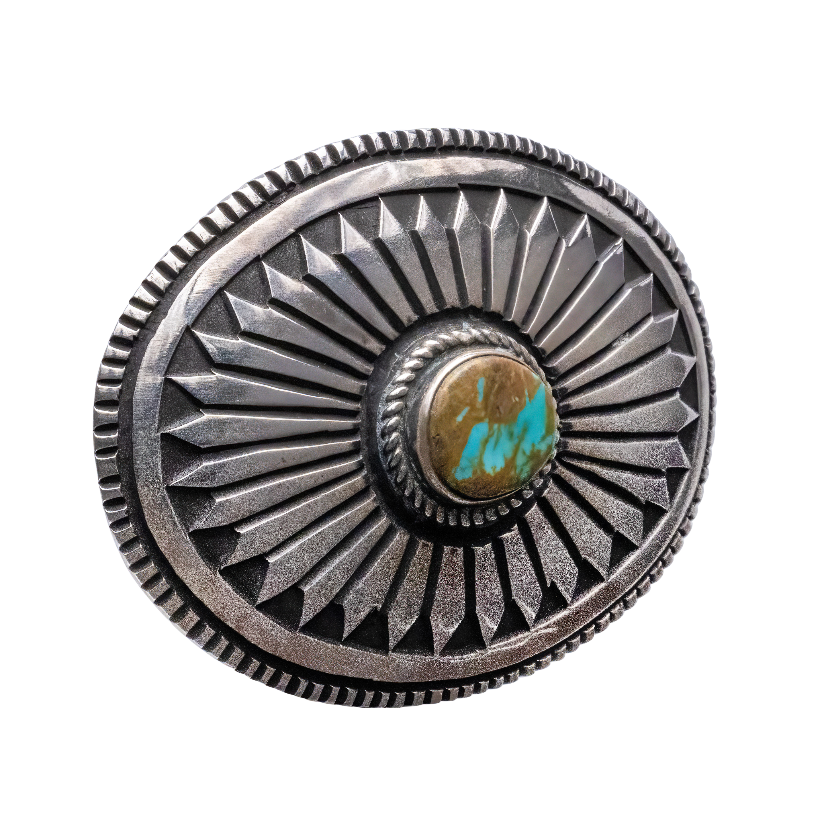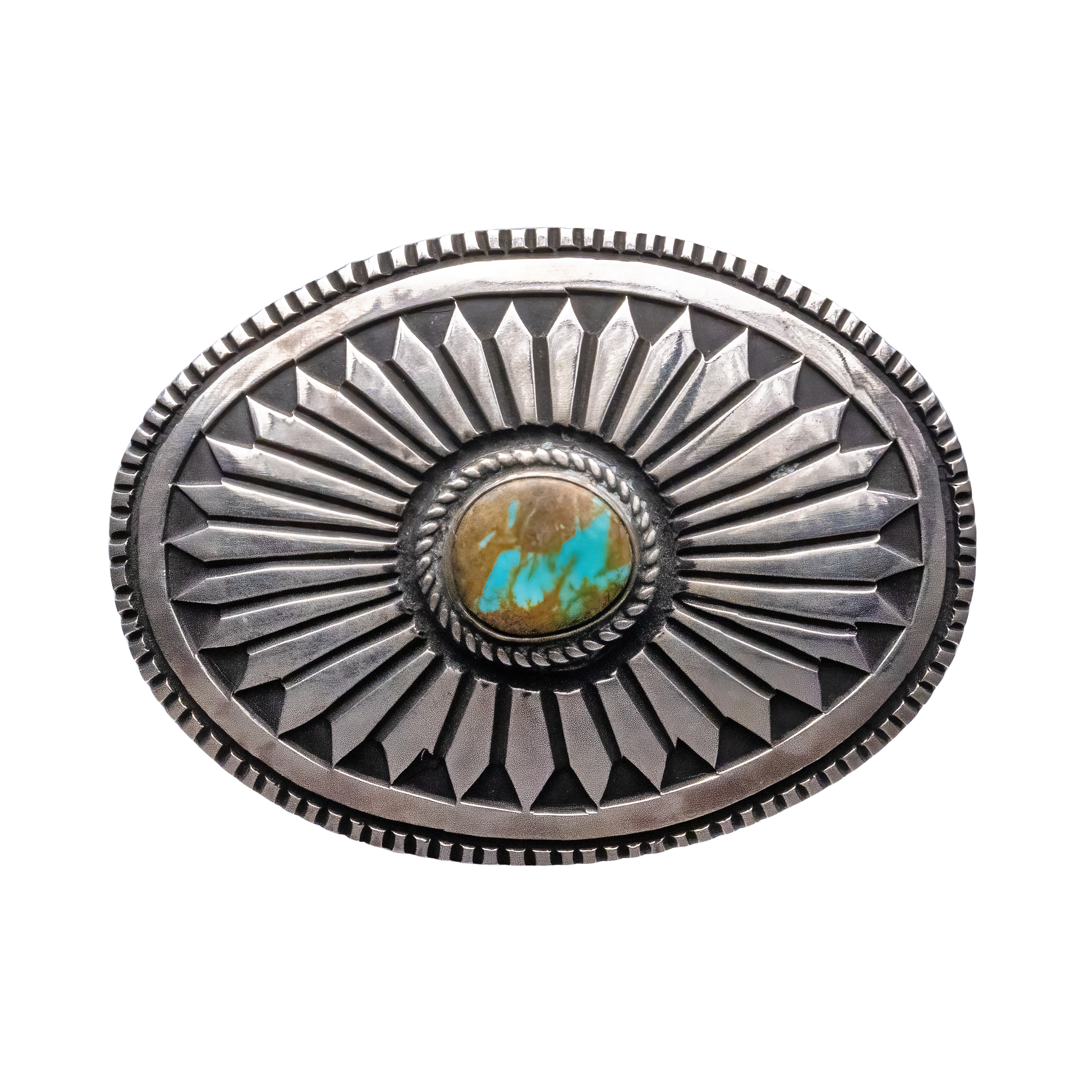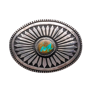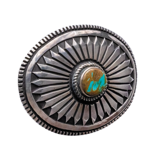Crafted by Elvira Bill, this stunning Navajo belt buckle features ingot forged silver expertly decorated with designs hand-stamped into the sterling silver. A Royston Turquoise center stone adds a striking blue accent enhanced by delicate, twisted wire details and the turquoise's earthy matrix. Bill's craftsmanship shines in this piece; he balances the stunning turquoise stone with elegant silver-work to create an immersive design. This belt buckle is an eye catching addition to any outfit.