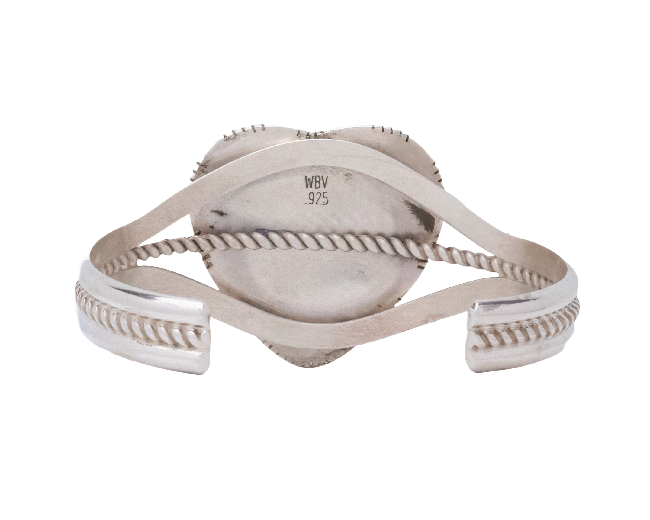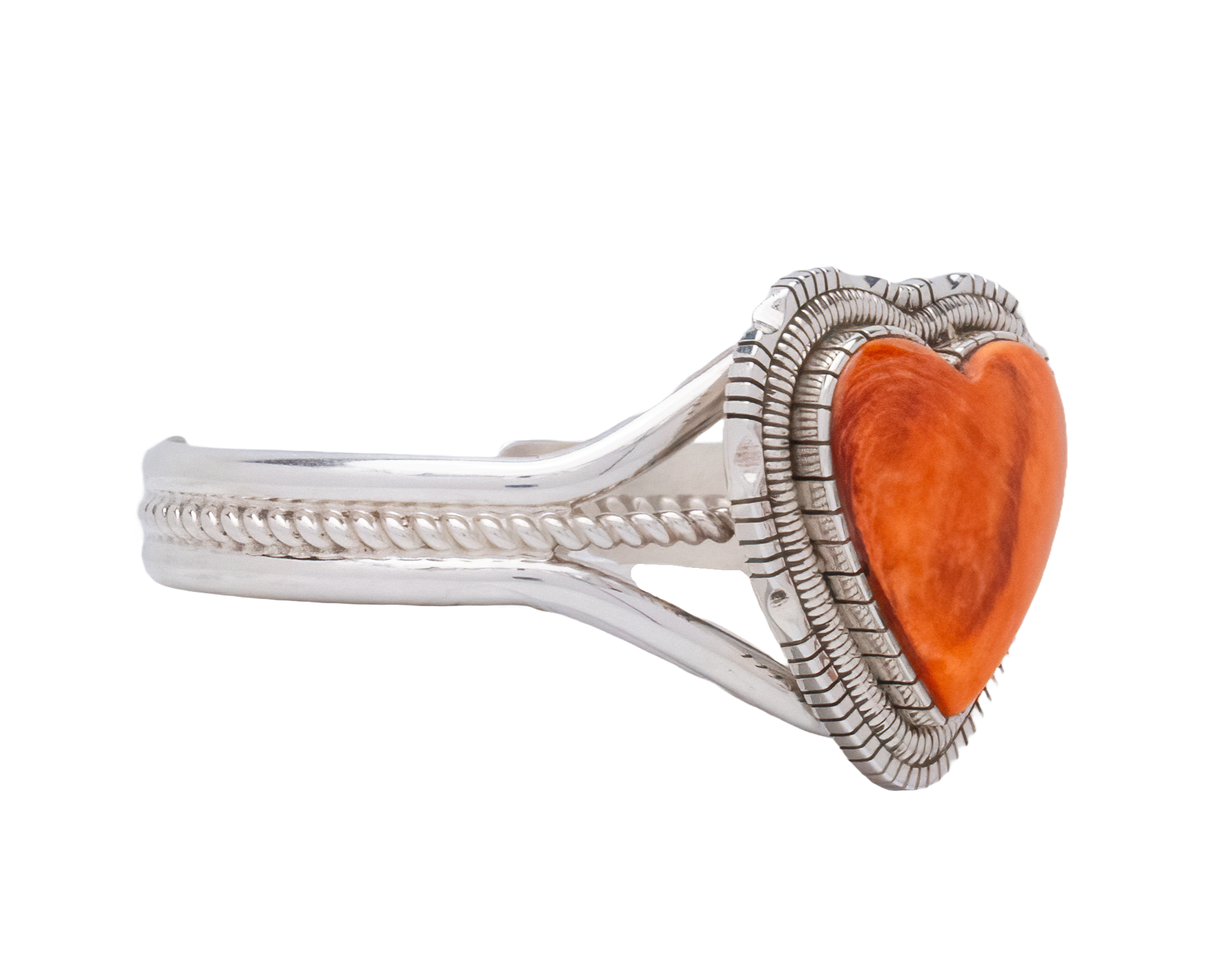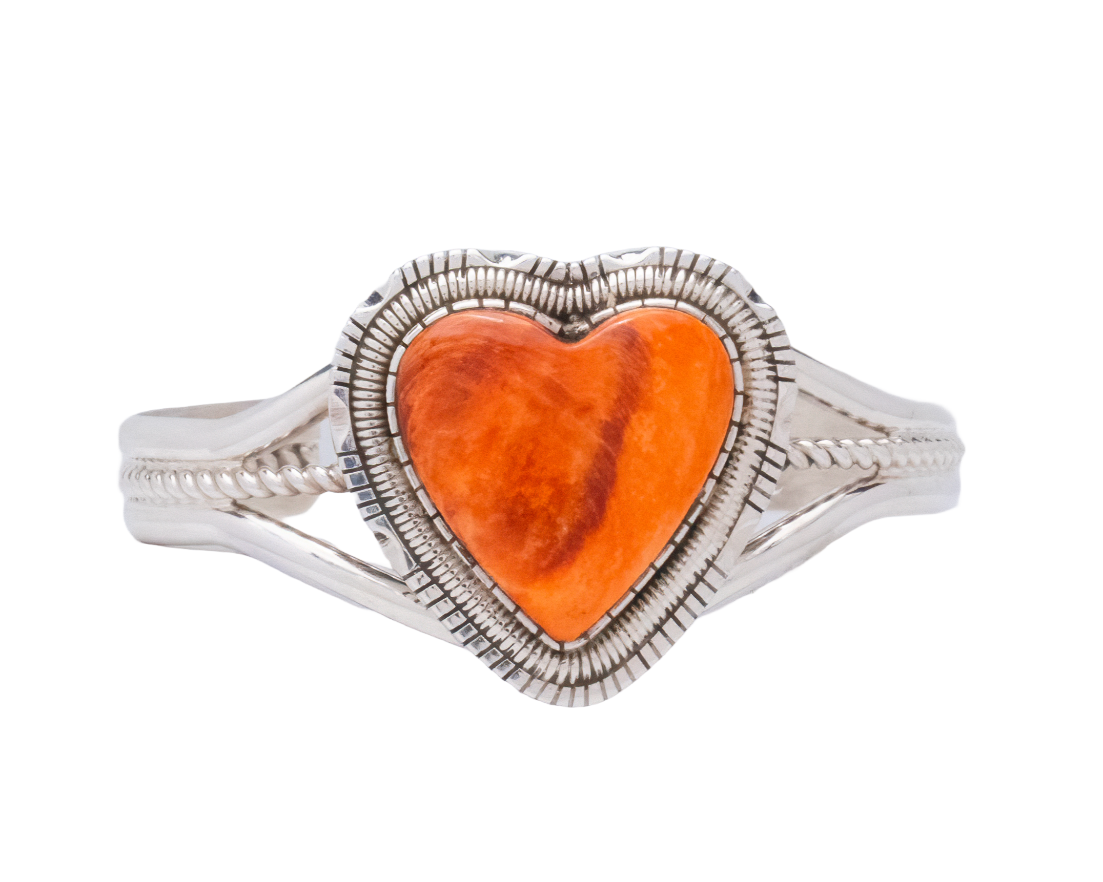 This gorgeous bracelet was crafted by Navajo artist Will Vandever. An orange spiny oyster shell cut into a heart-shape holds center place. Hand-stamped details and hand-cut designs make this piece truly unique. With the bright orange hues of the spiny oyster shell serving as the centerpiece of this bracelet and Vandever's detailed artistry, it is truly a captivating piece.