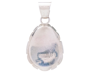 This pendant was expertly crafted by Navajo artist Melvin Francis. Featuring stunning Royston Turquoise and bold silver-work, this pendant is yet aesthetically impactful. Twisted wire wraps around the Royston Turquoise stone, nestled in a geometrically rich surround, giving this piece a sophisticated look and elevating the turquoise's natural beauty with the contrasting sterling silver. This is definitively an accomplished work of art.