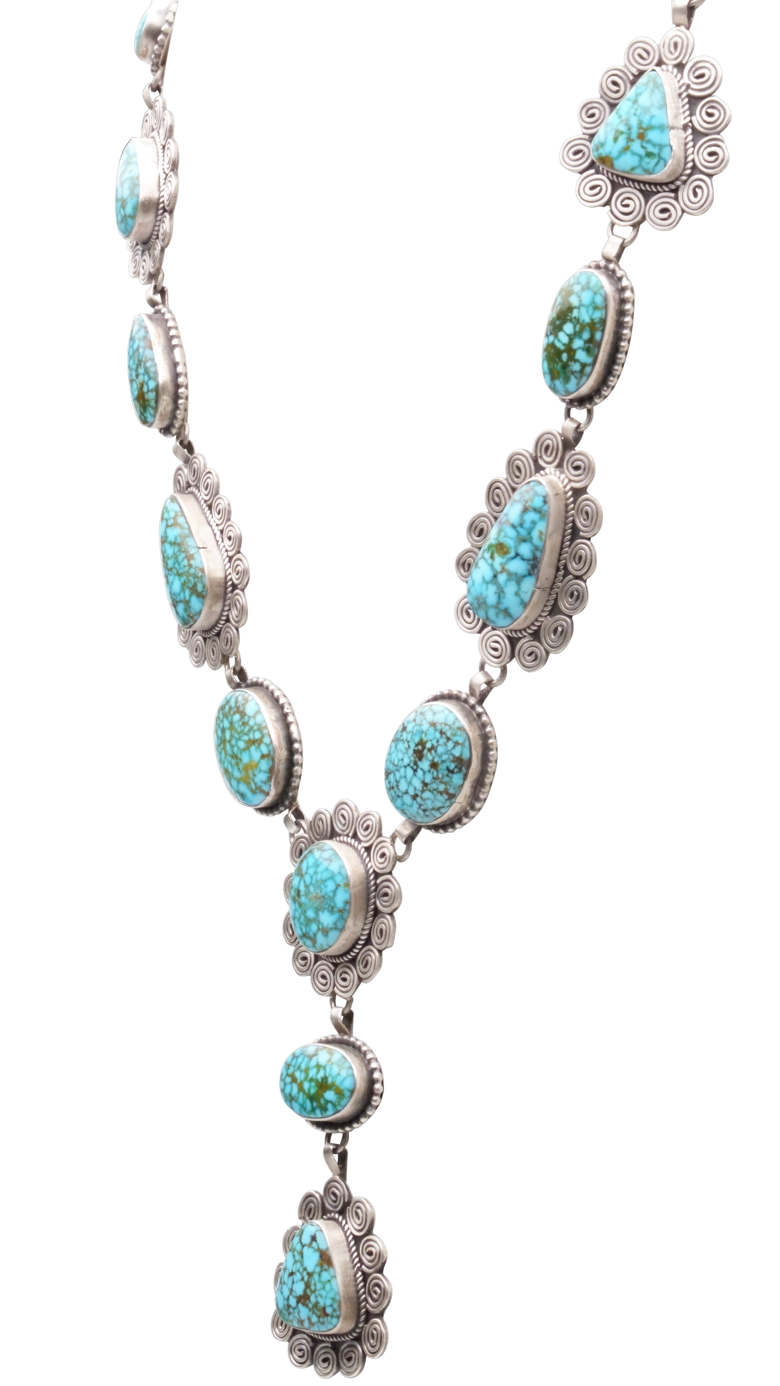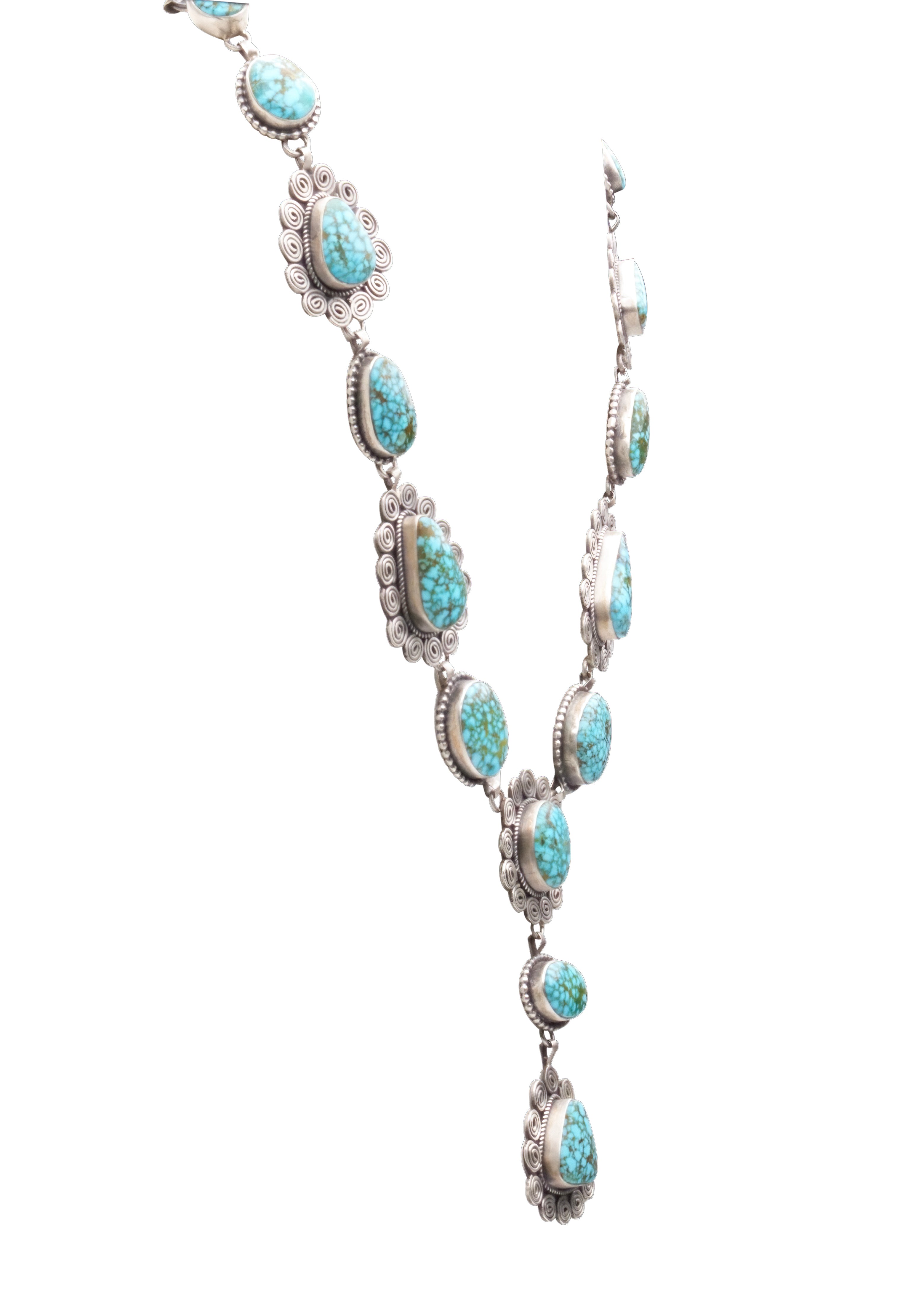 Enchant your style with this Birdseye Kingman turquoise lariat necklace, where elegance meets the enchantment of the desert. Each turquoise gemstone in this handcrafted masterpiece tells a story of natural beauty, set within gleaming silver that reflects both tradition and individuality. It's