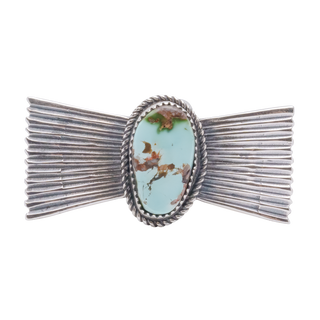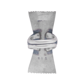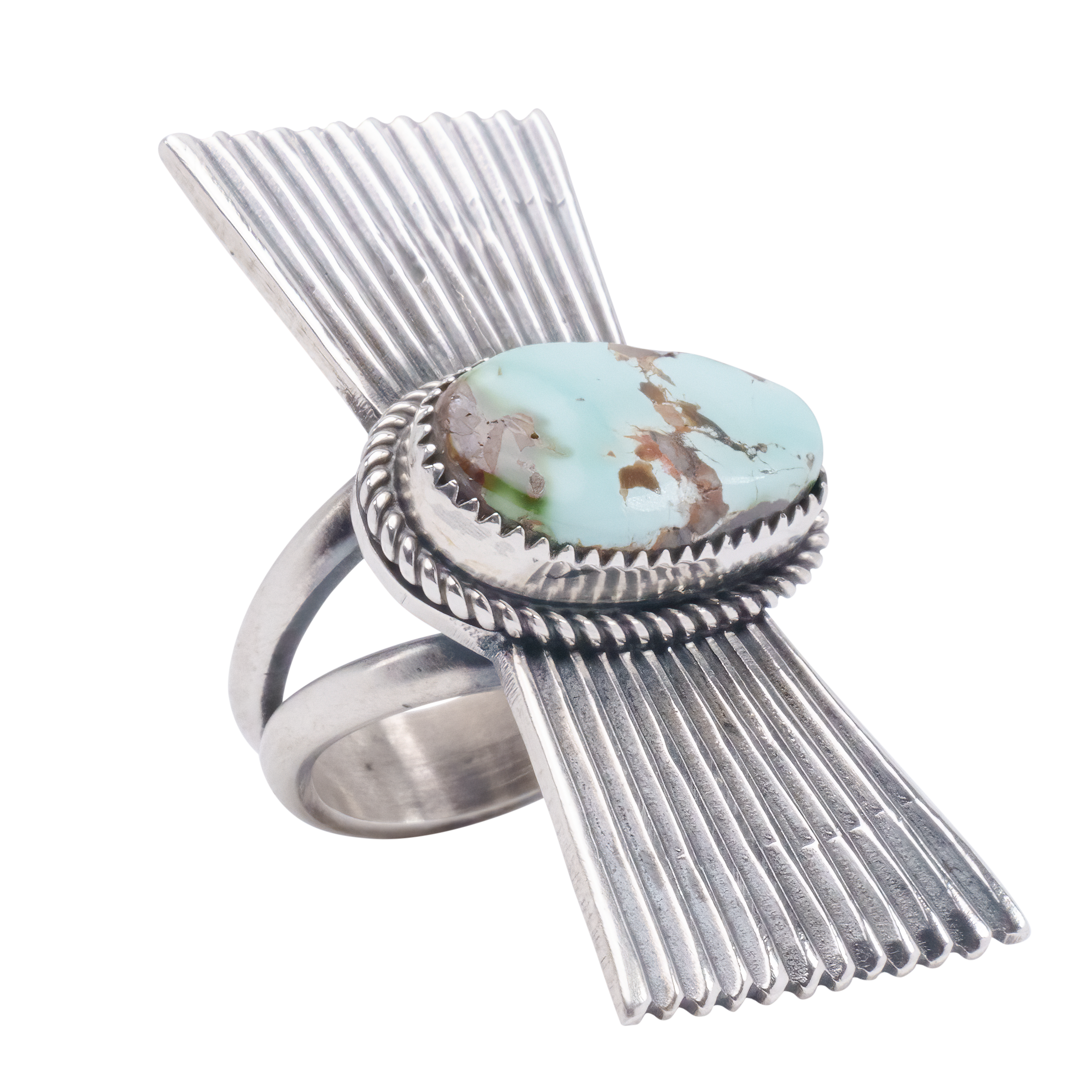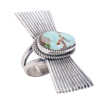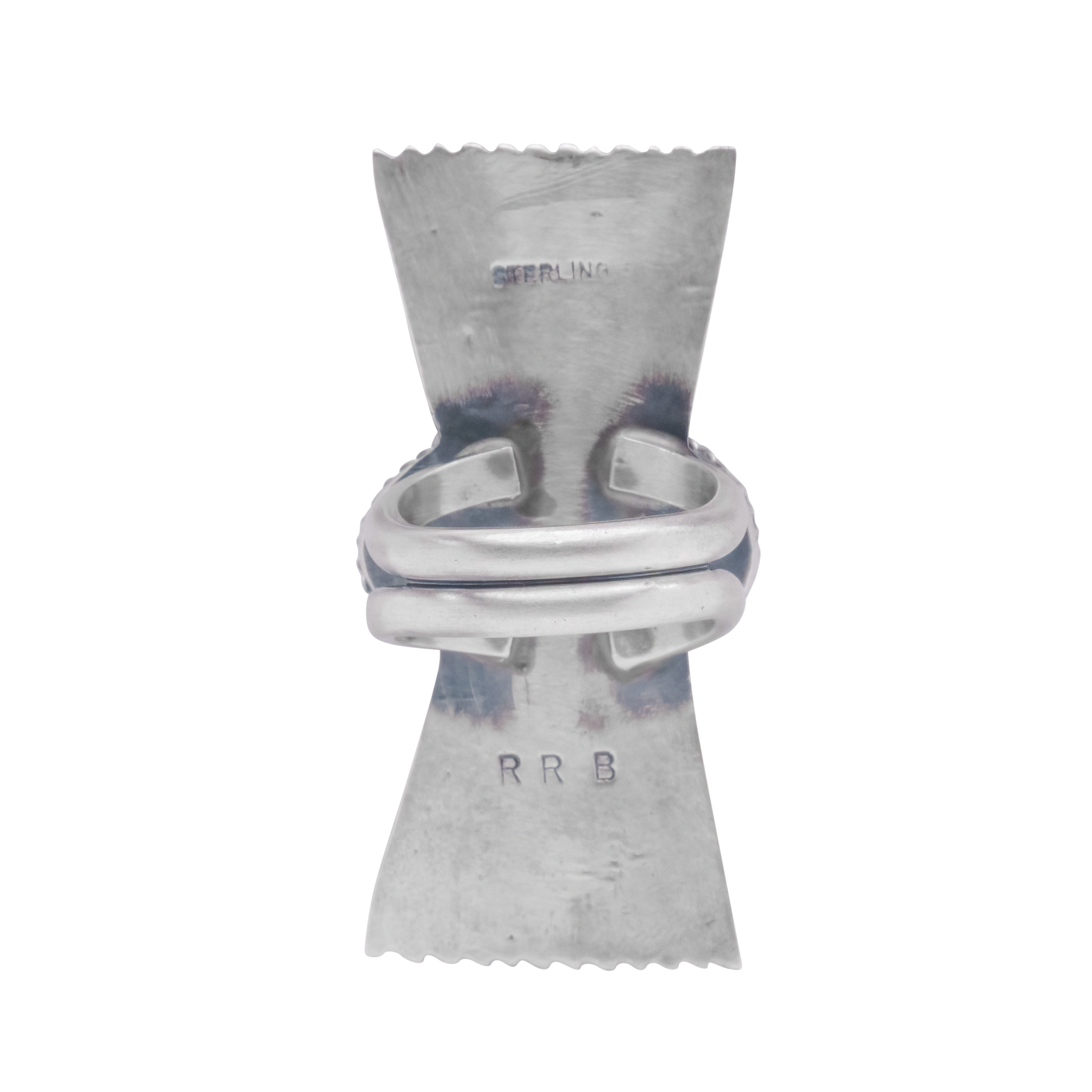 Crafted with ingenuity and passion, this spirited ring by skillful Navajo jeweler Reeda R. Begay features a gorgeous Royston turquoise gemstone accentuated by sterling silver sawtooth and rope style bezels, as well as intricate hand sculpted details. Adorn yourself with this exquisite attention-grabbing statement piece.