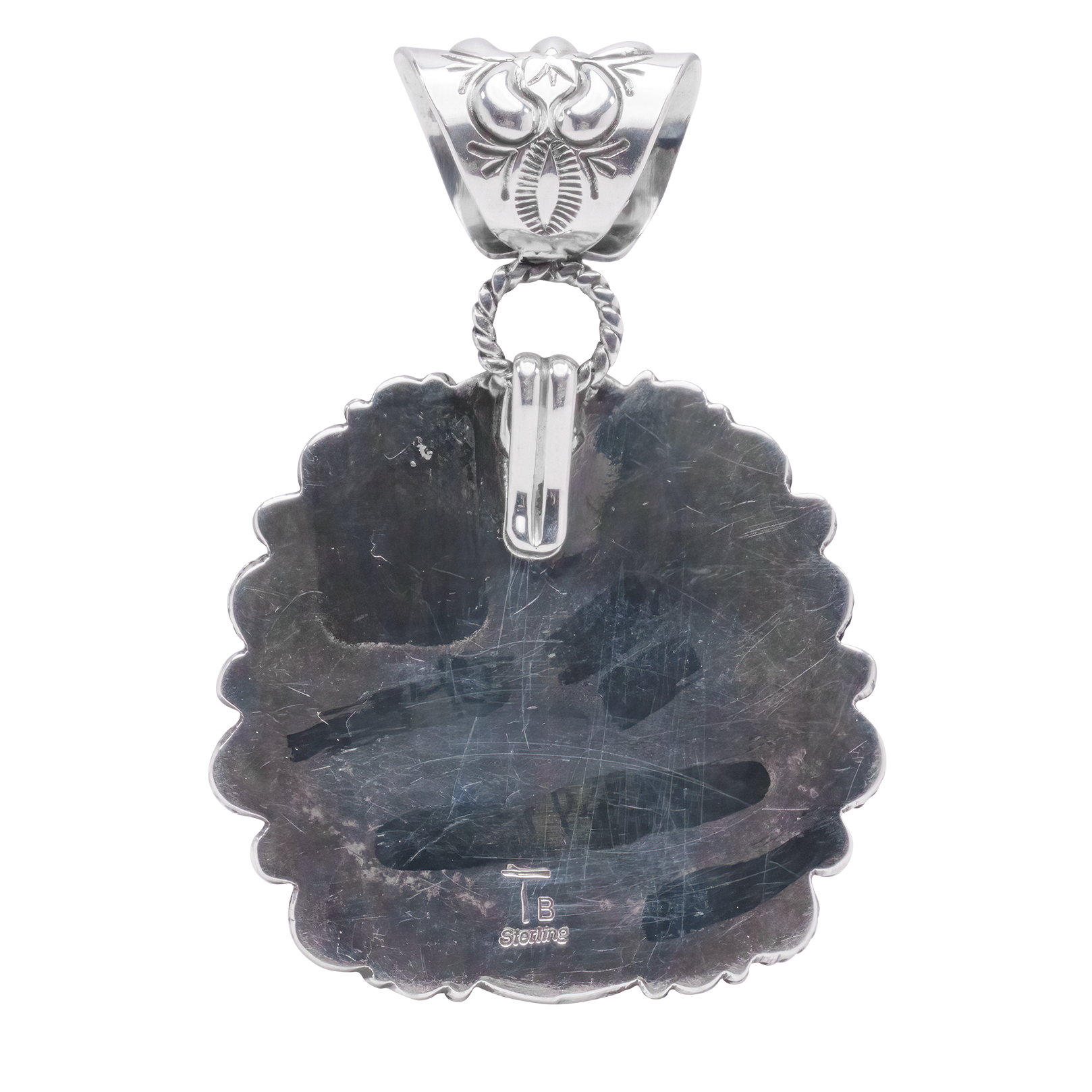 Indulge in the captivating beauty of the Southwest with this exquisite pendant handcrafted by Navajo jeweler Tyler Brown. This striking piece features a unique Kingman turquoise gemstone as its focal point, encircled by a radiating arrangement of bright red coral cabochons, all accentuated by intricate sterling silver details.