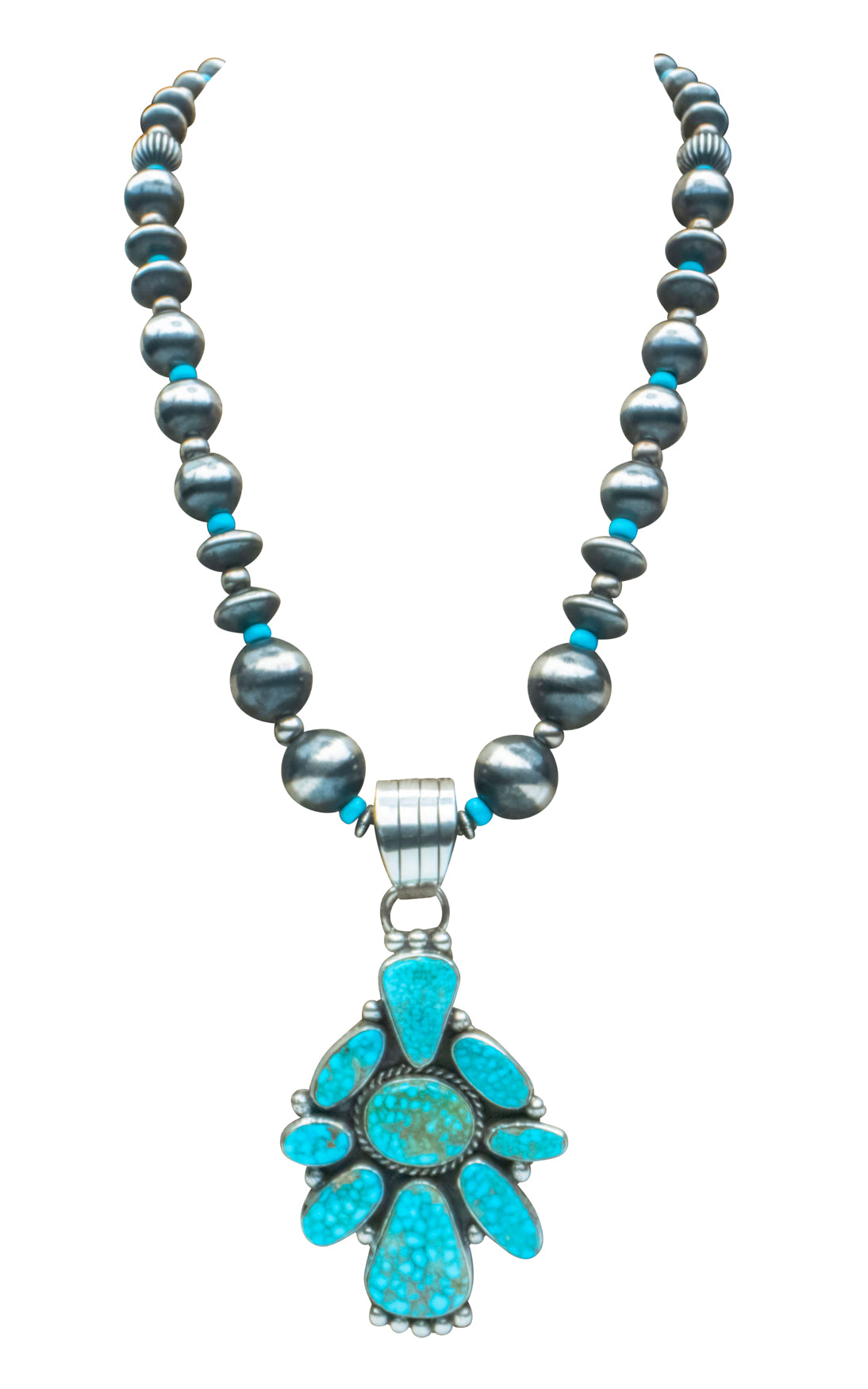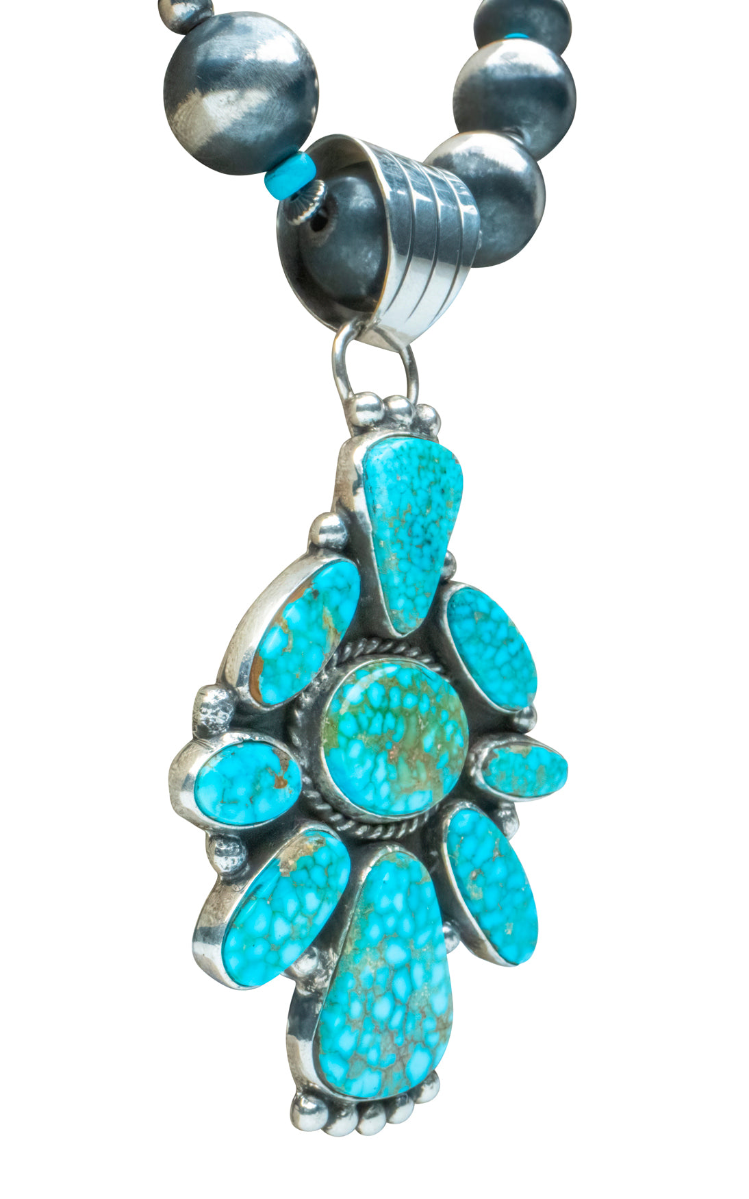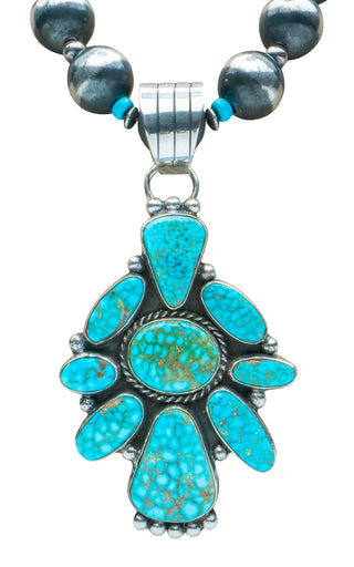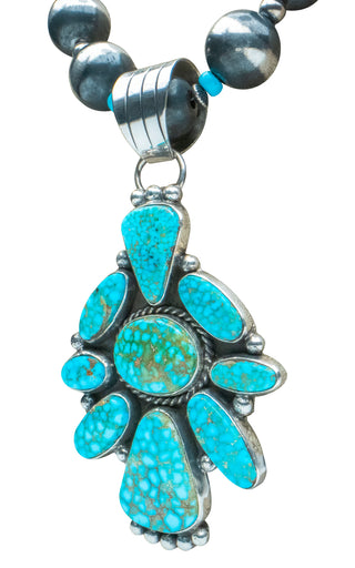Indulge in the mesmerizing beauty of the Southwest! This handcrafted pendant showcases a Birdseye Kingman turquoise pendant, suspended from a graceful Navajo Pear accented by Sleeping Beauty turquoise beads. Every element is handcrafted to perfection.