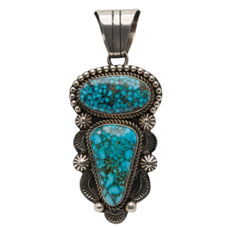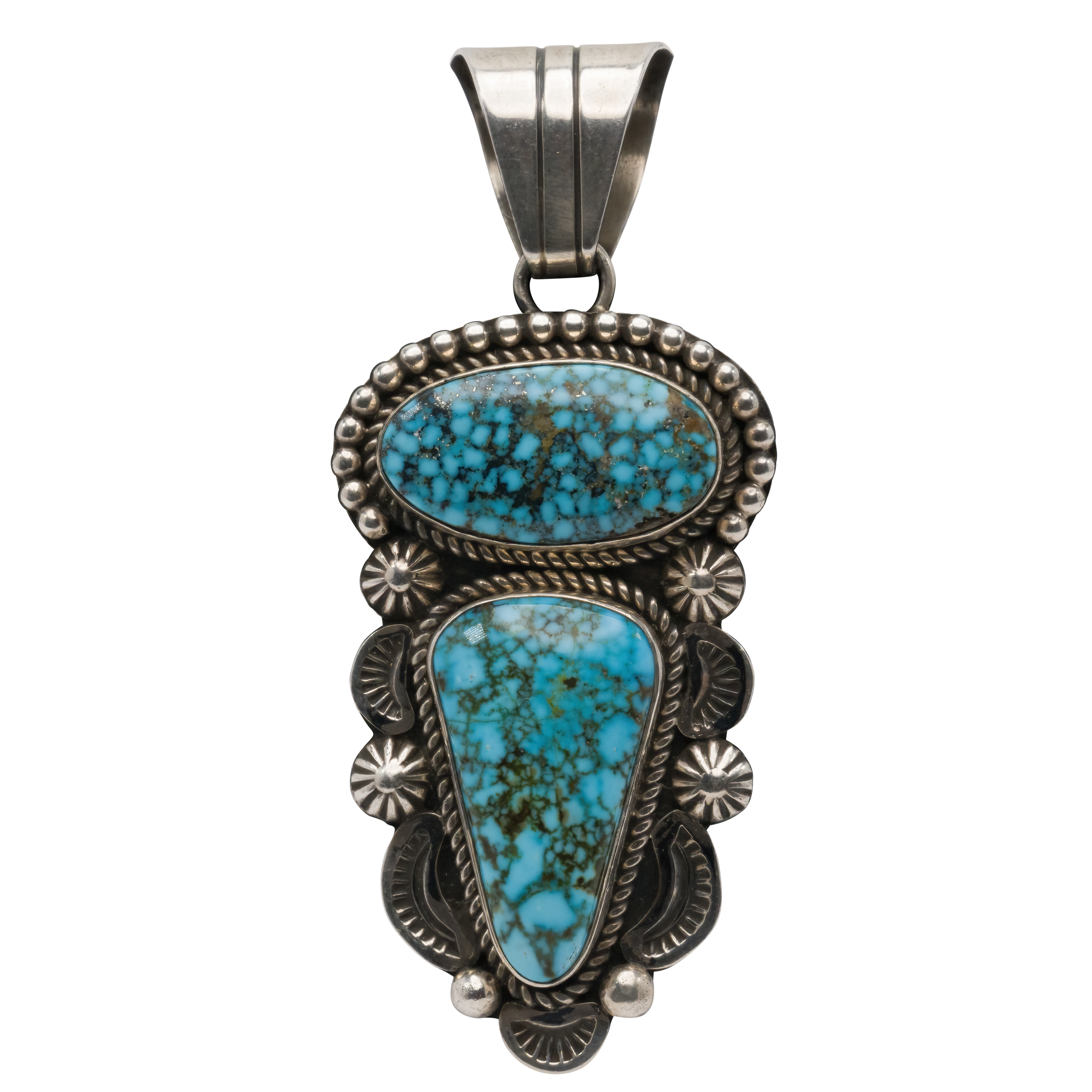 Handcrafted by Mary Ellen, this pendant is a celebration of elegance that features Kingman Turquoise encased in sterling silver. The stones' beautiful, bold blue hue and stunning gold and brown matrix shines! The intricate shell and flower designs add traditional beauty, creating a piece that is as beautiful as it is symbolic and making this pendant a beloved piece for anyone who appreciates the fine art of silversmithing.
