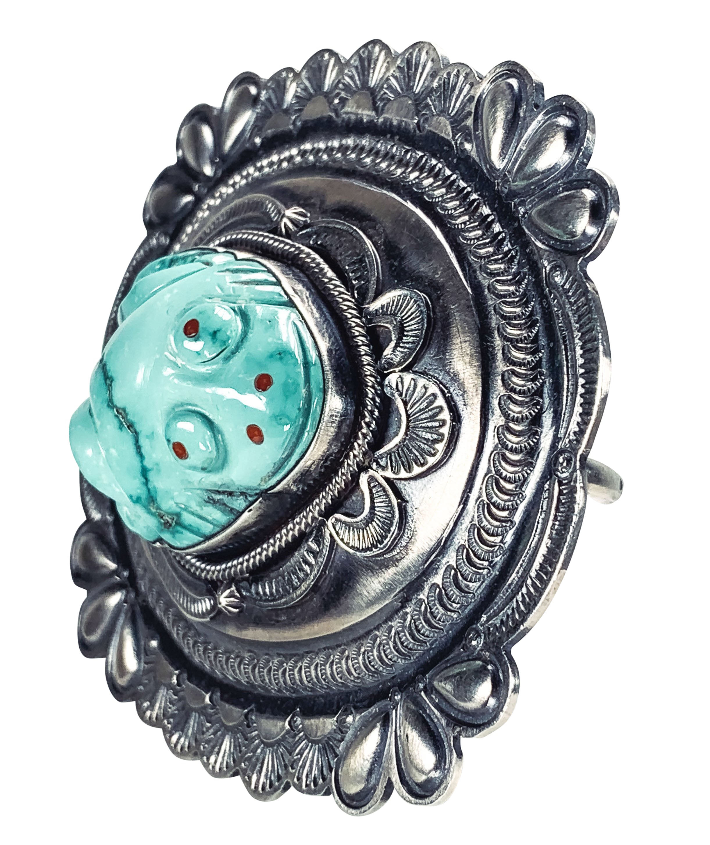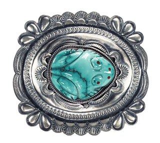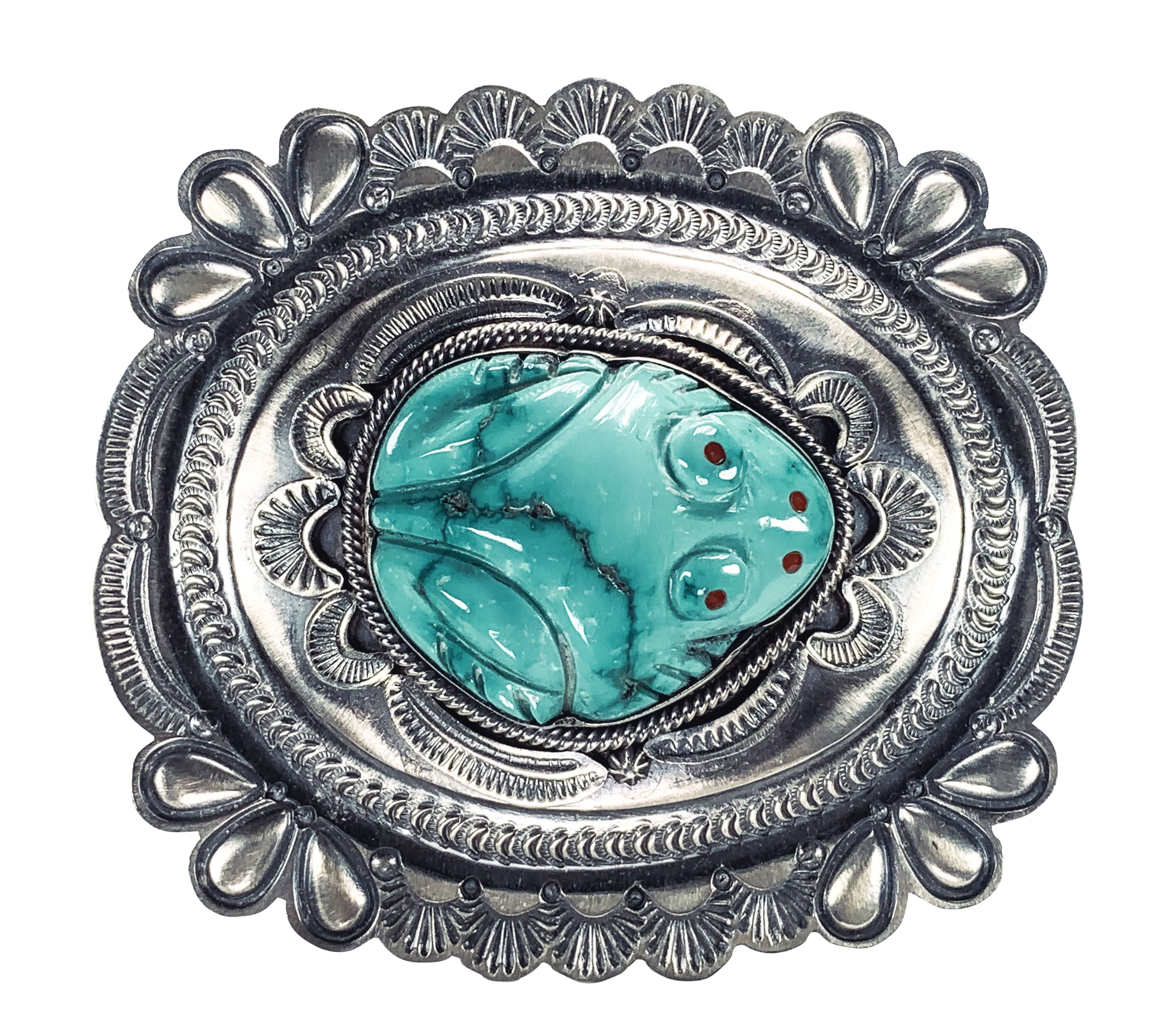 Sterling silver with Kingman turquoise and coral buckle (Collaboration with Pete & Dinah Gasper's frog fetish)