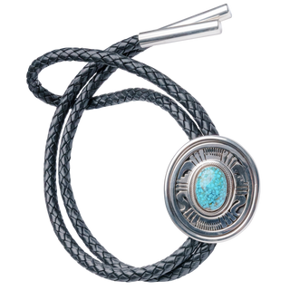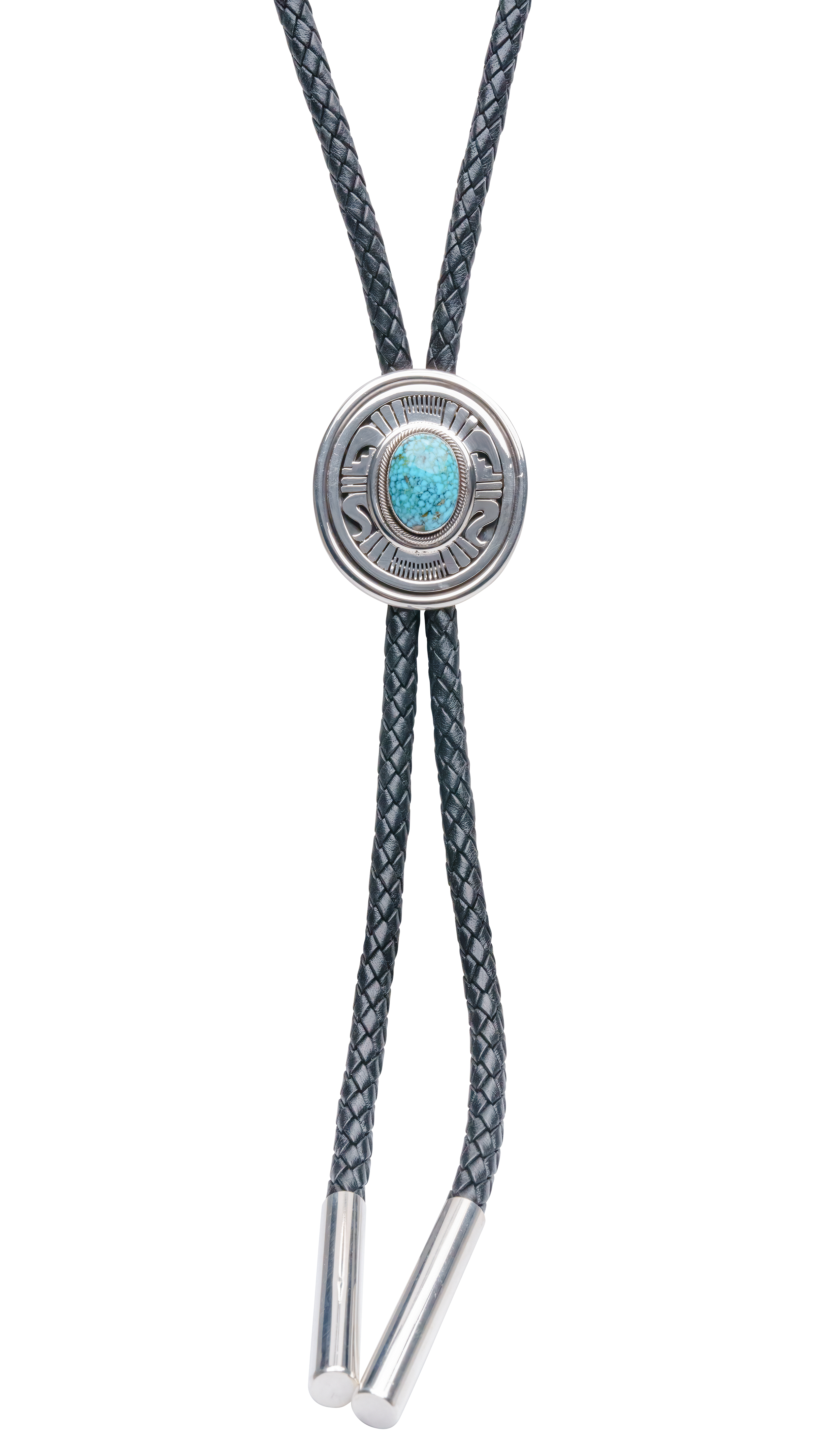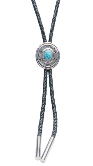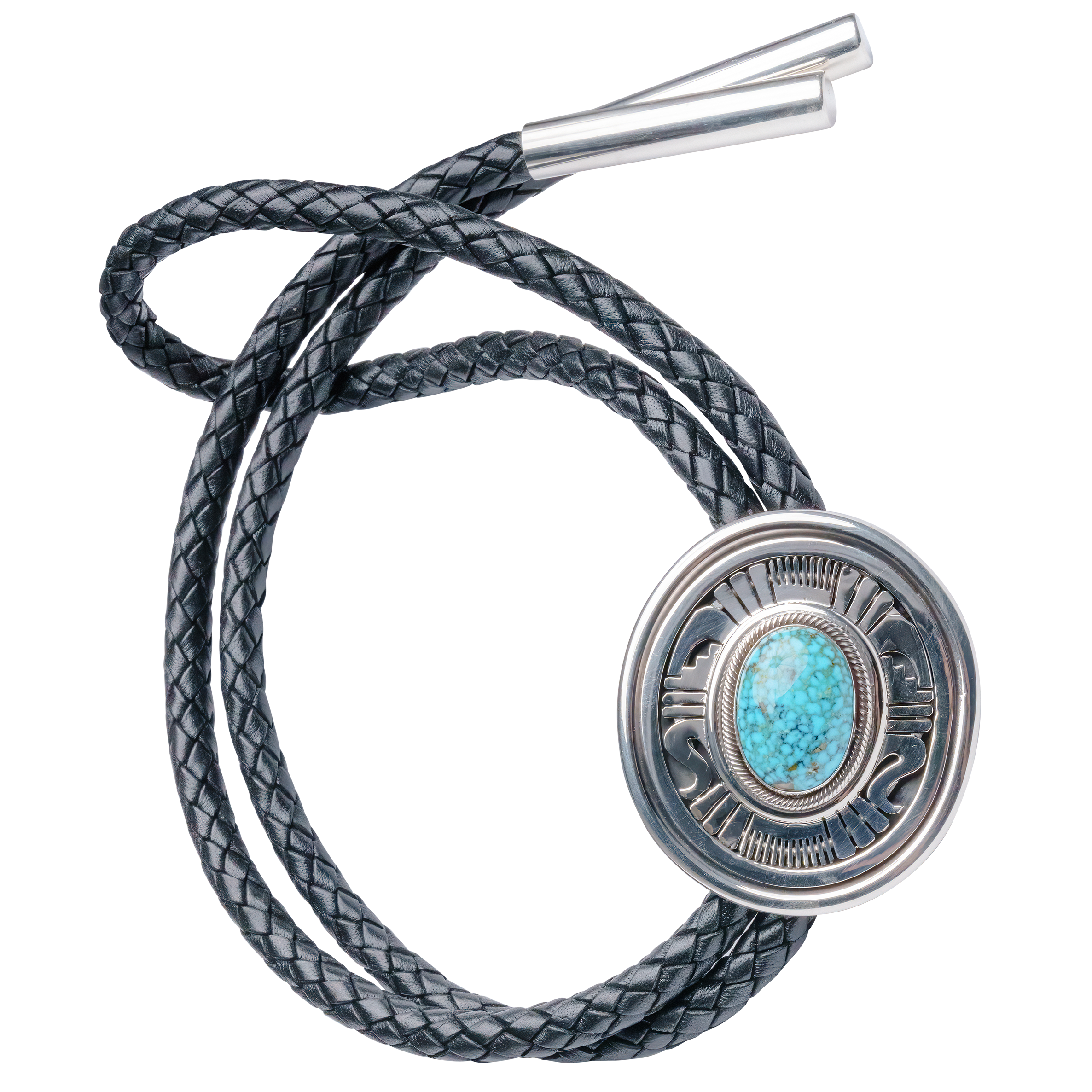 Elevate your style with a touch of Southwestern elegance through this black leather bolo tie, adorned with a detailed sterling silver slide and a captivating Birdseye Kingman turquoise stone, meticulously crafted by Navajo jeweler Leonard Nez. The unique blend of textured leather, polished silver, and distinctive Birdseye Kingman turquoise creates a wearable work of art that captures the essence of tradition and modern sophistication.
