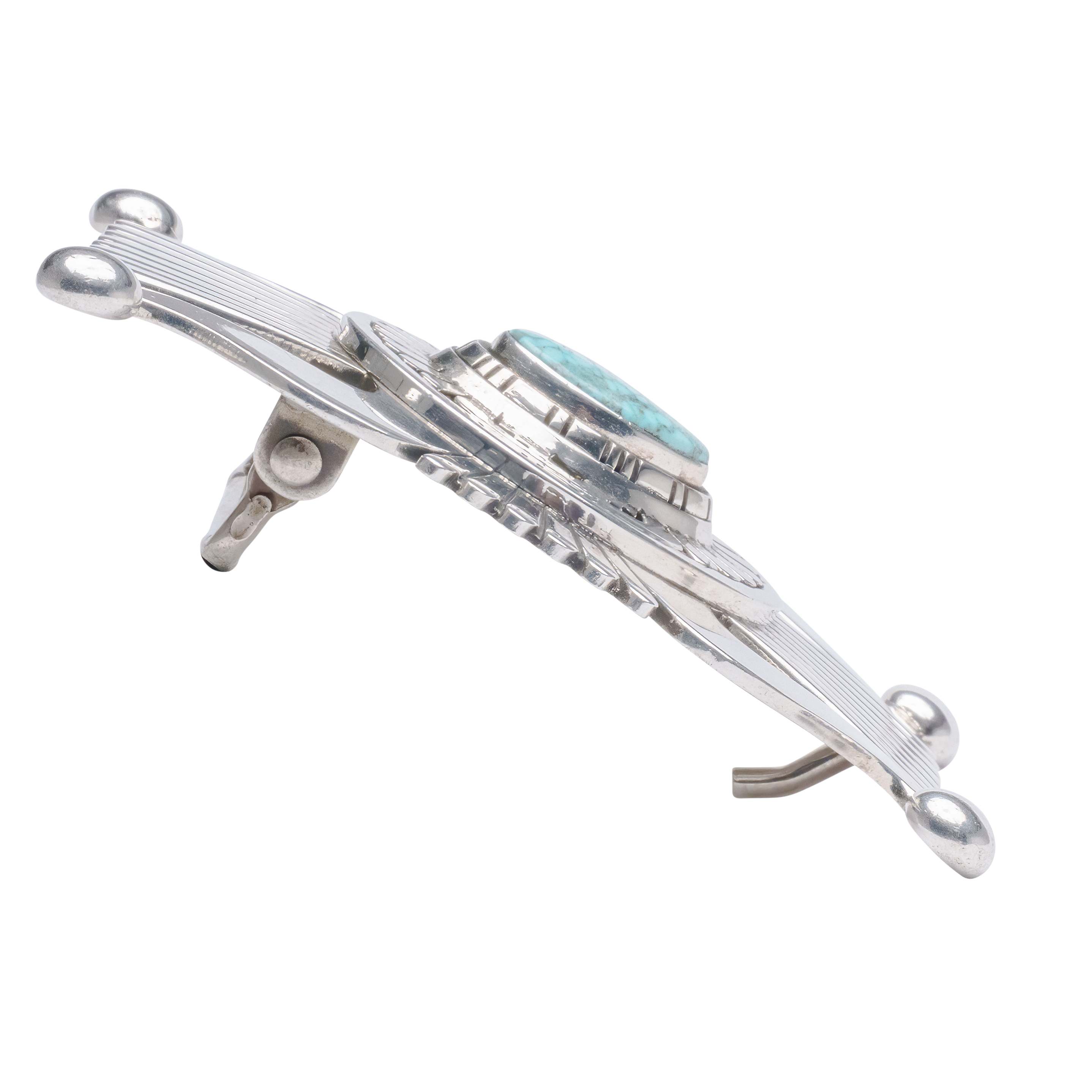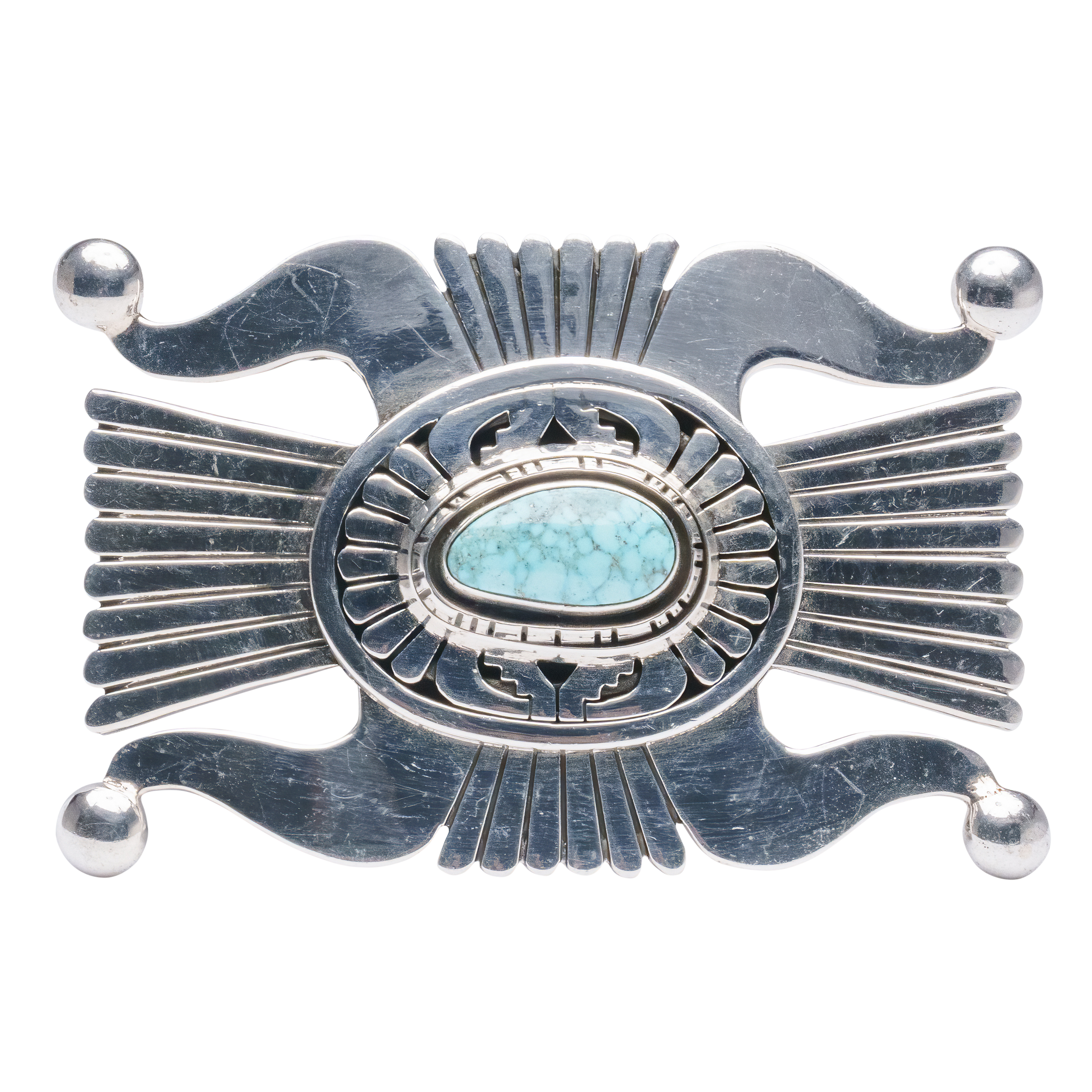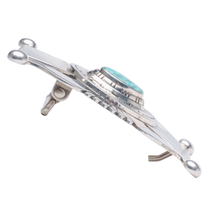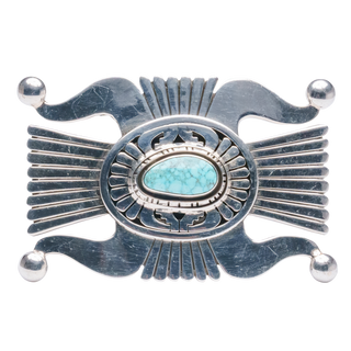 Discover the pinnacle of artistry with this sterling silver overlay belt buckle, a masterpiece meticulously handcrafted by Navajo silversmith Leonard Nez. The focal point of this exquisite piece is a particularly beautiful Birdseye Kingman gemstone, framed by an intricate sterling silver overlay design.