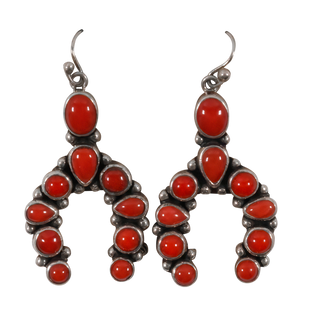 Step into a world of timeless beauty and Southwest-inspired elegance with these stunning coral dangle earrings by Navajo jeweler Bernyse Chavez. These exquisite earrings feature a horseshoe design adorned with vibrant coral gemstones. Each stone is meticulously selected and expertly shaped, showcasing its rich red hues and organic beauty. These coral dangle earrings are a versatile accessory, perfect for both special occasions and everyday wear.