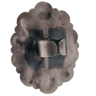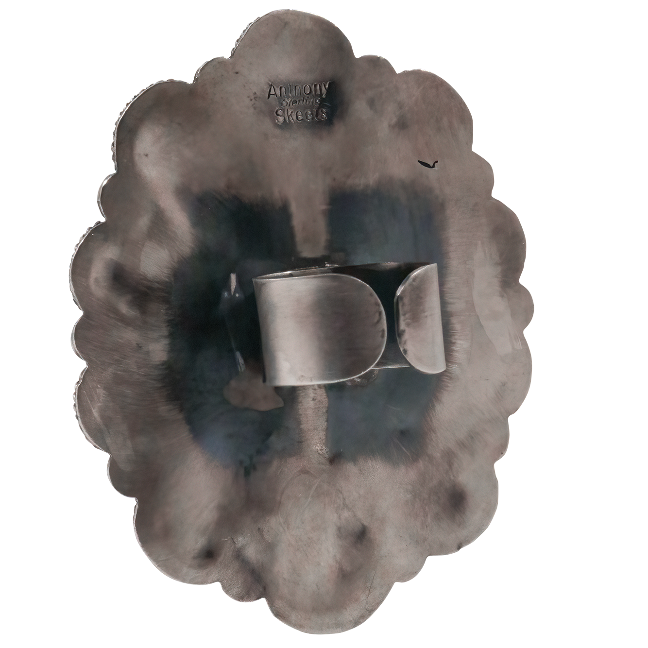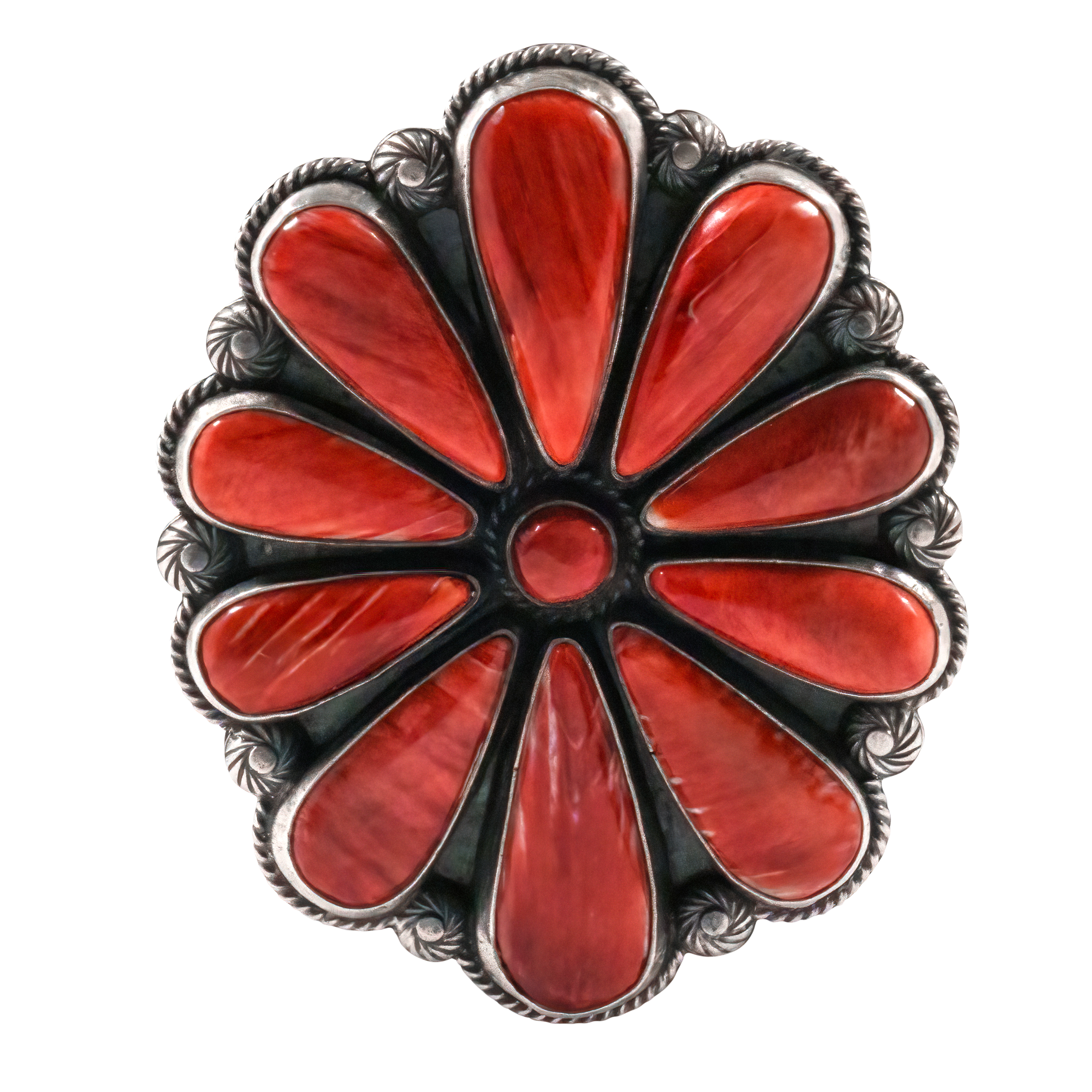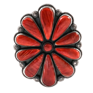 This spectacular statement ring showcases a stunning design adorned with eleven vibrant spiny oyster shell stones, reflecting the rich colors of the Southwest. Created by Navajo jeweler Anthony Skeets. Each spiny oyster stone featured in this masterpiece is carefully hand-selected, showcasing a brilliant fusion of warm hues. Ranging from deep red to vibrant coral, these stones add a bold and captivating touch.