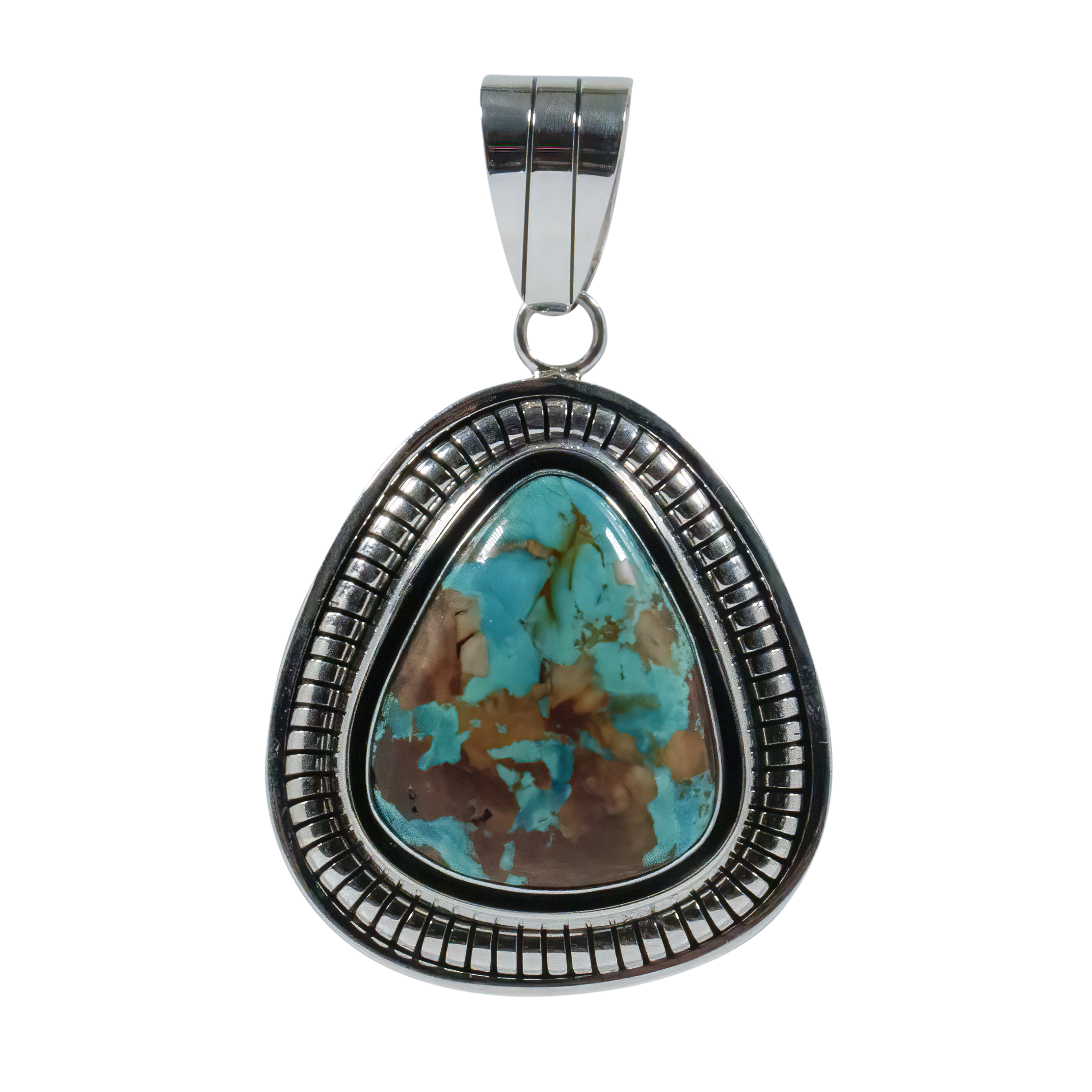 This remarkable pendant showcases a harmonious blend of polished sterling silver and the mesmerizing beauty of turquoise, resulting in a piece that exudes both elegance and natural allure.