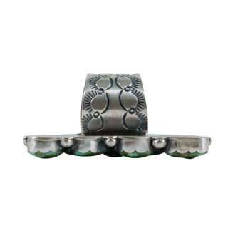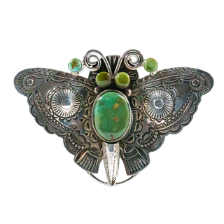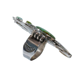 Yaqui/Spanish jeweler Art Tafoya creates a striking piece that combines nature-inspired beauty with artistic craftsmanship in this butterfly statement ring. Lovely Royston turquoise gemstones beautifully accent intricate hand stamped patterns on the butterfly’s wings. Delicate sterling silver filigree is used to form the antennae of this one of a kind ring.