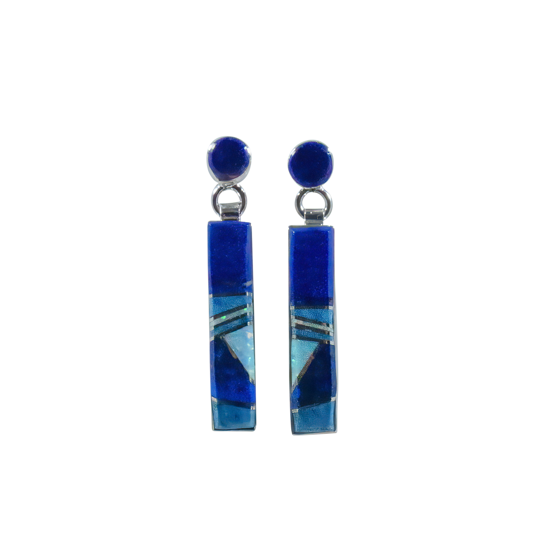 These sophisticated earrings by Navajo jeweler Terry Charley feature a meticulous geometric inlay design incorporating both lapis lazuli and opal gemstones. The deep cobalt of lapis harmonizes beautifully with iridescent opal and sterling silver, making these earrings a truly gorgeous accessory.