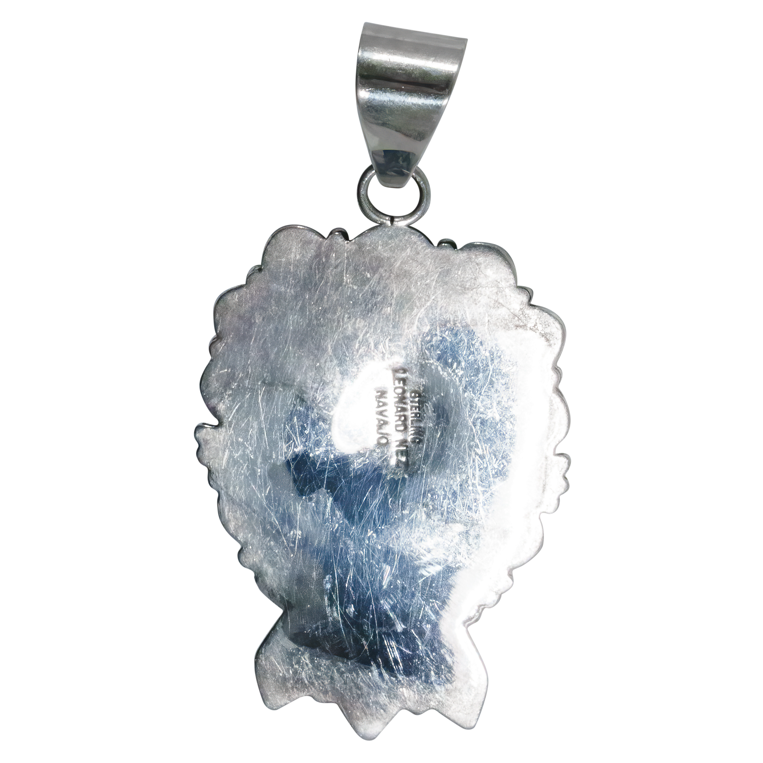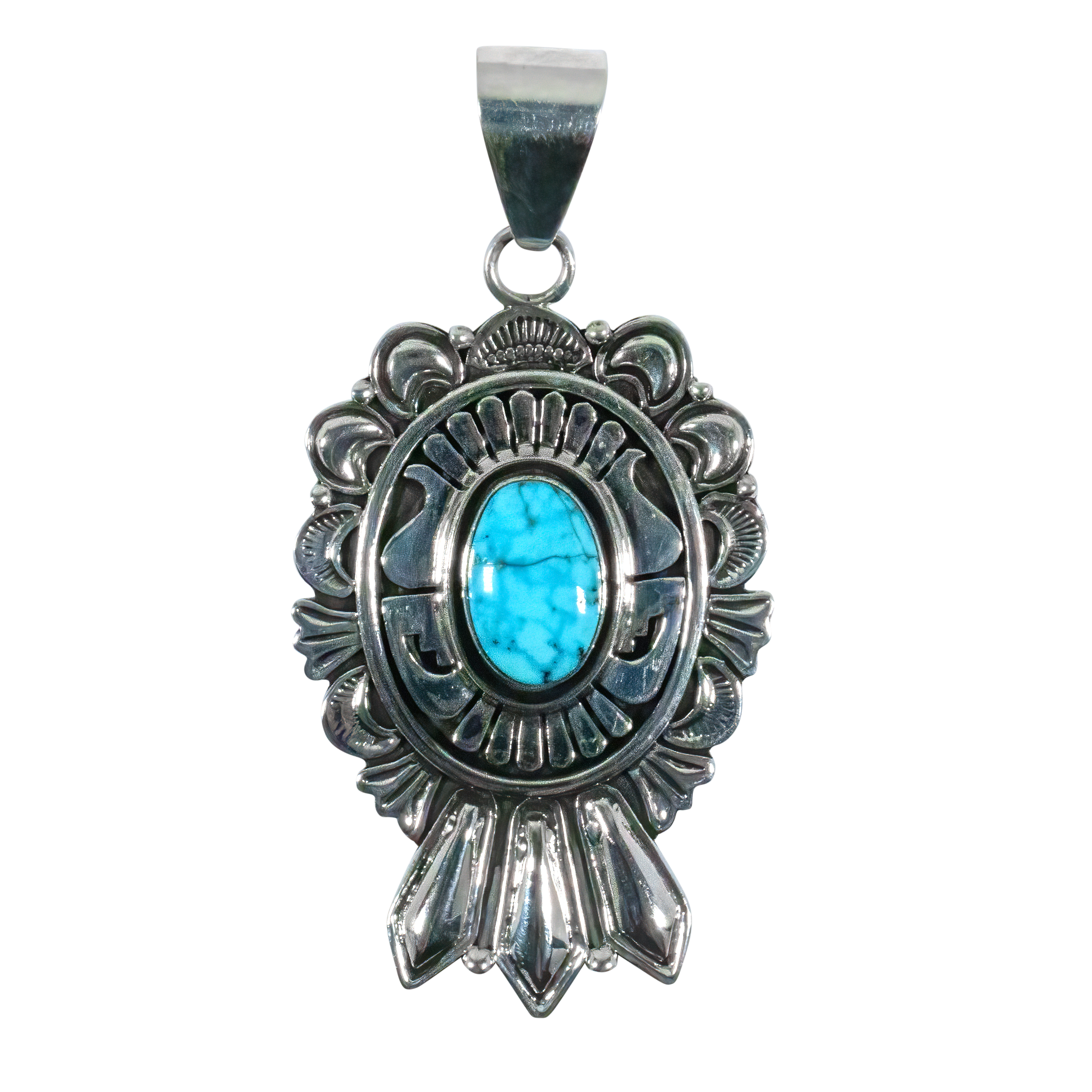 Extraordinary silverwork defines this eye-catching pendant crafted by acclaimed Navajo jeweler Leonard Nez. Intricate overlay designs reminiscent of traditional Native American motifs make this pendant a true work of art while a single oblong Birdseye Kingman turquoise gemstone centers the design.