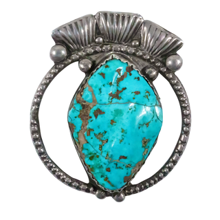 Capture the spirit of the Southwest with this exquisite pin handcrafted by Navajo silversmith John Hoskie. This lovely pin showcases a stunning Blue Gem turquoise stone, renowned for its vivid blue hue and exceptional quality. Expertly set within a sterling silver naja design, this pin embodies traditional Navajo motifs.