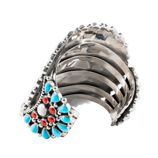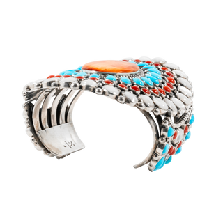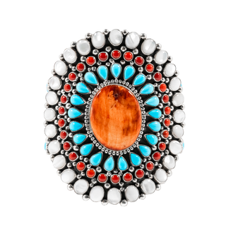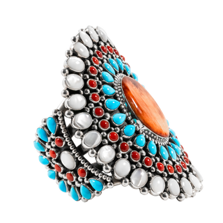 Discover a symphony of colors and textures in this coral, Mother of Pearl, spiny oyster shell, and Sleeping Beauty turquoise cuff by artisans Melvin and Tiffany Jones. Handcrafted with meticulous attention to detail, this cuff is a wearable masterpiece that showcases the natural beauty of each gemstone. With its vibrant coral, iridescent Mother of Pearl, vibrant spiny oyster shell, and serene Sleeping Beauty turquoise, this cuff becomes a stunning reflection of Southwest artistry and the collaboration between two skilled artisans.